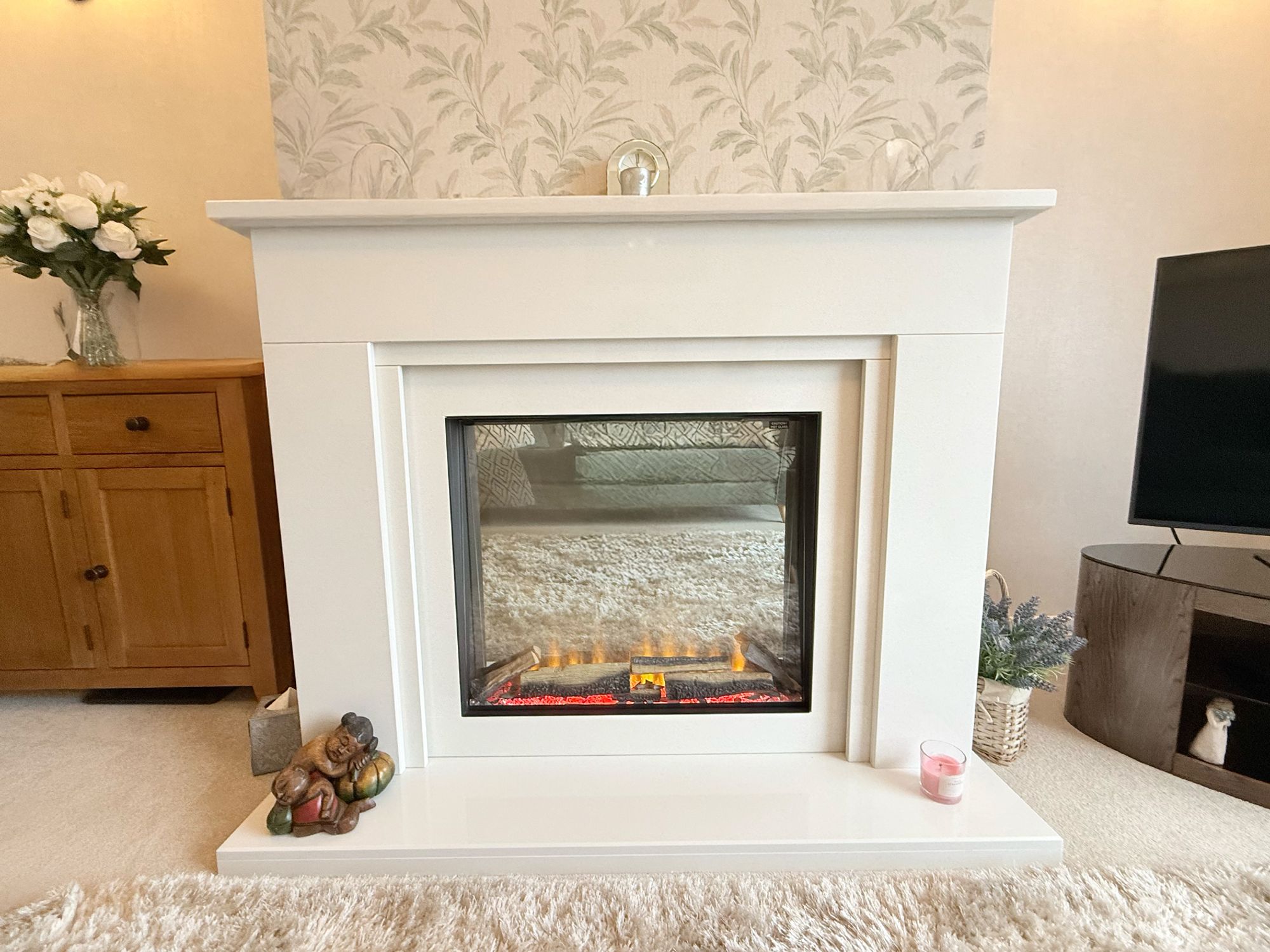 A spacious lounge positioned to the front of the property, featuring a modern electric wood-effect fireplace with a white surround, set against a striking wallpapered chimney breast. Neutrally decorated and finished with plush carpeting, the room offers a warm yet contemporary feel. A large front-facing window floods the space with natural light, creating a bright and airy atmosphere, while ample room allows for a variety of family seating arrangements.