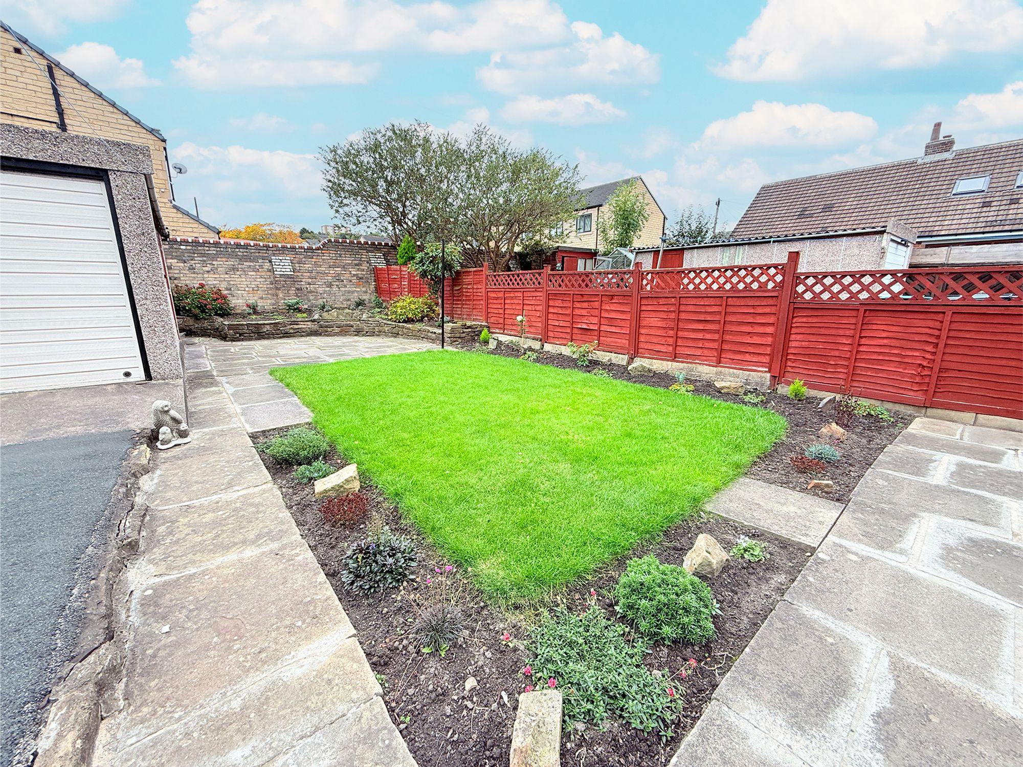 A large and well-maintained front garden, laid to lawn with neatly presented plant beds and a stone-flagged patio area. The space not only adds to the property’s kerb appeal but also offers potential to create further off-road parking if desired.