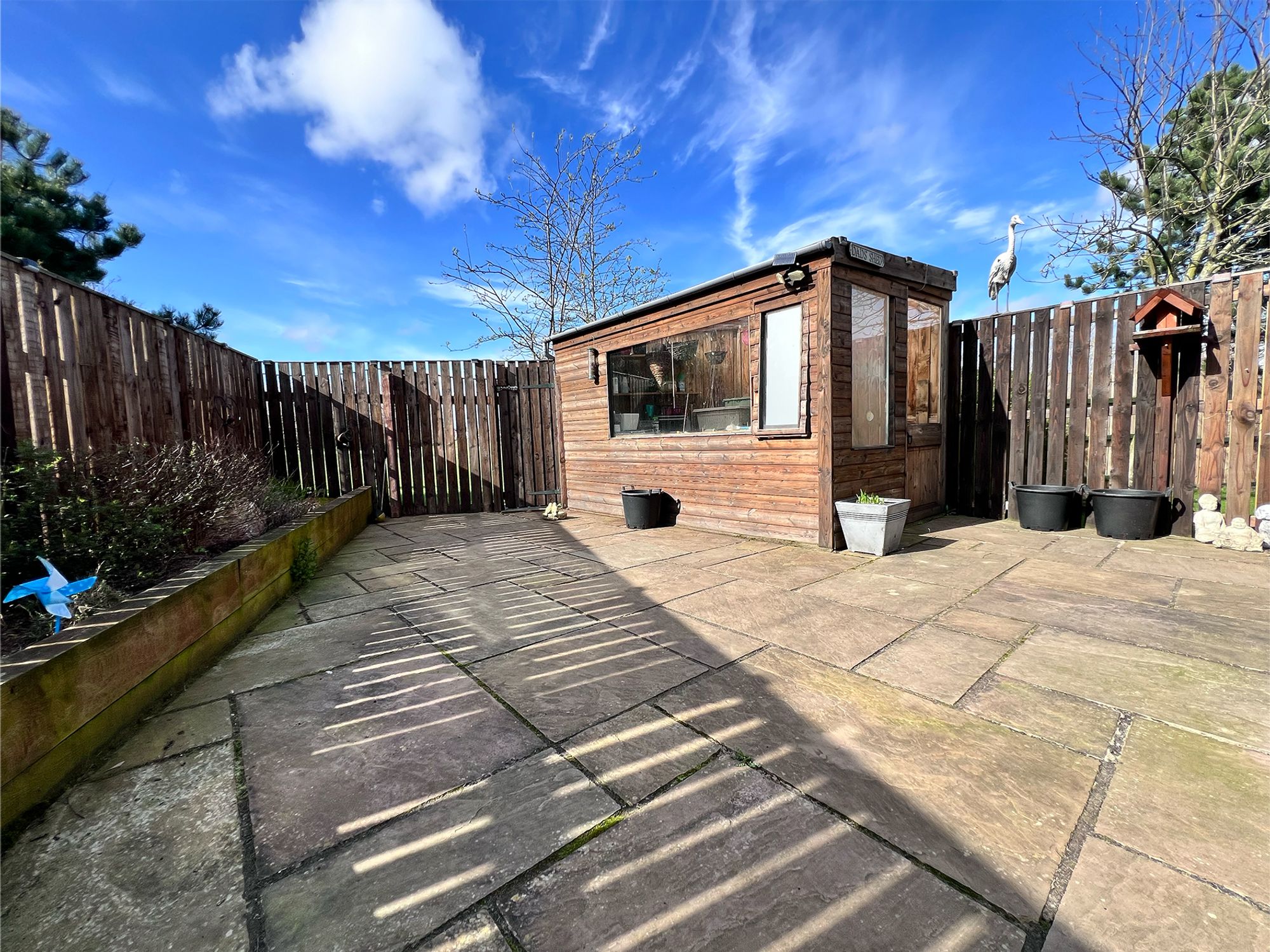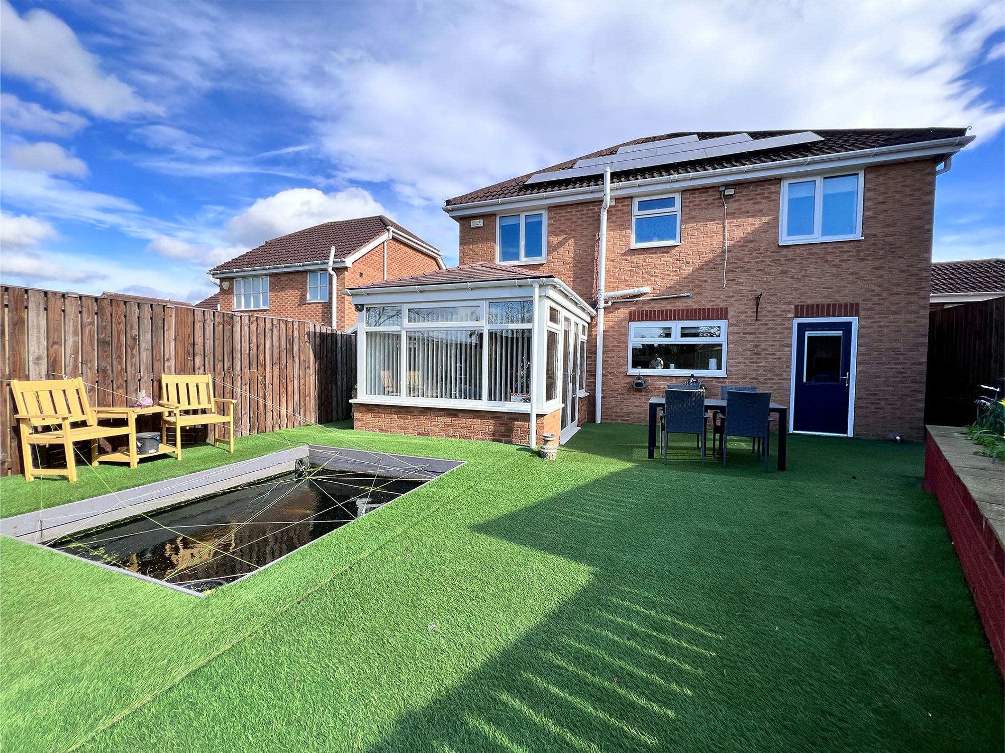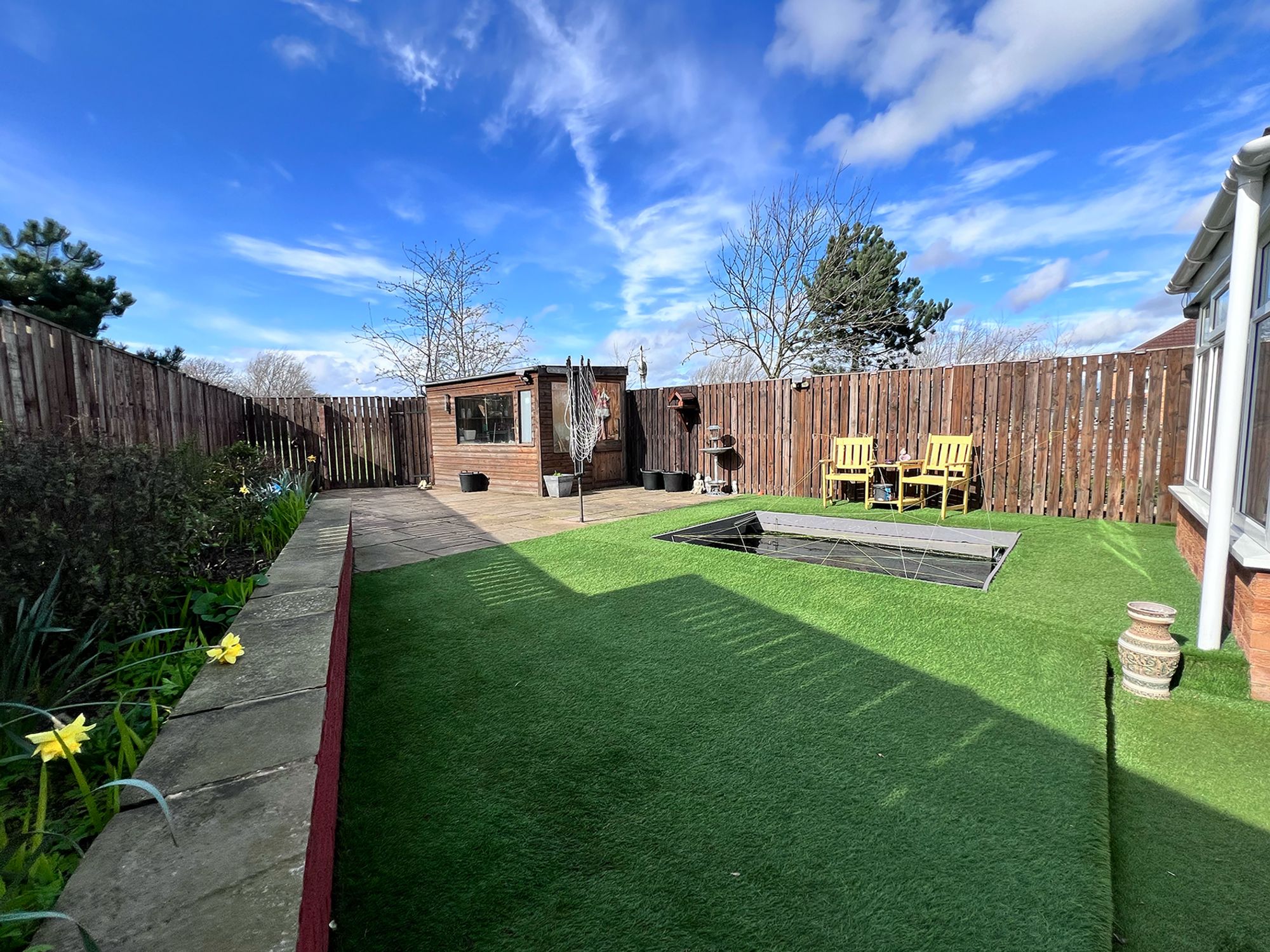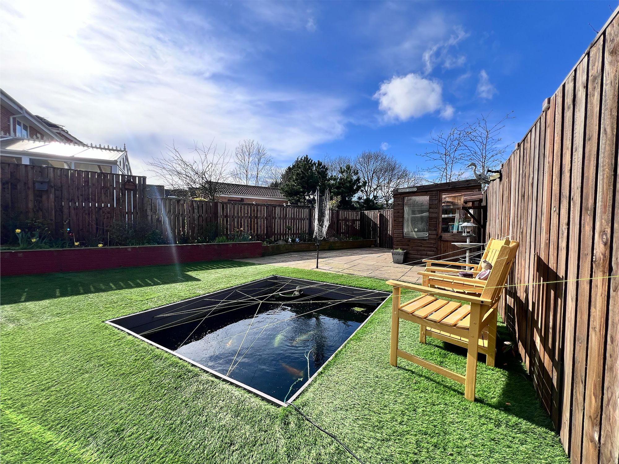 To the front of the property, a block-paved driveway provides off-road parking for numerous vehicles, offering both practicality and convenience. In addition, there is a detached one-and-a-half size garage, benefiting from a power supply, making it ideal for secure parking, storage or workshop use. The garden is fully enclosed, creating a safe and private environment ideal for both children and pets. Designed for ease of maintenance, it features AstroTurf and a patio area, perfect for outdoor seating and alfresco dining. A charming fish pond adds a tranquil focal point, while a gate provides direct access onto the adjoining sports field. The garden also benefits from a useful shed, offering additional storage for outdoor equipment.