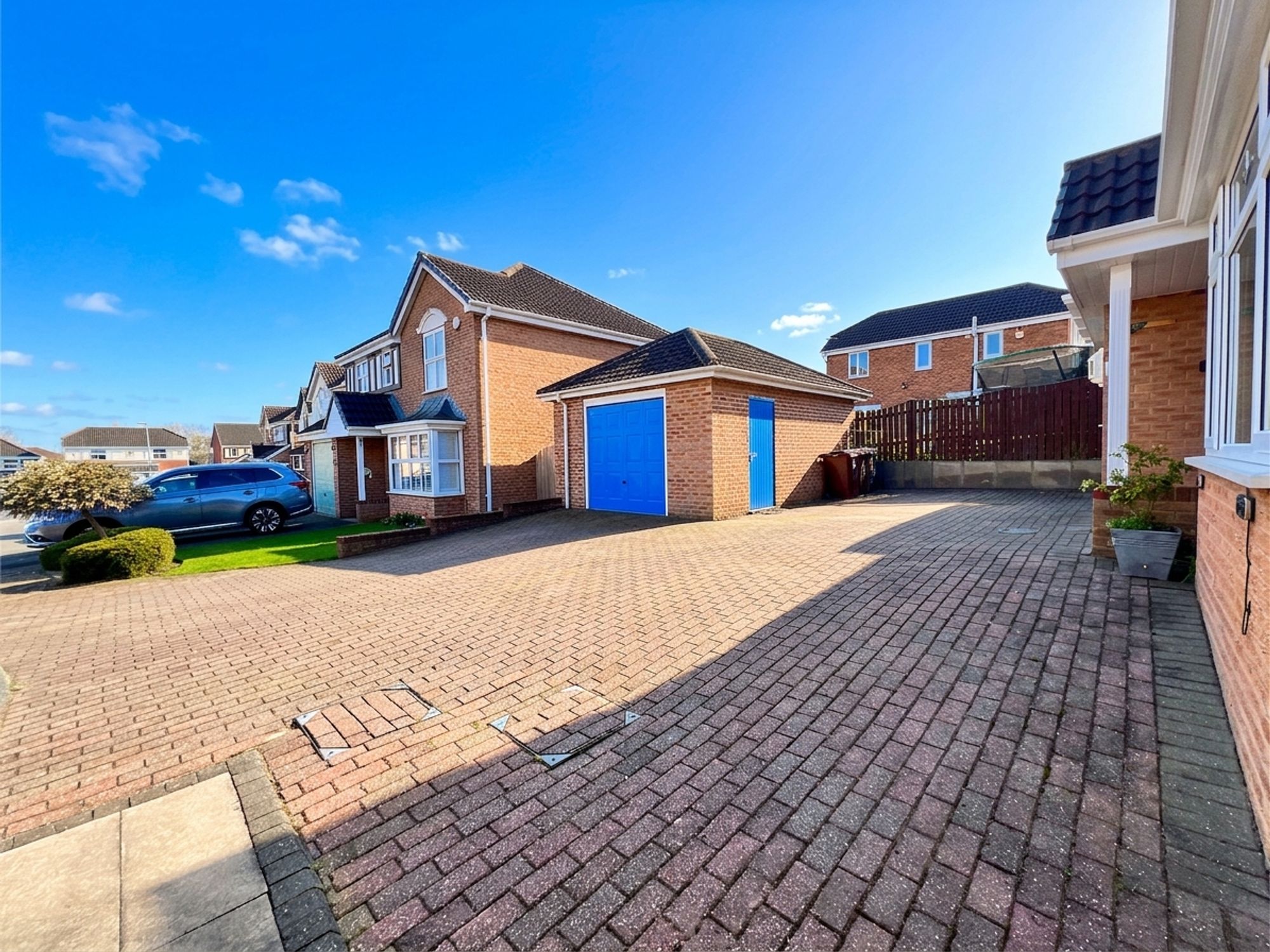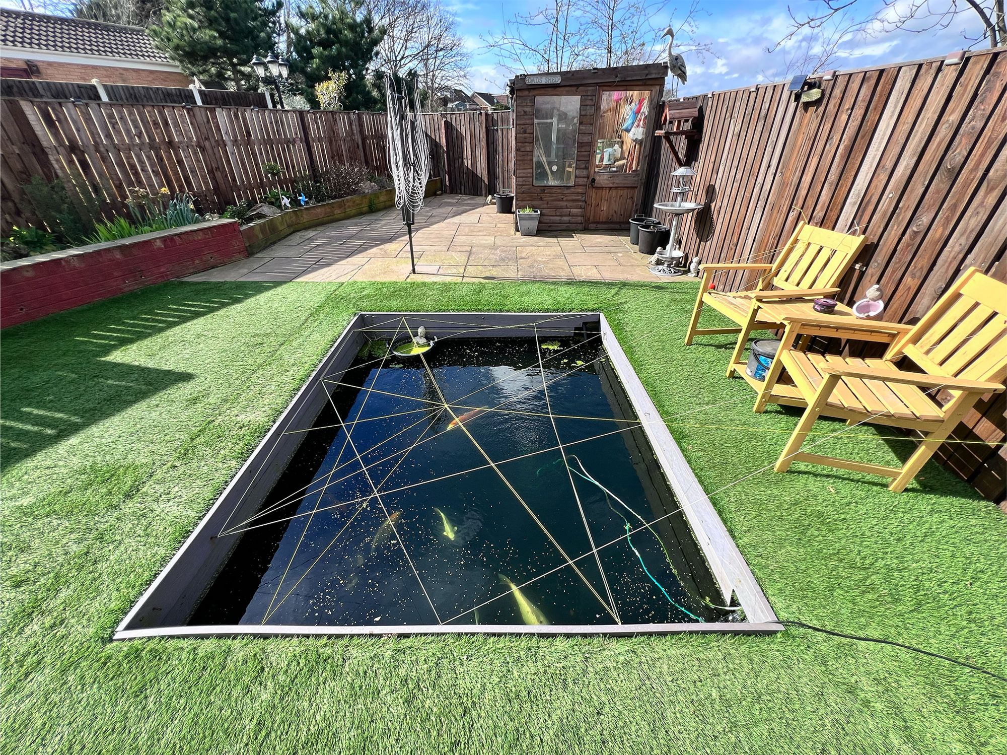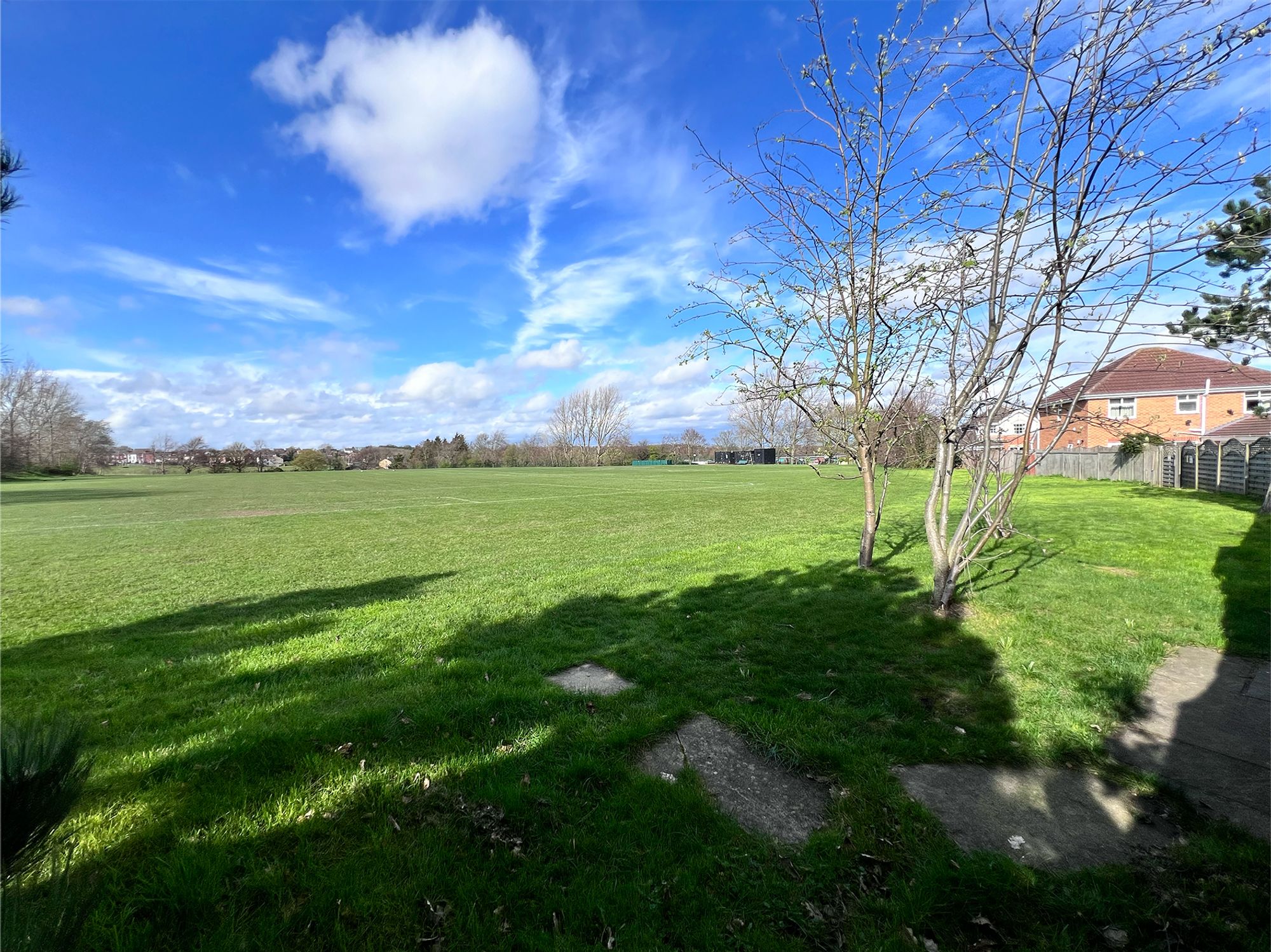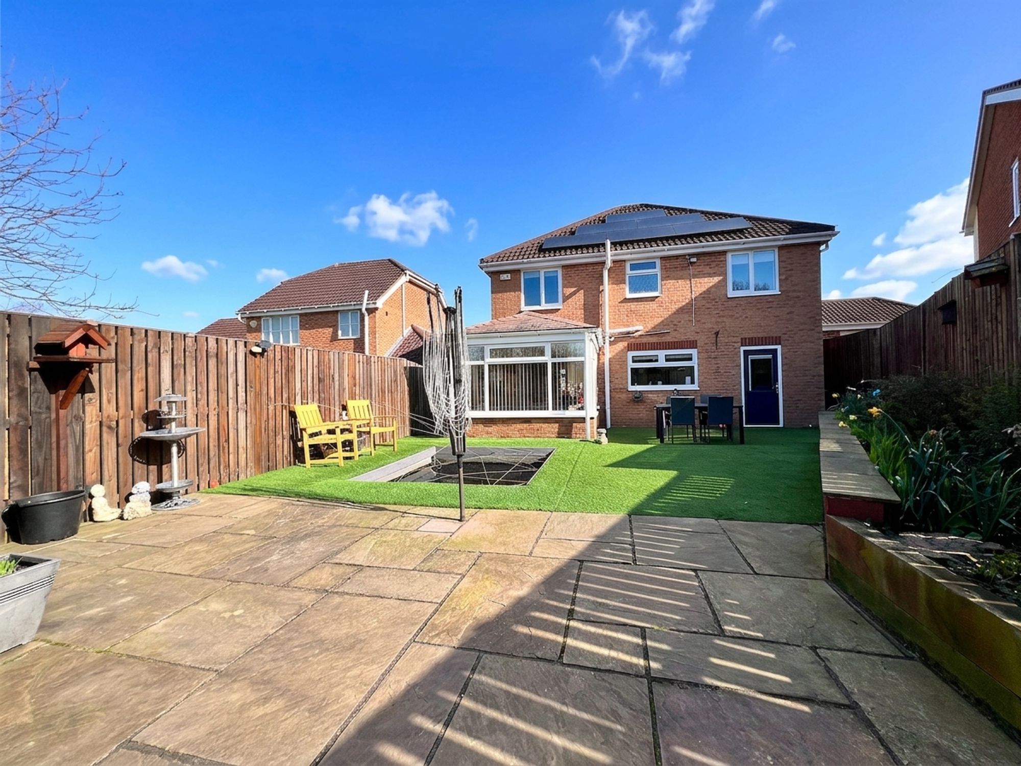 To the front of the property, a block-paved driveway provides off-road parking for numerous vehicles, offering both practicality and convenience. In addition, there is a detached one-and-a-half size garage, benefiting from a power supply, making it ideal for secure parking, storage or workshop use. The garden is fully enclosed, creating a safe and private environment ideal for both children and pets. Designed for ease of maintenance, it features AstroTurf and a patio area, perfect for outdoor seating and alfresco dining. A charming fish pond adds a tranquil focal point, while a gate provides direct access onto the adjoining sports field. The garden also benefits from a useful shed, offering additional storage for outdoor equipment.