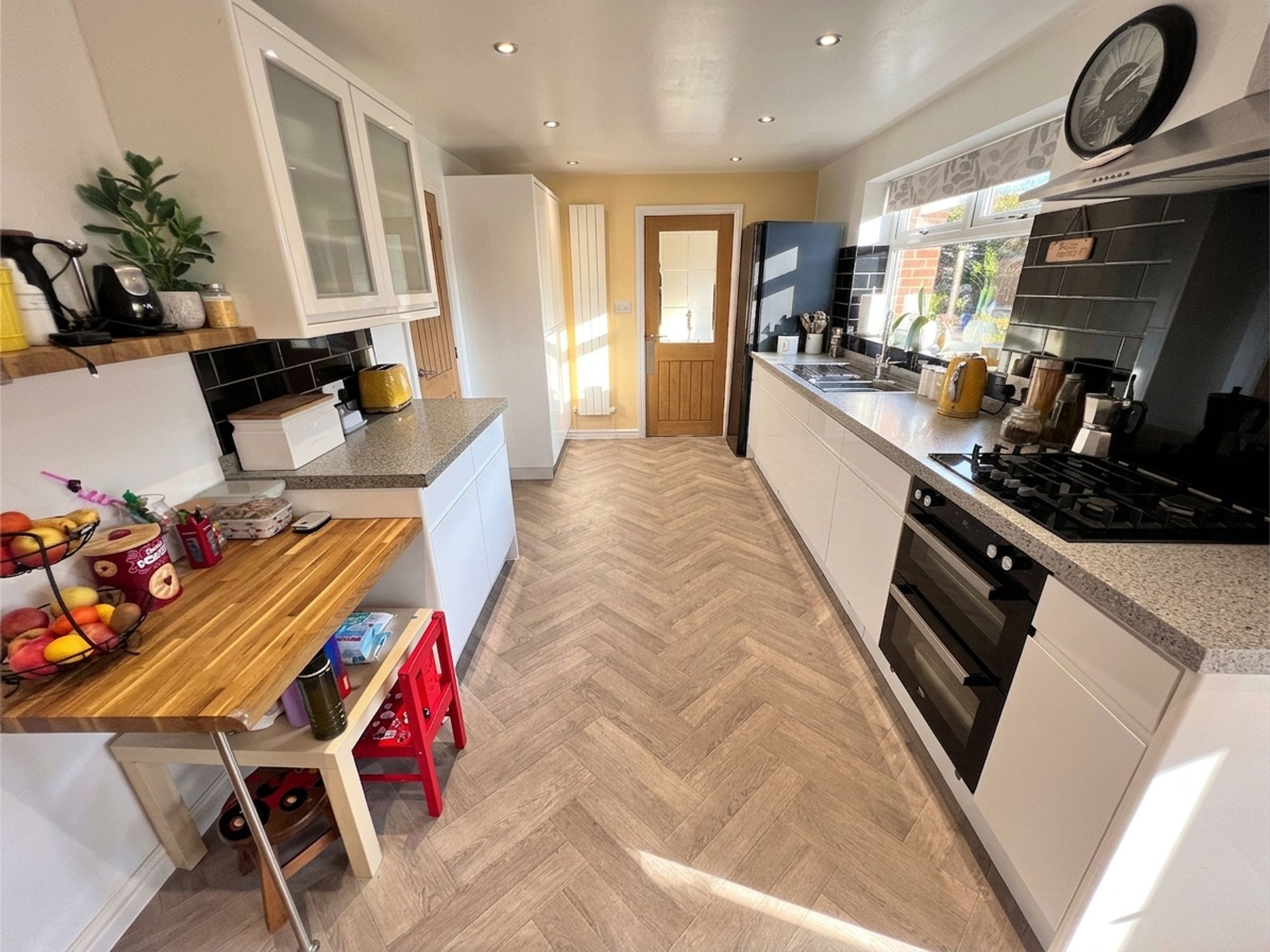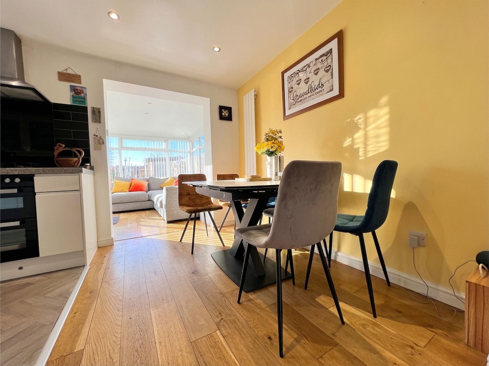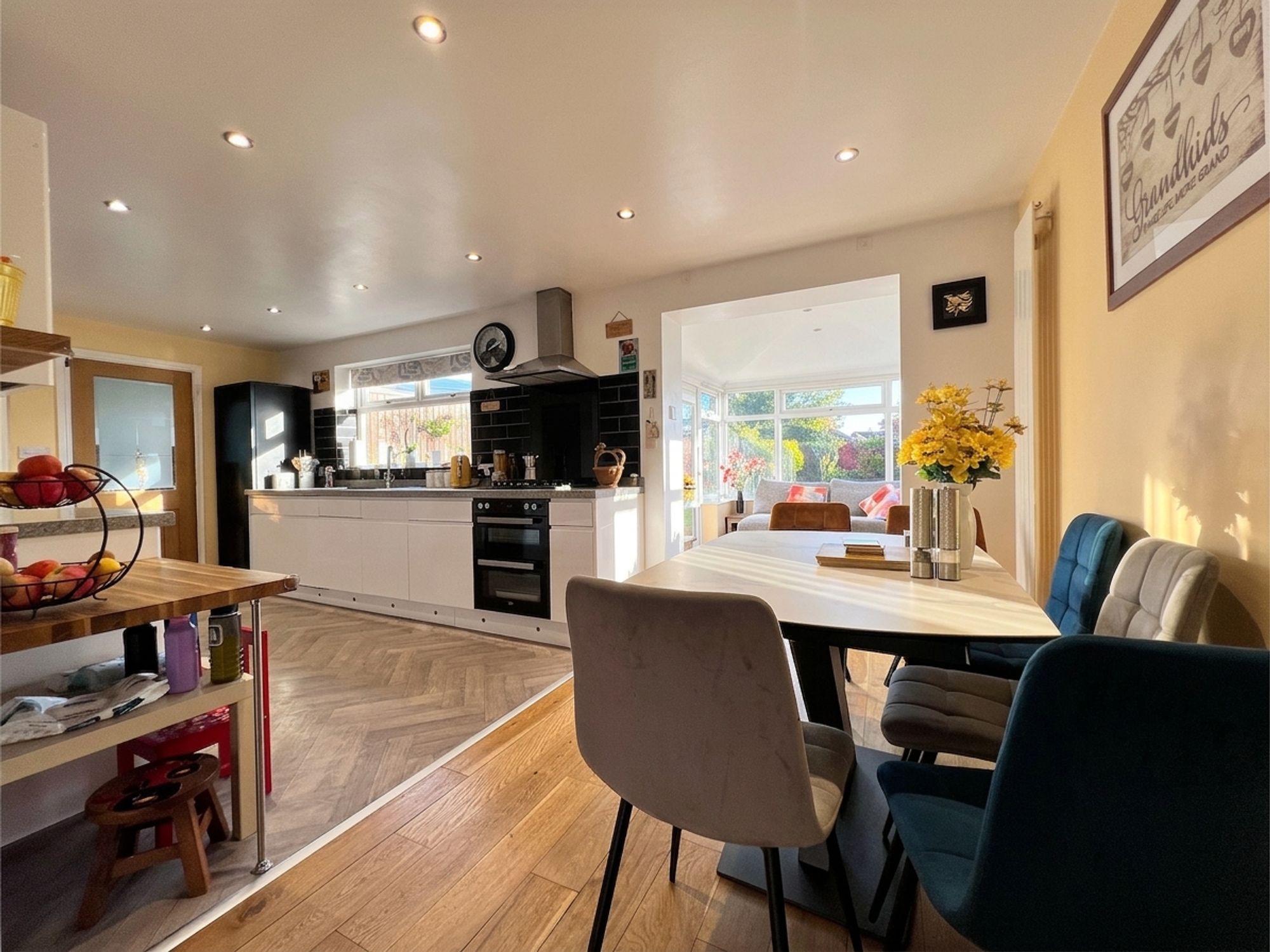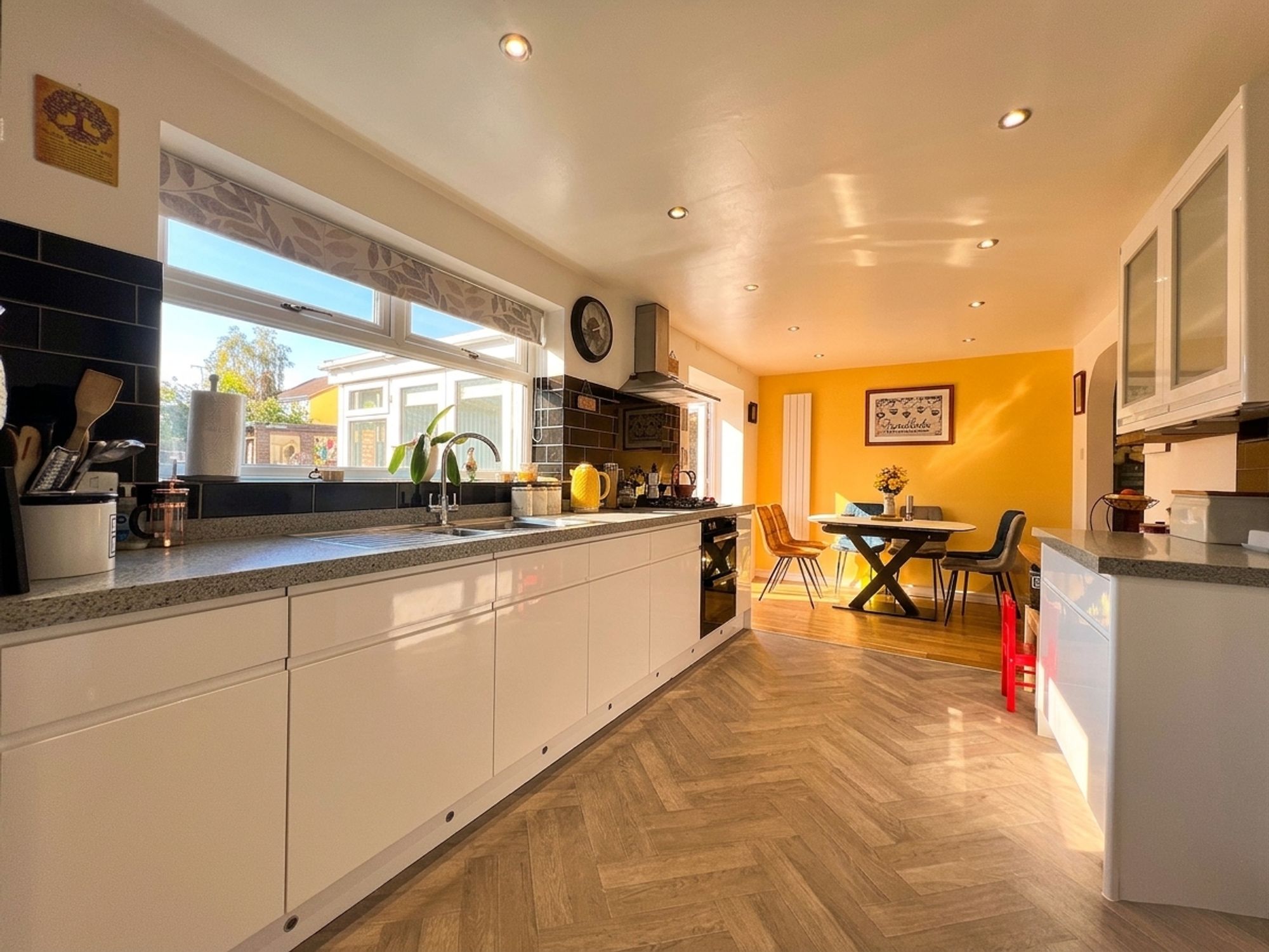 The dining kitchen flows effortlessly from the lounge and into the garden room, creating a wonderfully sociable and inviting space that perfectly embraces modern family living. Bathed in natural light, it offers a seamless setting for both everyday moments and special occasions. The kitchen itself is beautifully appointed with a range of sleek white high-gloss handleless units, complemented by luxurious granite work surfaces and enhanced by subtle ambient lighting. Integrated appliances include an electric oven and grill, four-ring gas hob and dishwasher, along with space for a freestanding fridge freezer. A stainless steel sink with mixer tap is perfectly positioned beneath a large window, framing delightful views over the landscaped rear garden. The dining area comfortably accommodates a family-sized dining suite, creating a charming space to gather, dine and enjoy time together while overlooking the garden beyond.