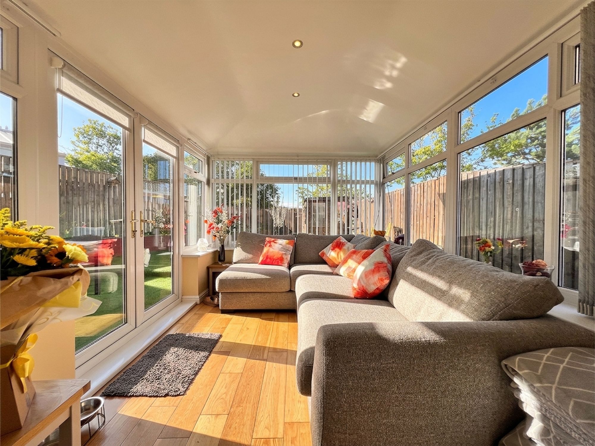 Open plan to the dining kitchen, the garden room is a superb addition, enhanced by electric underfloor heating and a solid roof, allowing it to be enjoyed comfortably throughout the year. Bright and inviting, this versatile space creates a seamless connection between indoors and out, with patio doors opening onto the beautifully landscaped rear garden, allowing entertaining to effortlessly spill outdoors.