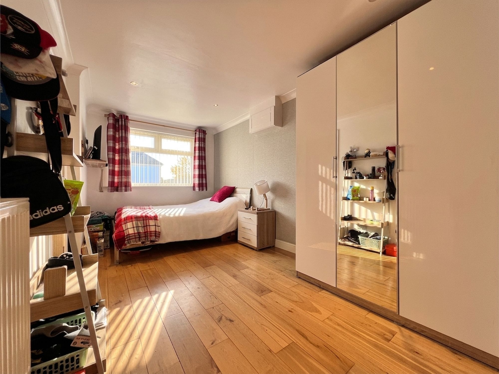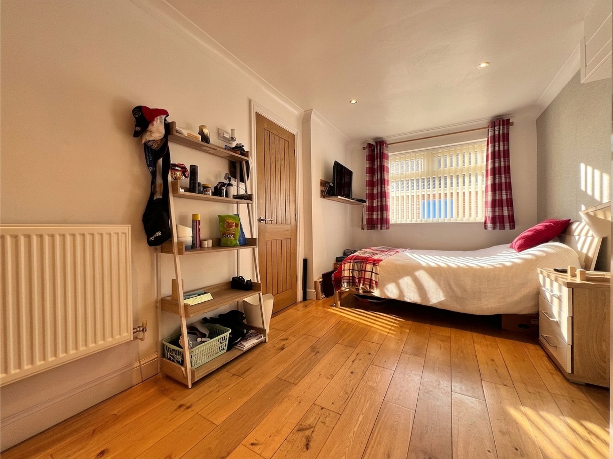 Formerly the integral garage, the current owner has undertaken a remarkable conversion to create a spacious double bedroom complete with en-suite facilities. Beautifully presented in neutral tones with wood-effect laminate flooring, the room offers ample space for a variety of freestanding furniture. Thoughtfully designed, this versatile space lends itself to a range of uses, whether as a comfortable double bedroom or guest suite, accommodation for a dependent relative, or a dedicated home office easily adapting to suit the needs of the purchaser.