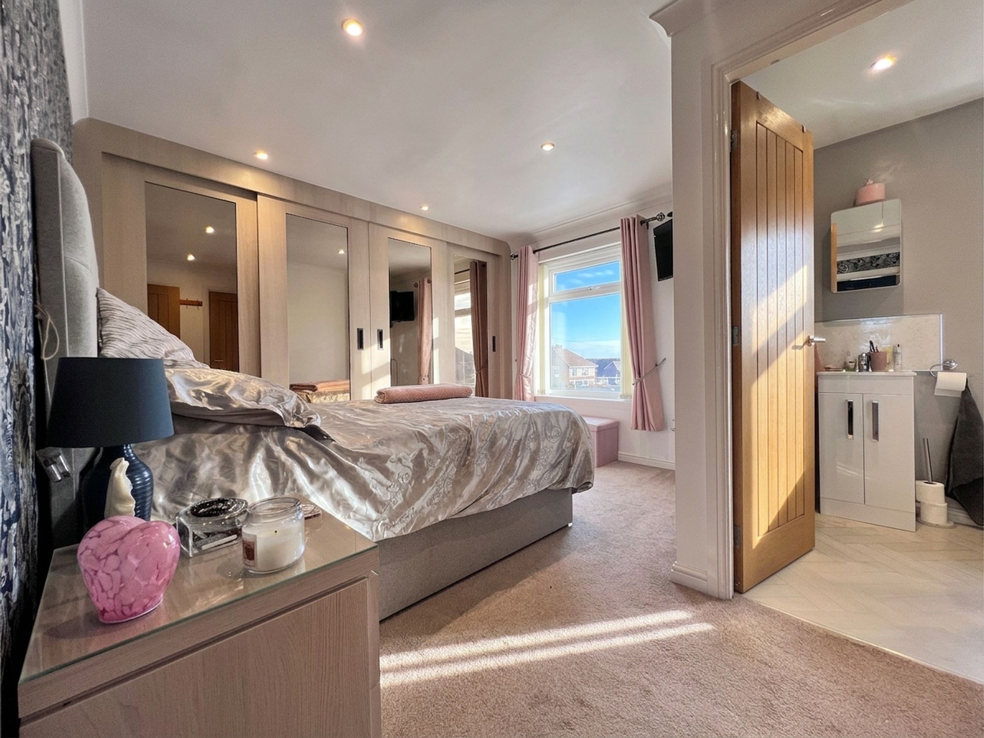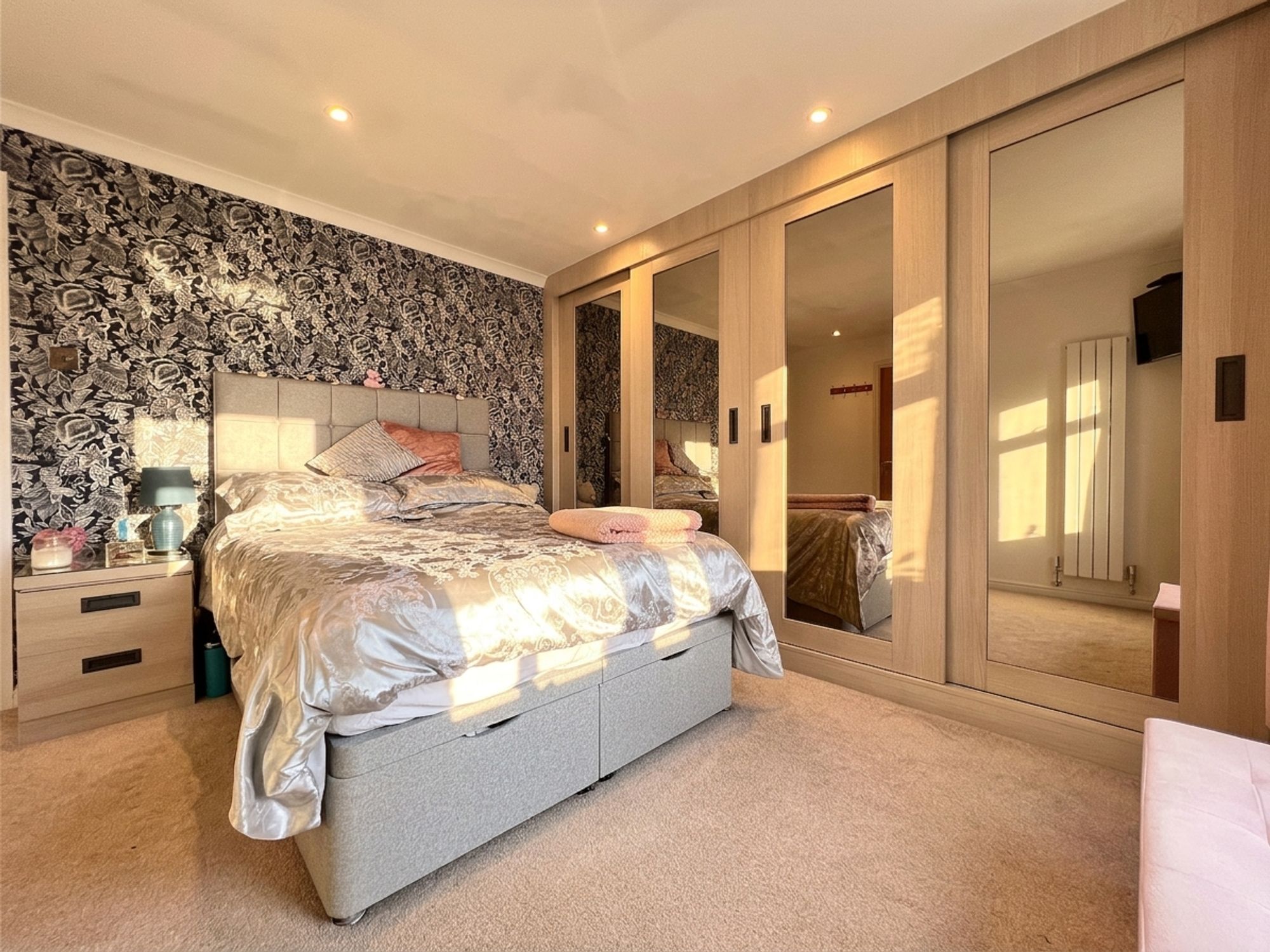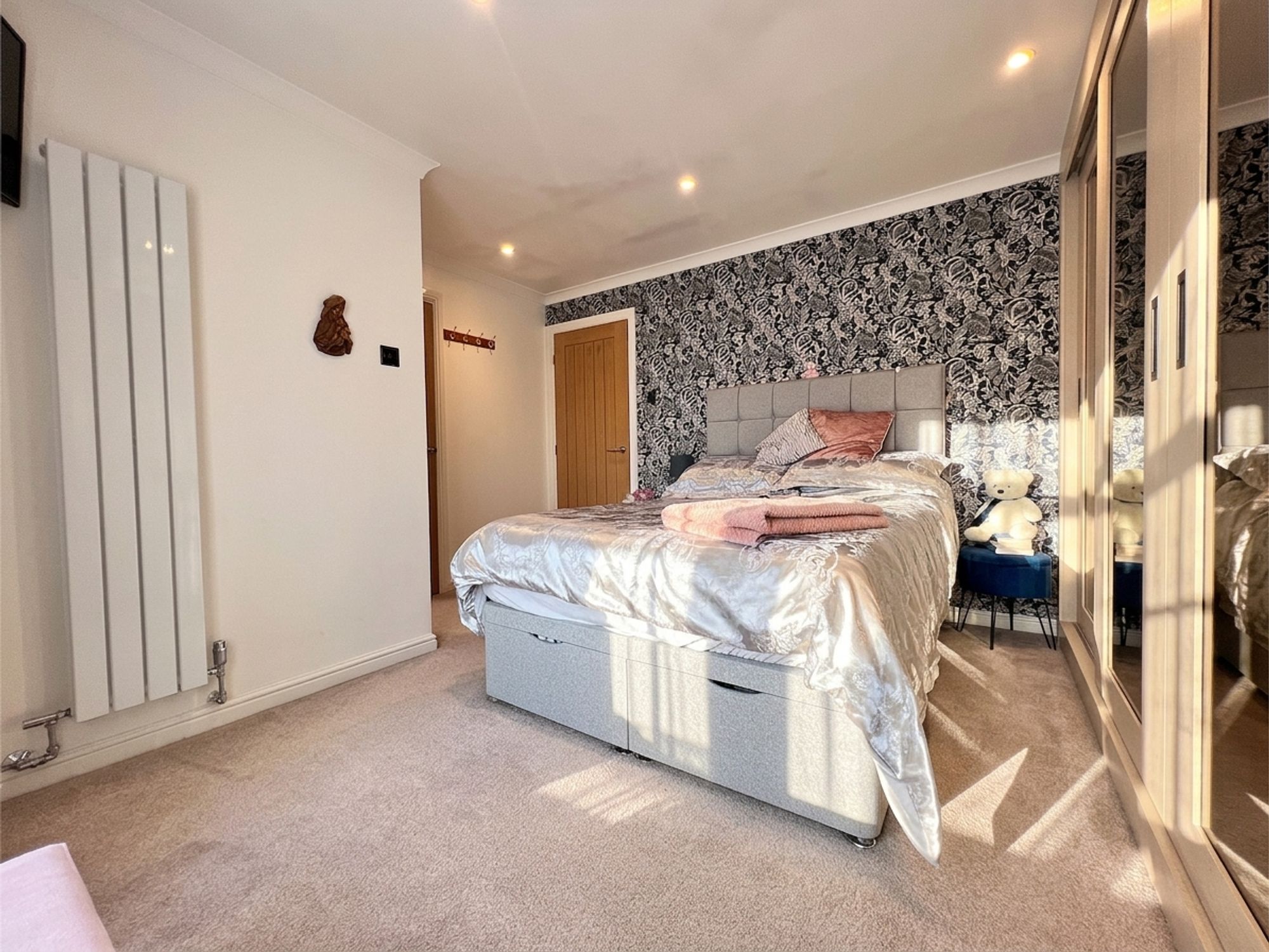 A fantastic sized master bedroom positioned to the front of the property, beautifully decorated in neutral tones and enhanced by a striking feature wallpapered wall. The room benefits from a full bank of stylish modern wardrobes with mirrored glass inserts, providing excellent storage while reflecting light to enhance the sense of space. A door also leads to the airing cupboard, offering further practical storage.