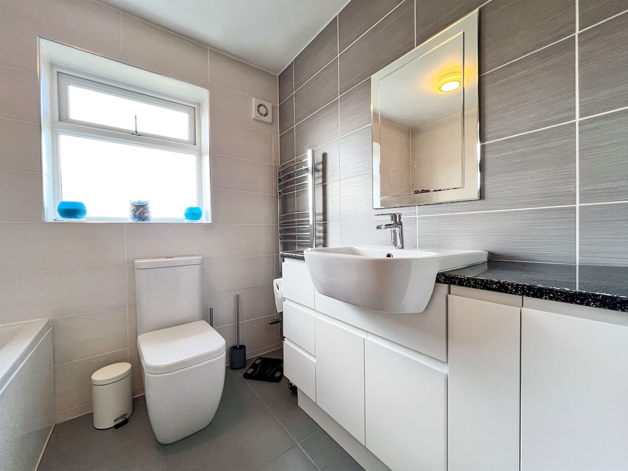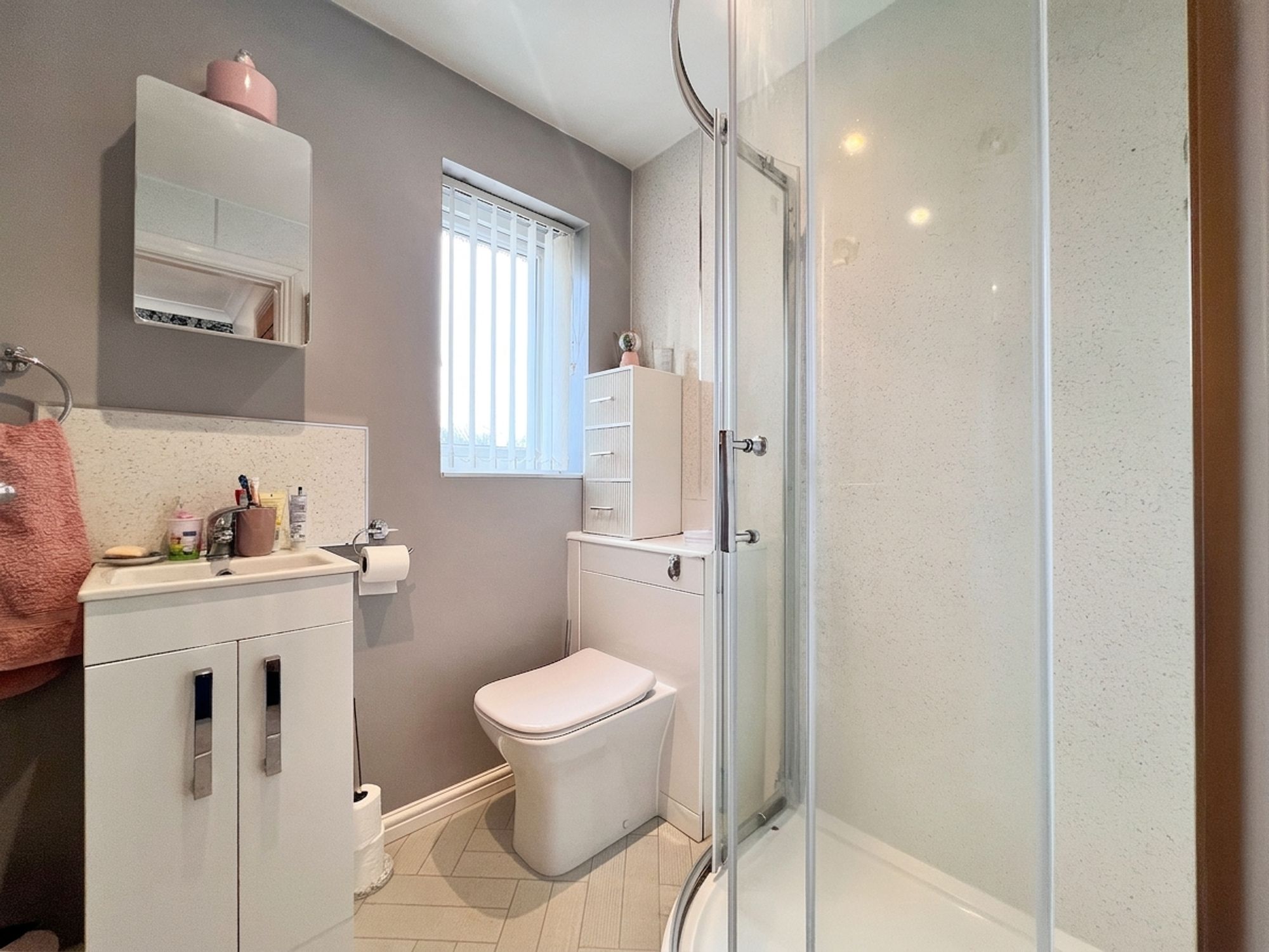 The house bathroom is stylishly appointed, featuring a full-size bath with rainfall shower over, separate handheld attachment and glass screen, along with a low-level W.C., chrome heated towel rail and a wash basin set within a vanity unit providing valuable storage. The walls and floor are fully tiled in complementary contrasting tones, creating a sleek and contemporary finish.