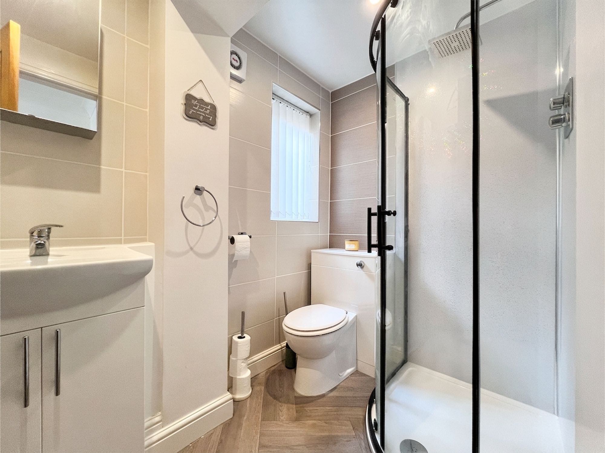 A crisp and contemporary en-suite featuring a curved shower cubicle, wash basin set within a sleek vanity unit and a low-level W.C. The shower area is finished with stylish panels, creating a clean and modern look, while a heated towel rail adds a touch of everyday luxury and comfort.