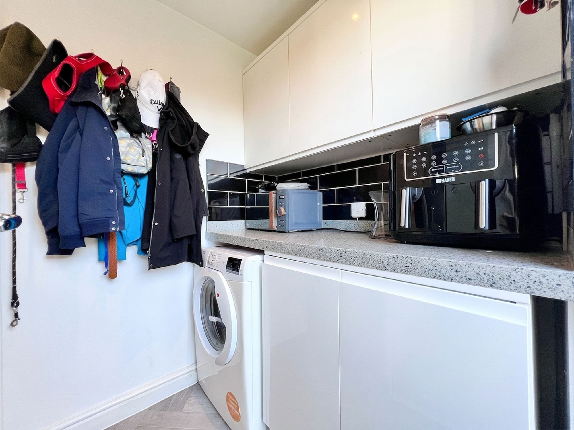 Conveniently positioned just off the dining kitchen, the utility room continues the stylish theme with matching kitchen units and granite work surfaces, creating a seamless and cohesive look. Practical in design, it offers plumbing for a washing machine and provides a useful additional workspace, while a door leads directly outside, adding to the everyday convenience of the home.