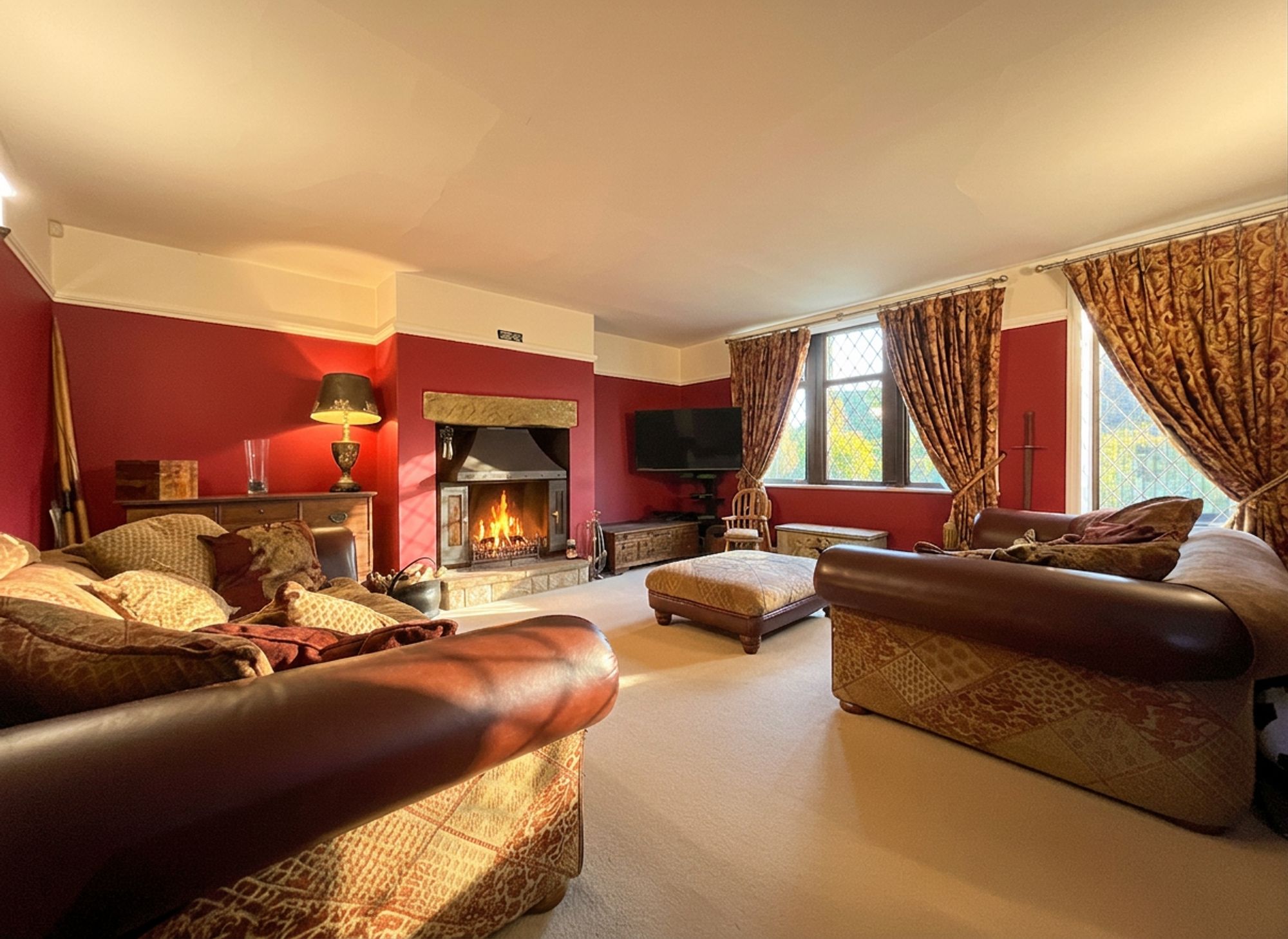An indulgent and elegant lounge flooded with natural light and framing picturesque views over the rear garden, this space is both inviting and serene. Presented in warm, deep tones, the room exudes a rich and cosy ambience. The stunning centrepiece is the impressive original log-burning fire, set on an exposed stone hearth with a charming rustic mantle above. This beautiful feature creates a captivating focal point, perfect for curling up on chilly evenings. The lounge strikes a harmonious balance between elegance and comfort, offering a space ideal for both relaxation and entertaining. Double doors open to reveal the dining room further enhancing the sociable flow of this impressive home.
