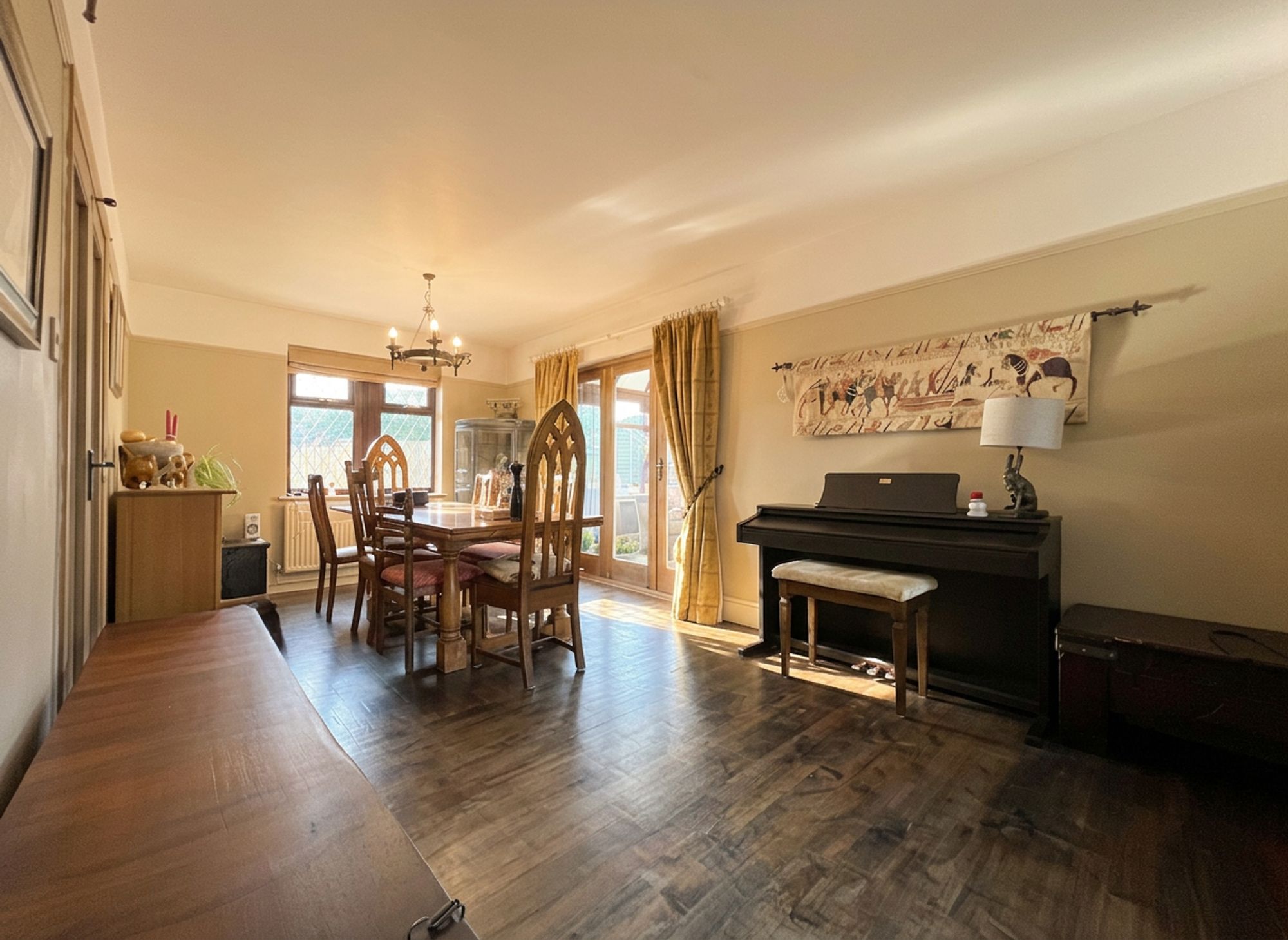 An incredibly sociable and inviting space, the dining room is thoughtfully designed for both everyday family meals and special gatherings. Double doors seamlessly connect to the lounge, creating a wonderful flow throughout the home, while impressive bi-fold doors open into the conservatory, allowing natural light to flood the space and offering a fantastic indoor-outdoor connection. Presented in warm, tasteful hues, the room exudes charm, with solid wood flooring adding character and a timeless touch. There's ample space to accommodate a family-sized dining suite, along with room for additional freestanding furniture, making this a versatile area that can easily adapt to your lifestyle needs.