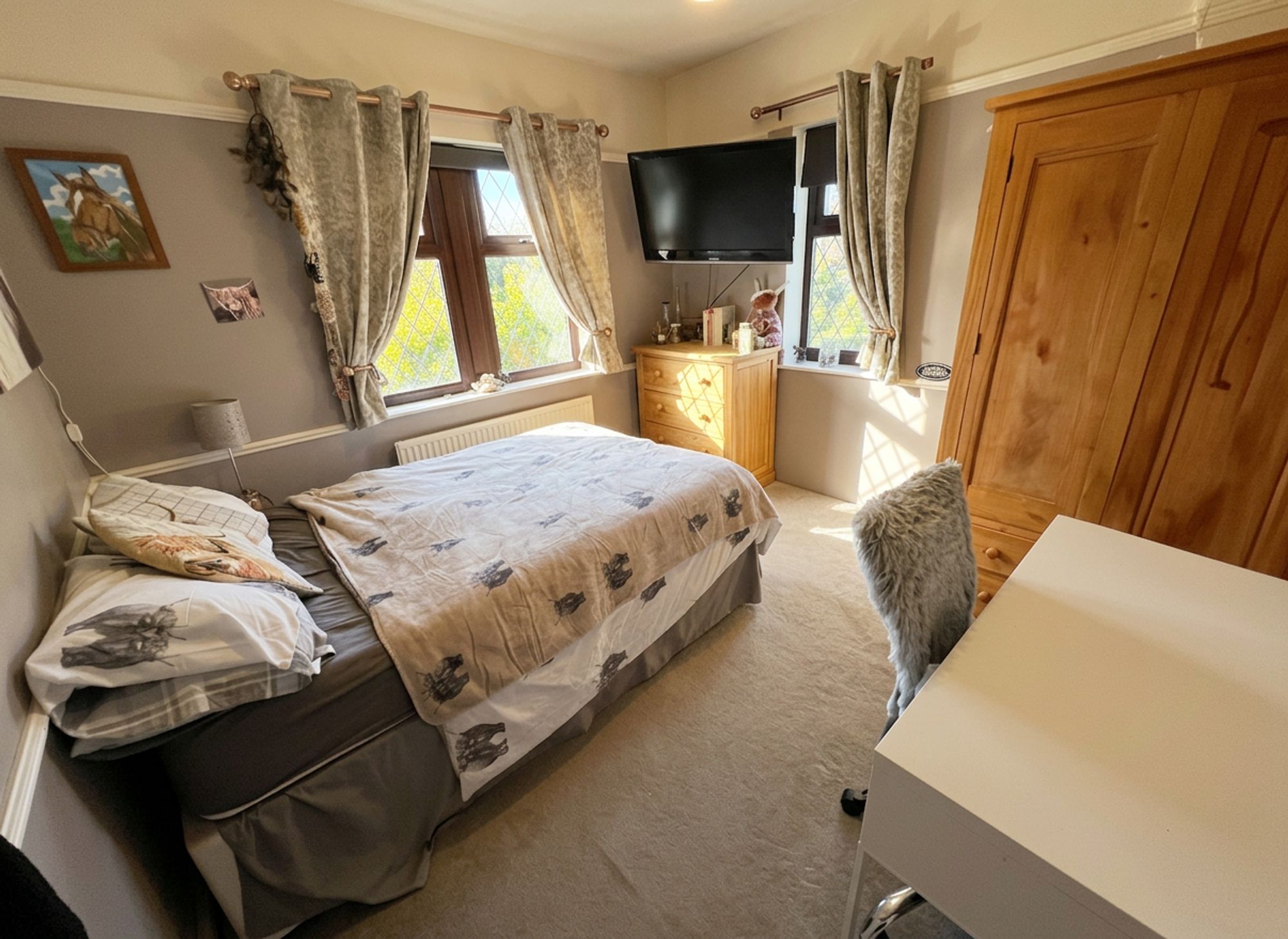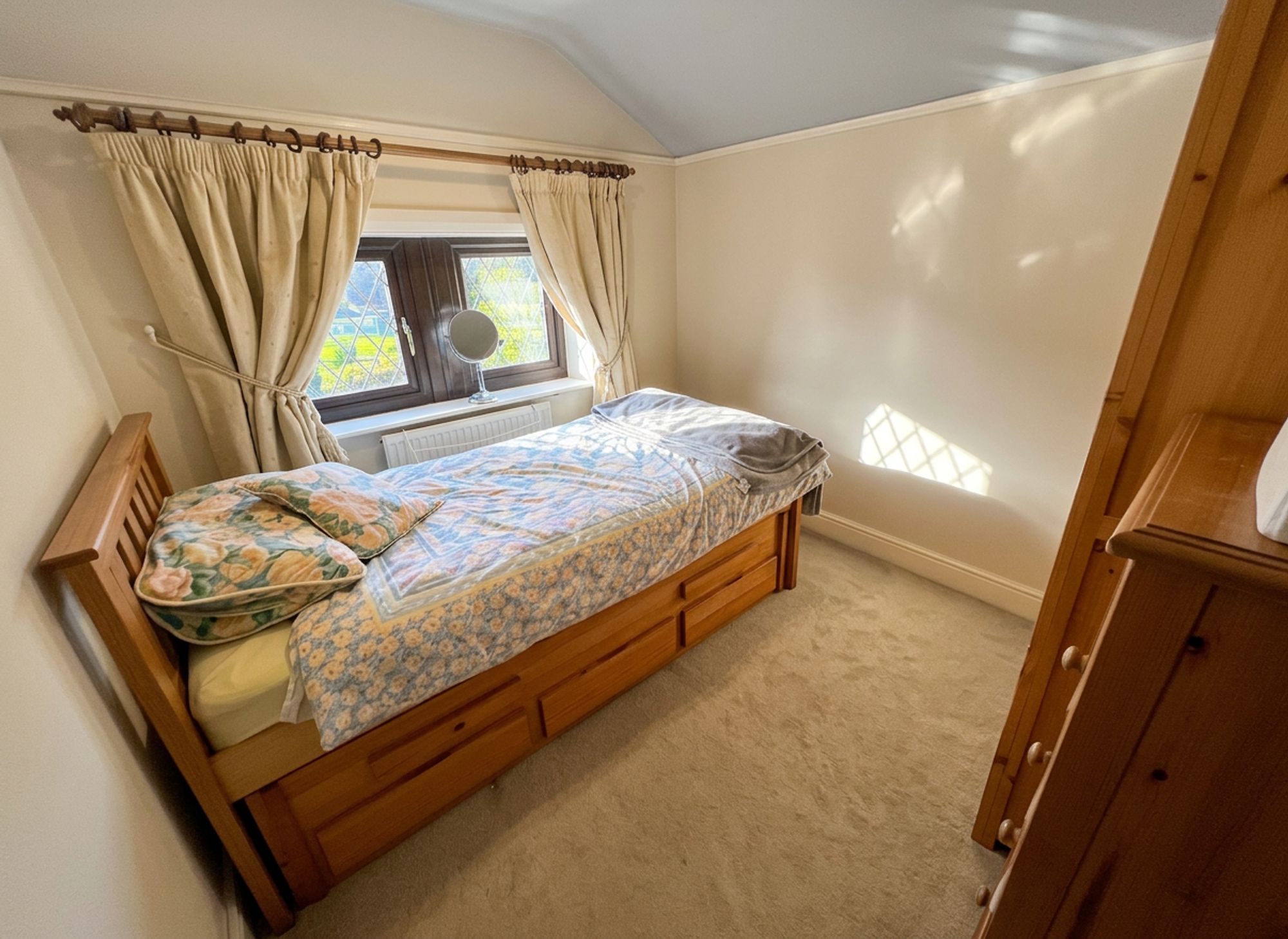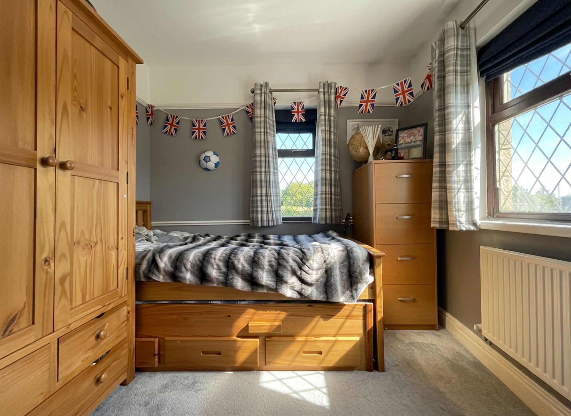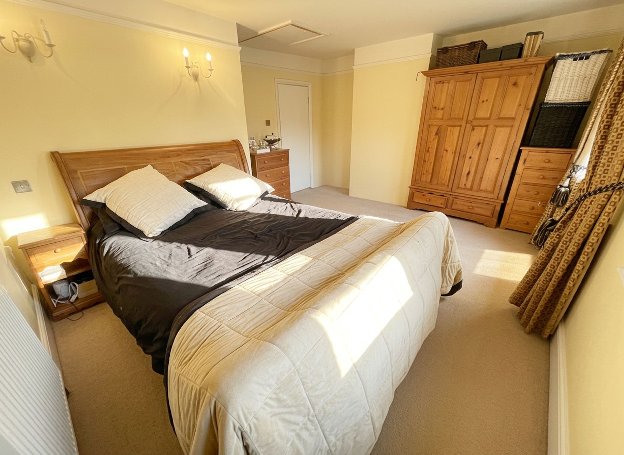 This beautifully presented bedroom is decorated in a soothing palette of dove grey and neutral tones with a plush carpet underfoot that adds warmth and comfort. Three large rear-facing windows offer lovely views over the garden, allowing natural light to gently fill the room and enhancing its tranquil ambience.