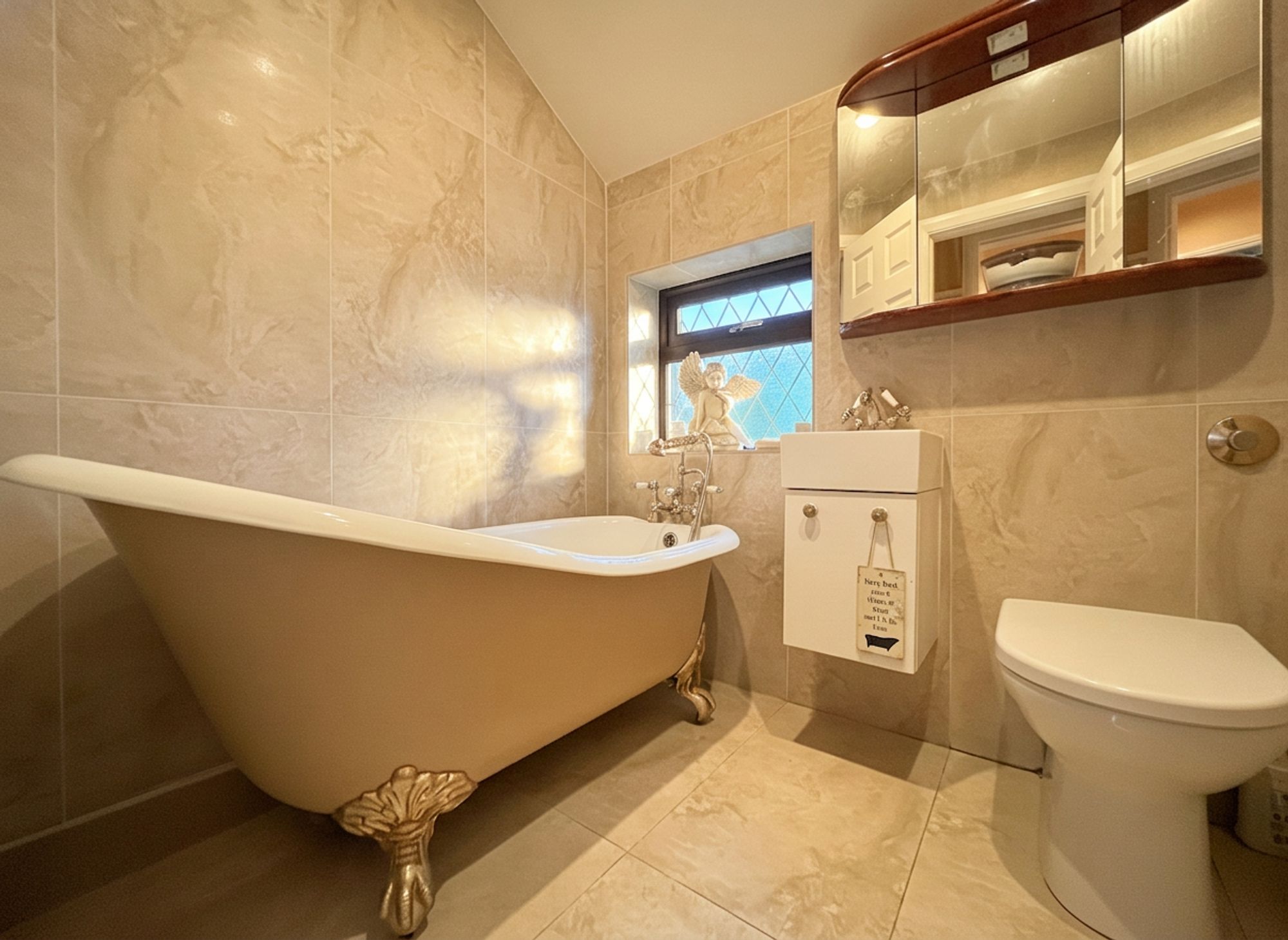 An indulgent retreat, the house bathroom is a luxurious space designed for complete relaxation. The standout feature is the stunning freestanding claw-foot roll-top bath, exuding timeless elegance and fitted with a convenient shower attachment — perfect for soaking away the day. A stylish sink is set within a practical vanity unit, providing storage, alongside a WC and a sophisticated gold heated towel rail, adding a touch of opulence. Fully tiled walls and flooring enhance the bathroom's refined design while ensuring a sleek and easy-to-maintain finish. This is a space where you can close the door, sink into the bubbles, and enjoy total tranquillity — the perfect setting for unwinding in pure comfort.
