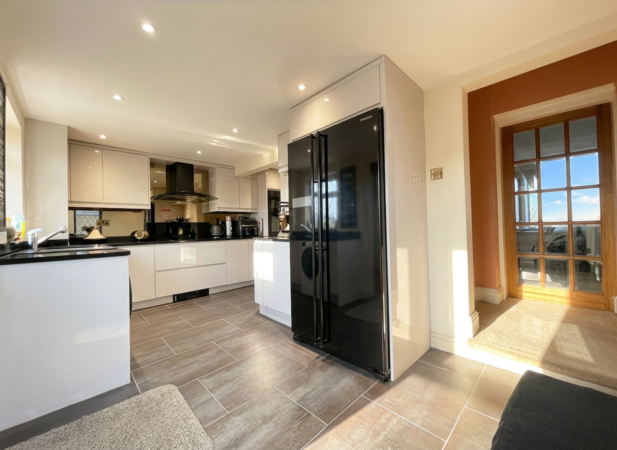 The stylish and contemporary kitchen is a true centrepiece of the home, designed for both functionality and aesthetic appeal. Featuring a sleek range of high-gloss handleless units, it boasts a clean and modern look that pairs beautifully with elegant contrasting work surfaces. Integrated appliances ensure seamless convenience, including an electric oven, grill and electric hob. There's a sleek sink with a mixer tap, along with plumbing for a washing machine and ample space for an American-style fridge freezer. The thoughtfully designed layout makes meal preparation effortless and enjoyable. Karndean flooring not only adds to the kitchen's sophisticated appearance but also provides practicality for everyday family life.
