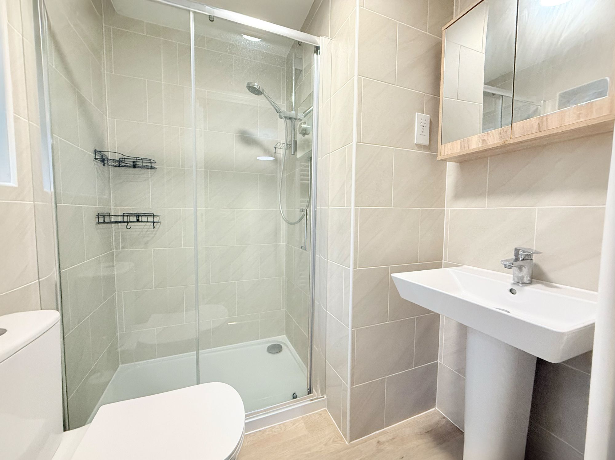 A modern en-suite shower room fitted with a shower enclosure featuring a hand-held attachment, alongside a contemporary pedestal wash hand basin and WC. Finished in neutral wall tiling with wood-effect linoleum flooring, the space is both stylish and easy to maintain.