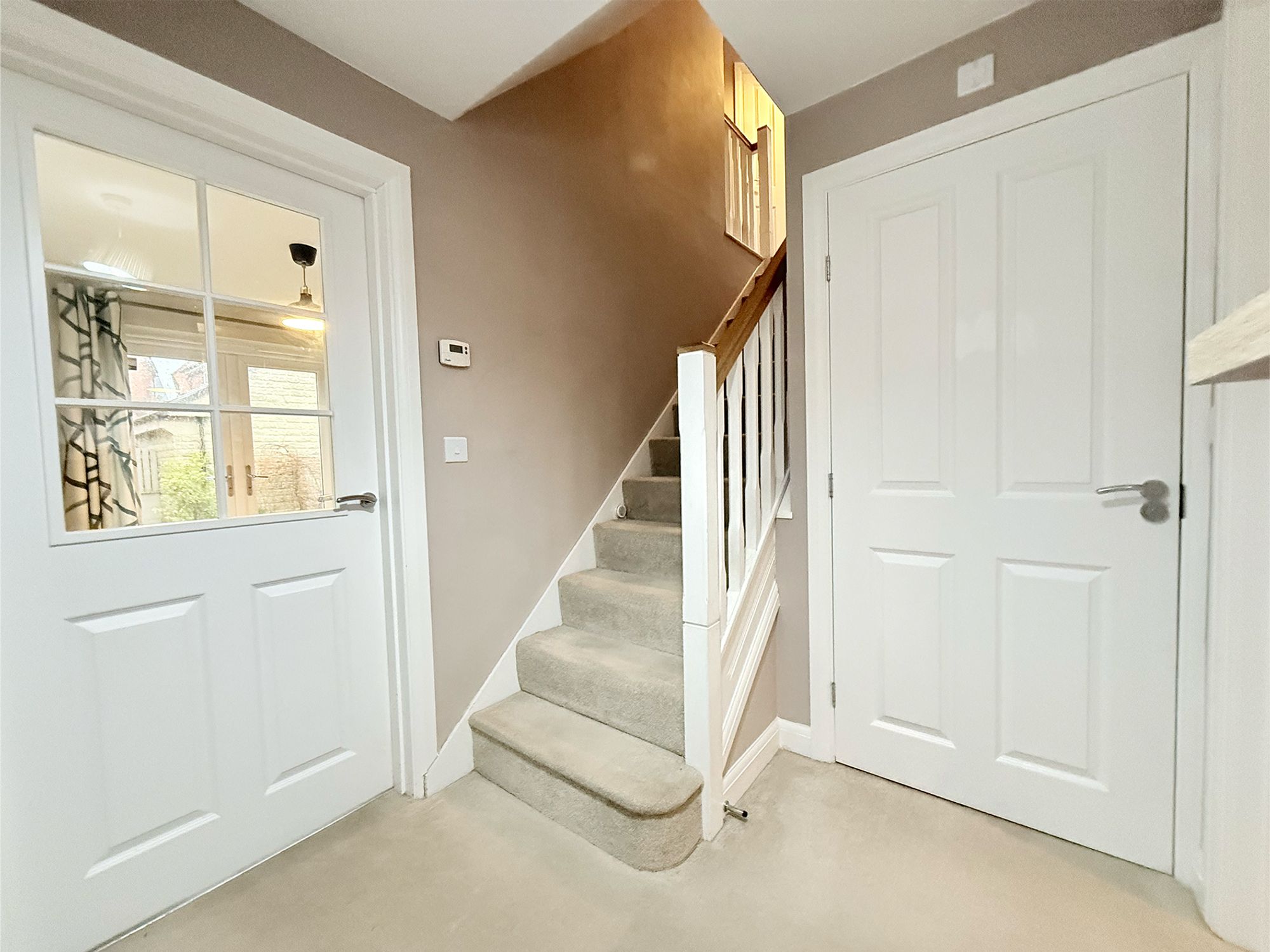 A spacious and welcoming entrance hall, neutrally decorated to create a light and airy first impression. The generous proportions offer ample space for additional storage or furniture, making it both practical and inviting. From here, there is convenient access to the ground floor WC, the living room, and the kitchen diner, as well as stairs rising to the first floor, ensuring an easy and well-connected flow throughout the home.