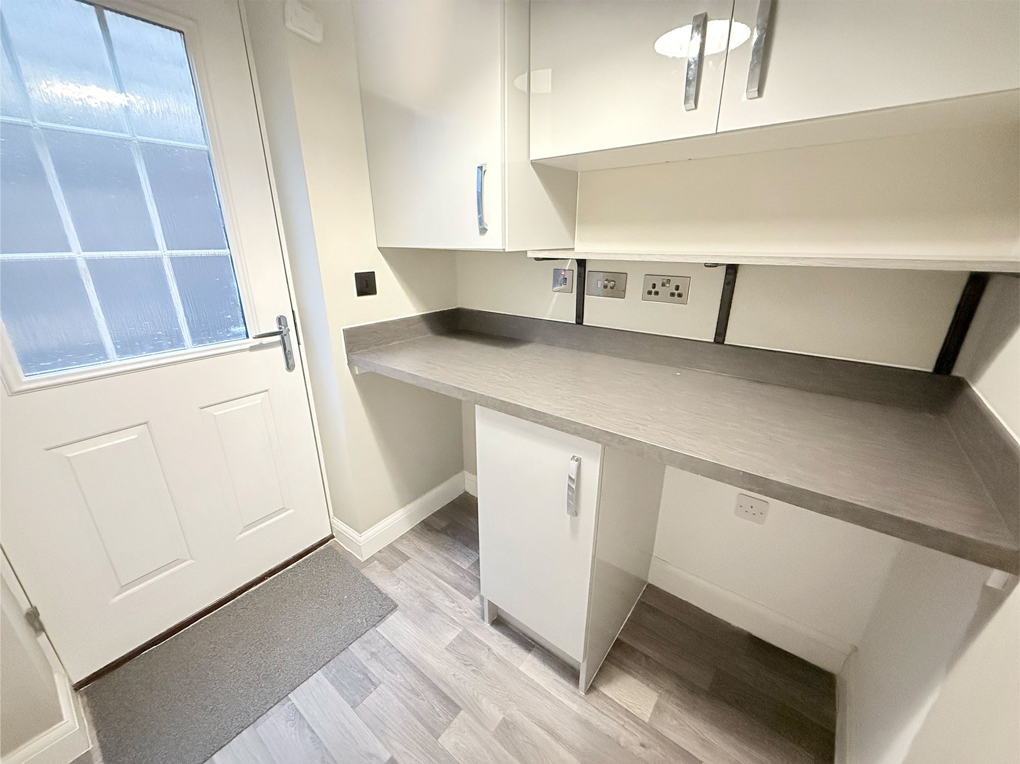 Designed to complement the kitchen, the utility room continues the same stylish cabinetry and wood-effect linoleum flooring, creating a cohesive and practical space. There is dedicated space for both a washing machine and dryer, keeping laundry neatly tucked away from the main living areas. A handy side door provides direct access to the outside, ideal for everyday convenience, while the additional storage room offers valuable extra space for household essentials, coats or cleaning equipment.