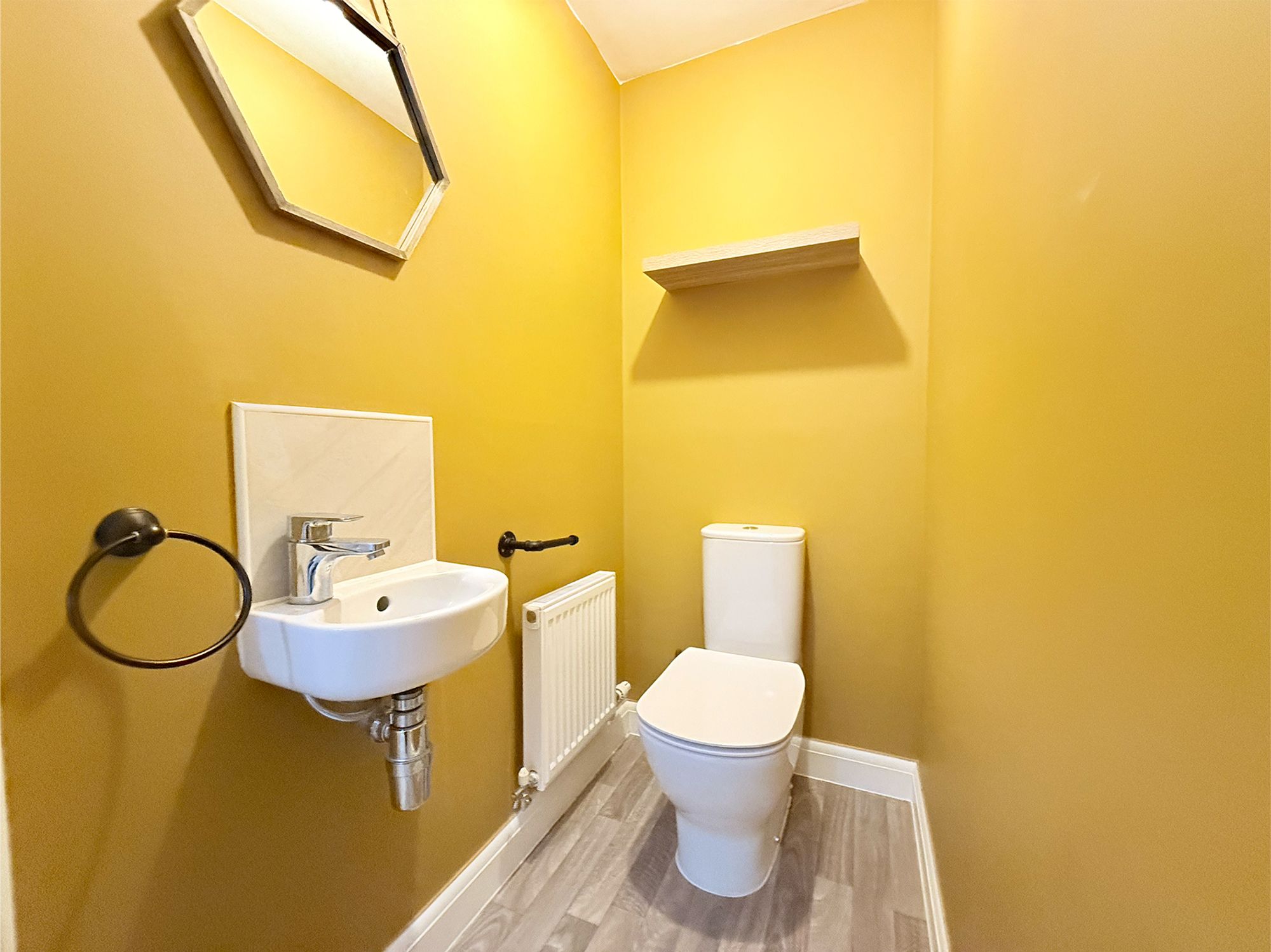 Stylishly decorated in bold tones, the ground floor WC adds a touch of character to the home. Finished with wood-effect linoleum flooring, it is fitted with a WC and a wash hand basin with chrome mixer tap, offering a practical and convenient facility for guests and everyday family use.