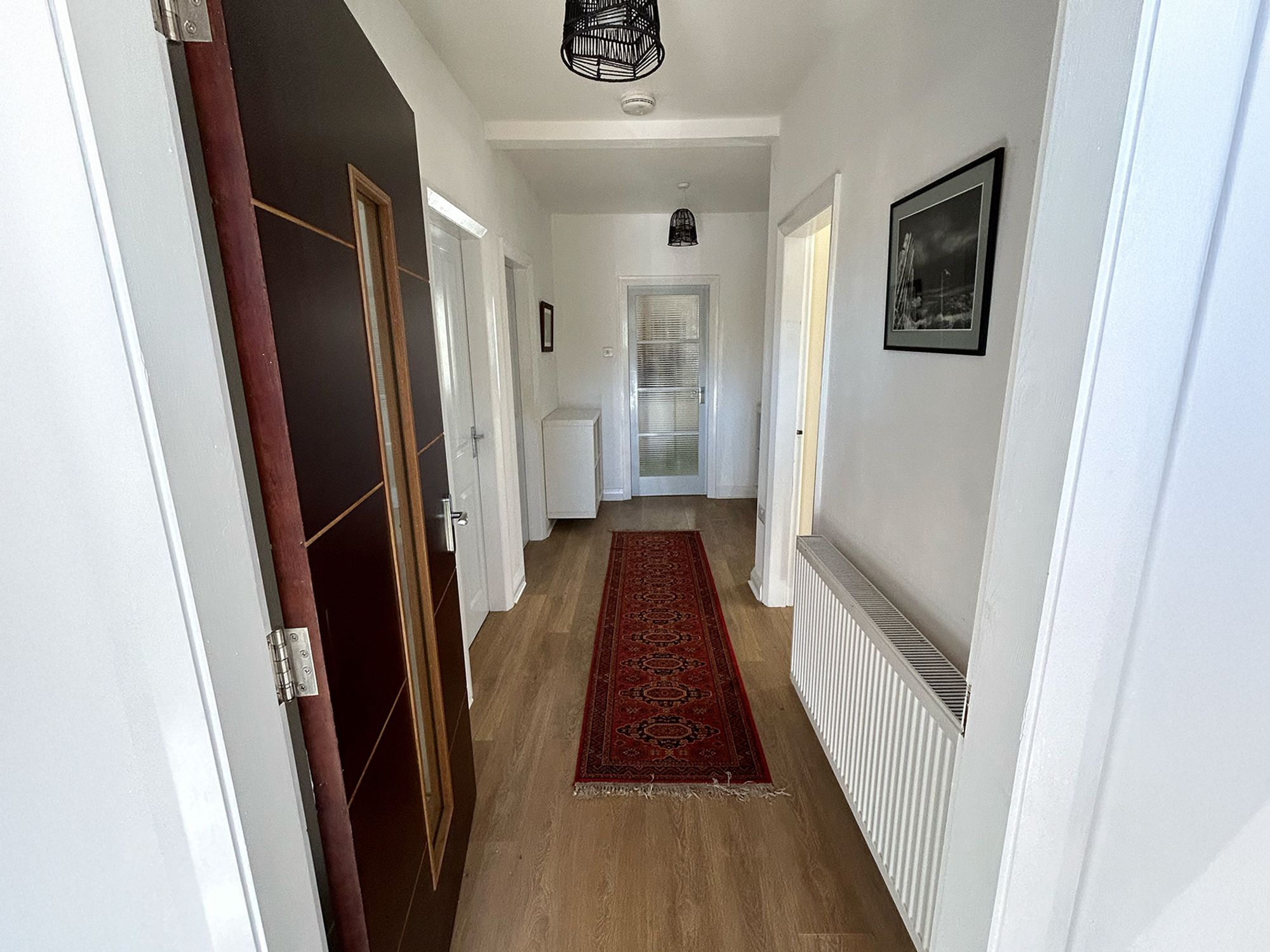 Step through a modern composite door into a bright entrance vestibule, providing a welcoming transition into the main home. From here, an internal door leads directly into the hallway which features laminate flooring and a central heating radiator, providing access to the main ground floor rooms and creating a seamless flow through the property.