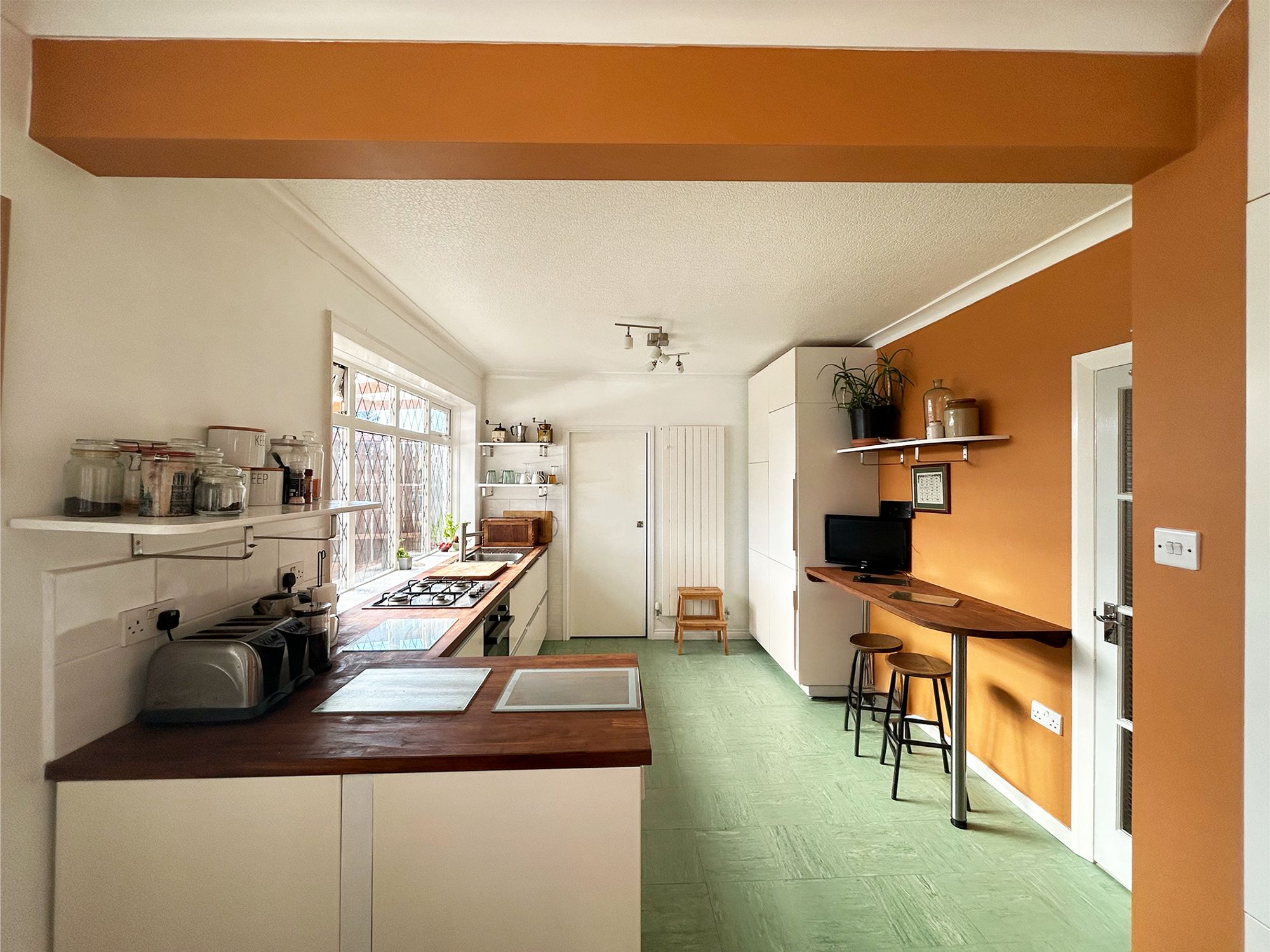 This expansive room adds fantastic flexibility to the home, ideal as a private lounge or independent living area for a teenager or relative. Complete with distant views over allotments through uPVC windows, and a fitted kitchen area with breakfast bar, electric hob, oven, stainless steel sink, base units and fridge/freezer space. Timber-clad ceiling, ceiling spotlights and a central heating radiator complete this impressive space.
