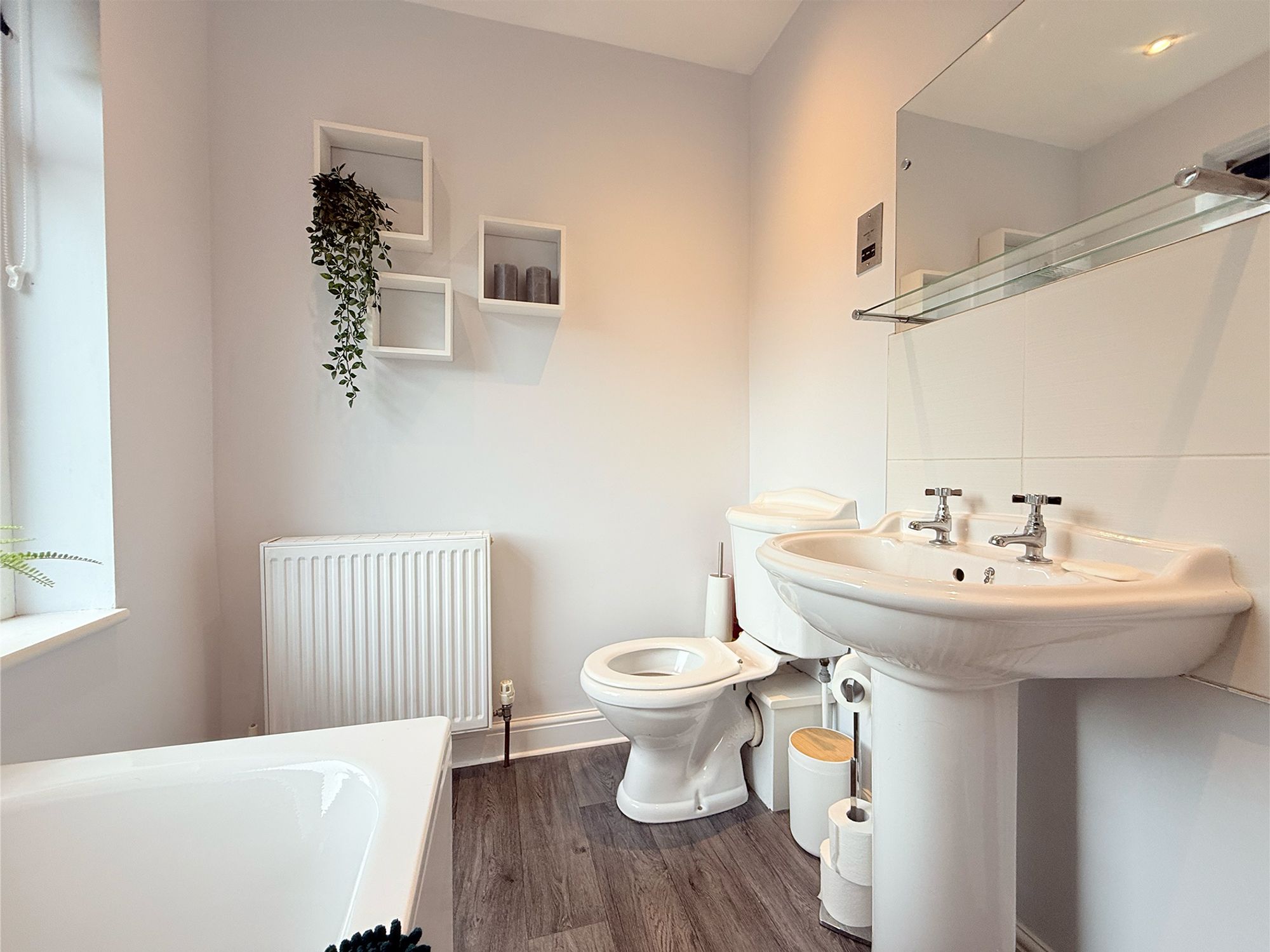 Situated to the rear of the property, the bathroom is neutrally decorated and finished with wood-effect laminate flooring. It features a full-sized bath complete with rainfall shower head and additional handheld attachment, alongside a WC and wash basin. The room also benefits from a built-in storage area, providing a convenient space for towels and linens.