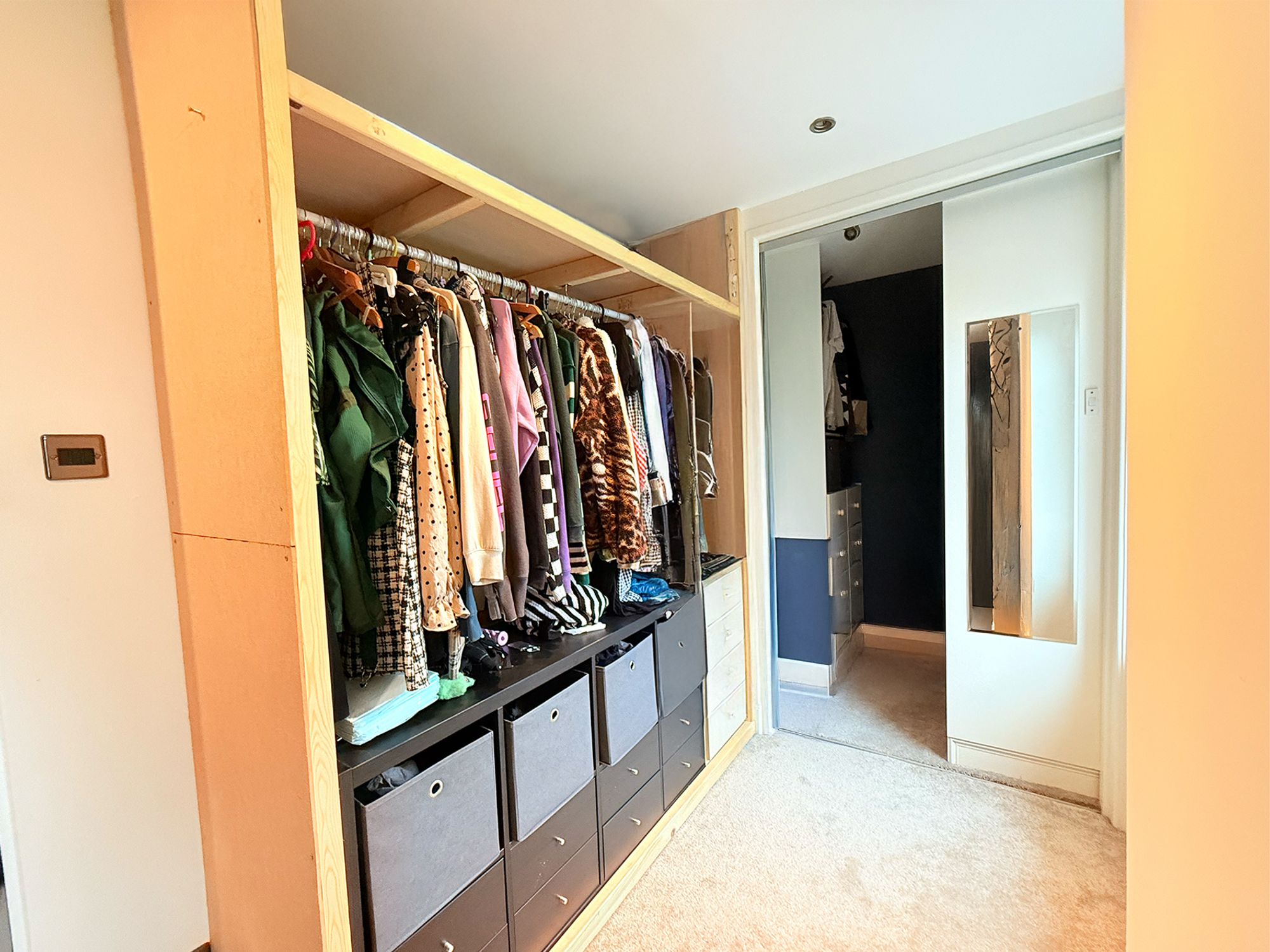 A spacious double bedroom, currently accommodating a king-sized bed, with dual-aspect windows providing excellent natural light. The room offers generous space for free-standing furniture and features floor-to-ceiling built-in wardrobes for convenient storage. An additional walk-in dressing room enhances the appeal, complete with further built-in wardrobe space and space for a dressing table concealed behind elegant mirrored sliding doors.
