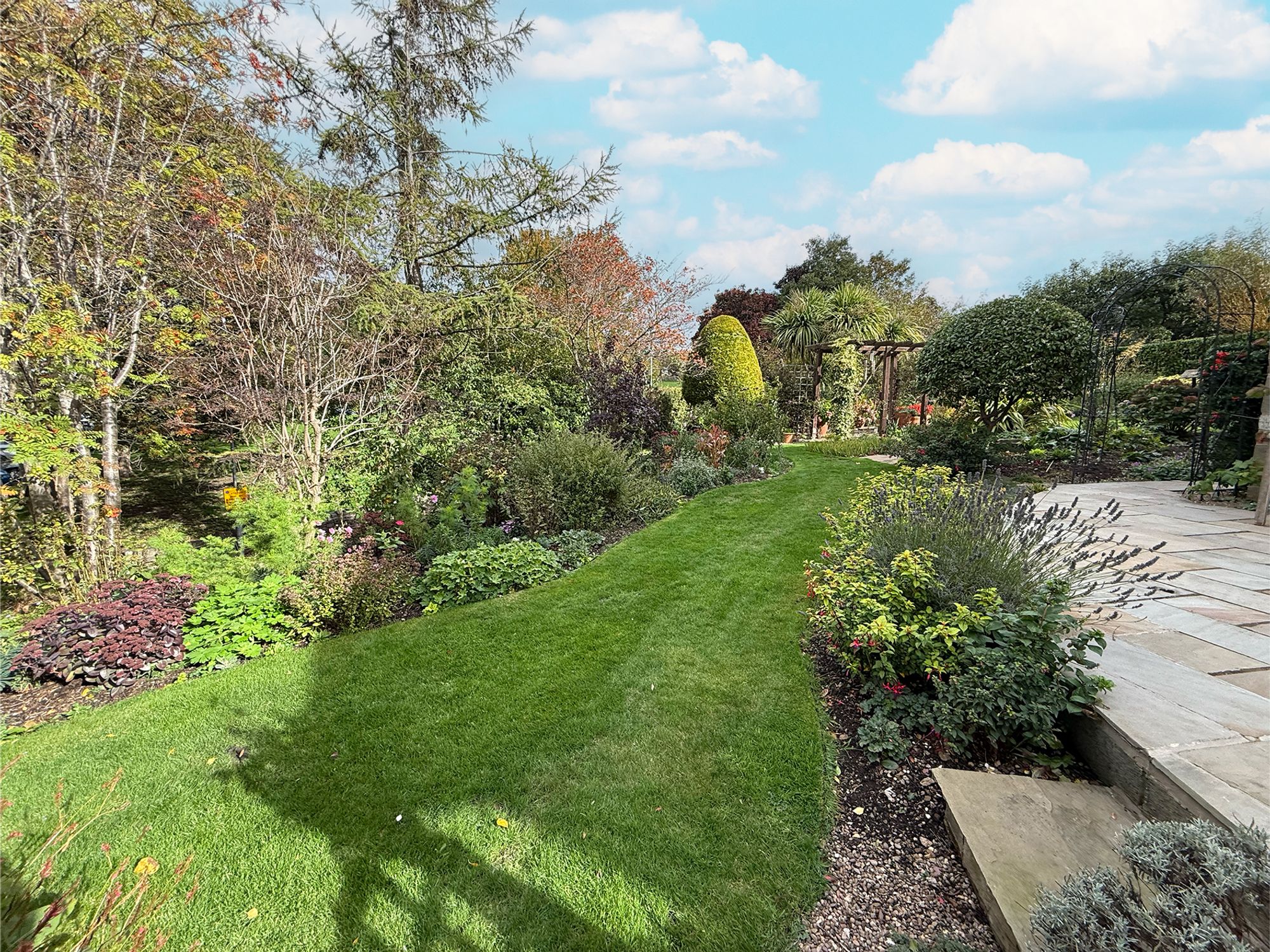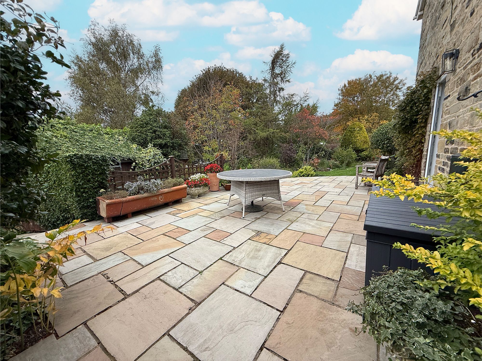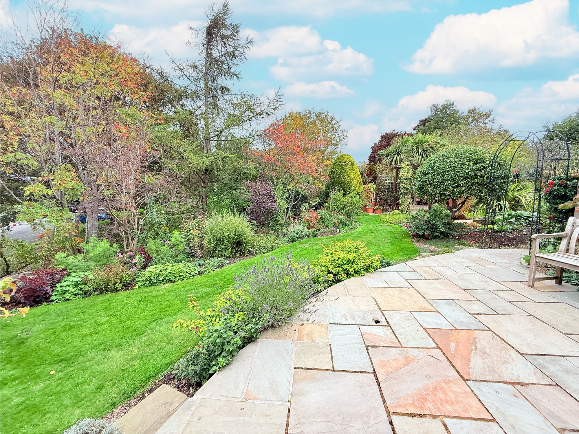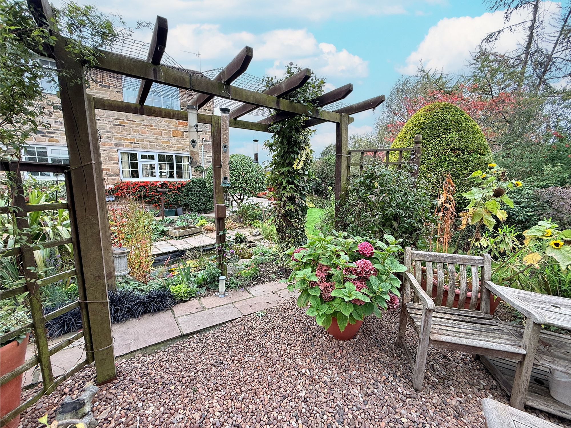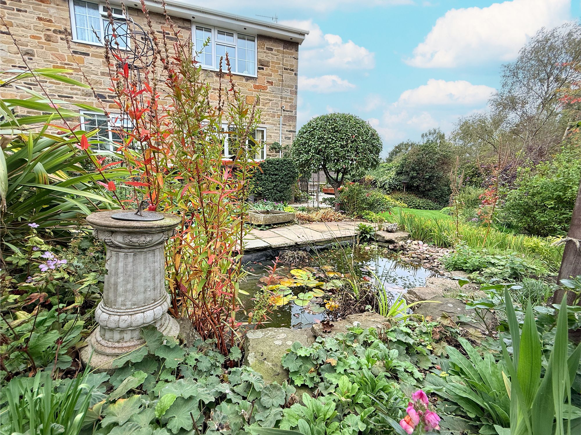 The property boasts an immaculate and beautifully maintained garden that wraps around the property from the side to the rear, creating a truly stunning outdoor space. Well-established plant beds are filled with mature plants and flowers, complemented natural hedging that enhance both character and privacy. A charming pagoda and fish pond add to the tranquil setting, while a pebbled seating area provides the perfect spot to relax and enjoy the surroundings. The Indian stone patio, accessed directly from the kitchen, offers an ideal space for alfresco dining and entertaining. Additional flagged walkways wind attractively between the planting, leading to a further patio area accessed from the lounge. A double shed is also included, providing excellent storage solutions.
