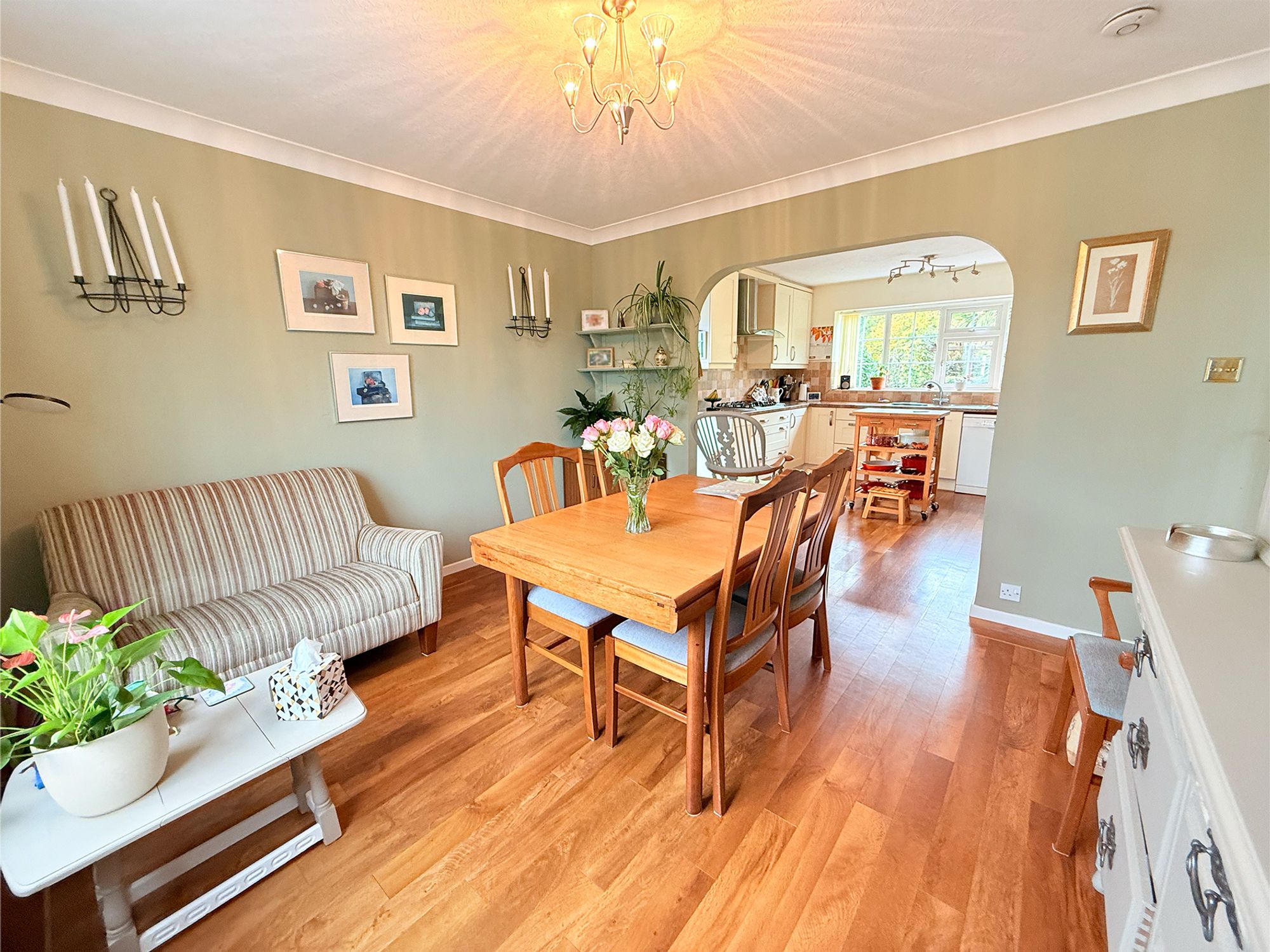 Positioned to the front of the property, the dining room is bright and airy, enhanced by a large window that allows natural light to flood the space. An open archway seamlessly connects the room to the kitchen, creating an attractive open-plan kitchen-diner feel. Finished with wooden laminate flooring and presented in soft, neutral tones, the room offers ample space to accommodate a full-sized family dining suite, making it perfect for both everyday meals and entertaining.