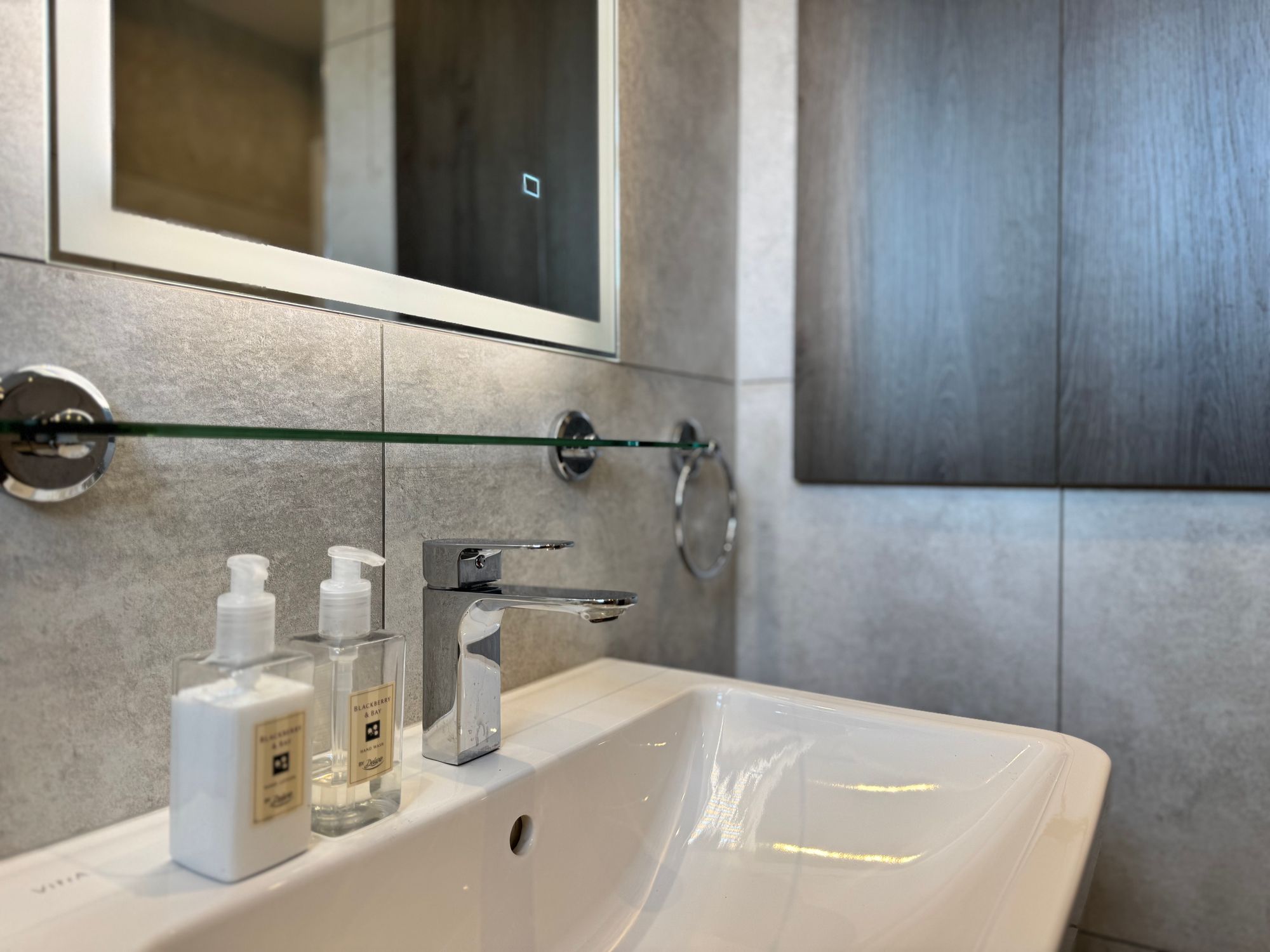 The house bathroom is a luxurious suite featuring underfloor heating beneath oak-effect flooring for added comfort. The walls are fully tiled, combining elegant tiles with wood-effect finishes to create a warm, earthy, spa-like atmosphere. The suite includes a floating wash basin, WC and a large bath with a handheld shower attachment. A sleek inset niche beside the bath provides convenient display storage, while an anthracite radiator adds both style and practicality. Built-in cupboards above the bulkhead offer additional storage, and an LED mirror above the basin enhances everyday convenience. A window allows natural light to fill the space, completing this bright and relaxing bathroom.