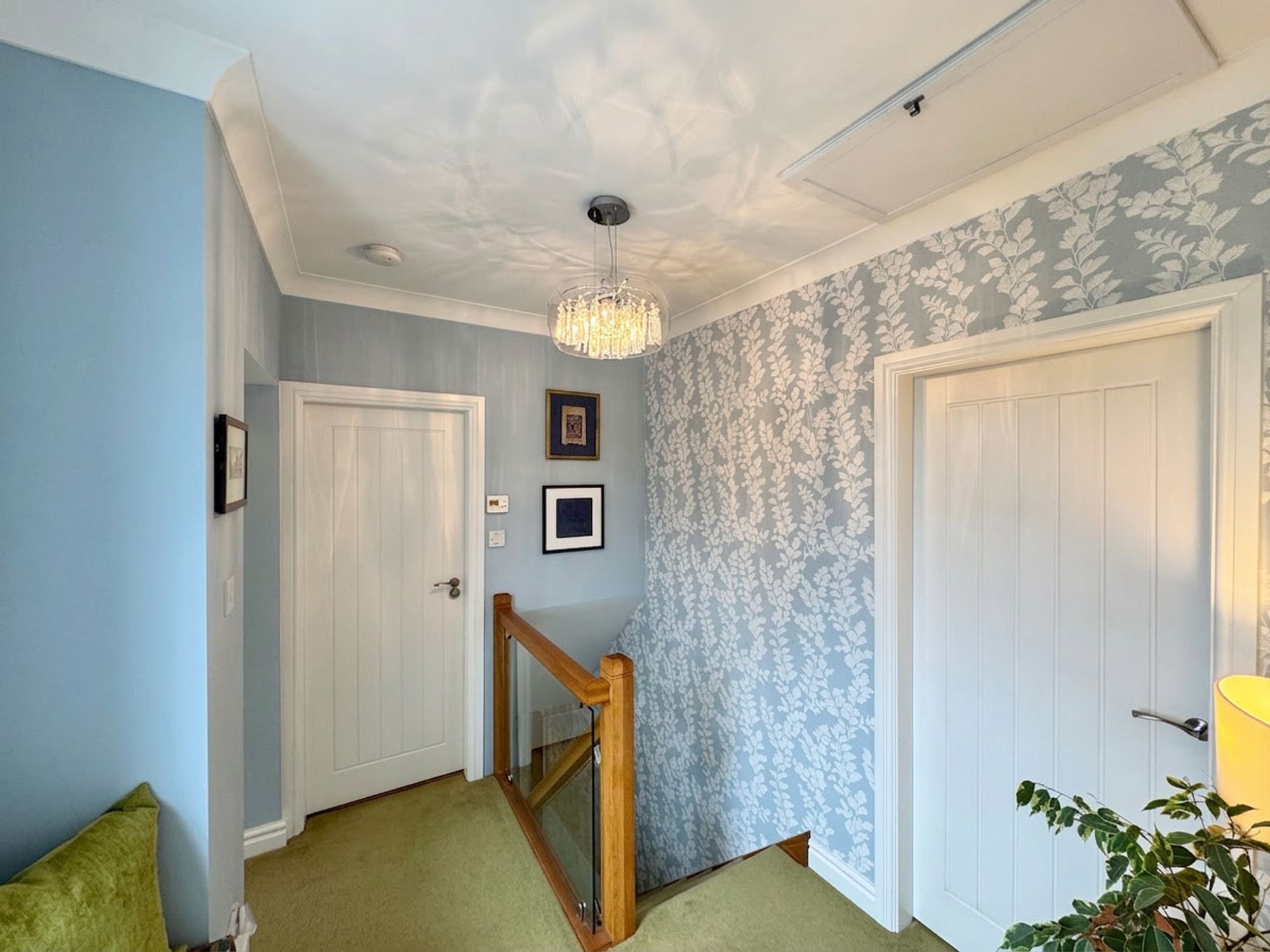 The property benefits from a spacious landing, enhanced by a stylish glass and oak bannister that adds warmth and a sense of luxury. The landing provides access to all bedrooms, the family bathroom and the attic, while a discreet window seat with built-in storage offers a charming and practical feature.
