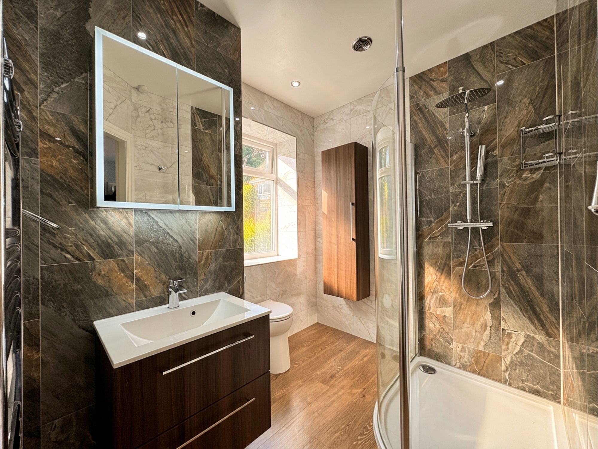 Accessed directly from bedroom one, this generously sized en-suite is beautifully presented with stylish oak-effect flooring and fully tiled walls in an elegant stone-effect, gloss finish. The suite features a spacious walk-in shower with both a rainfall shower head and separate handheld attachment. A floating wash basin with double soft-close drawers provides excellent storage, complemented by an additional tall floating cupboard. An LED mirror above the basin adds both style and practicality, while a chrome radiator introduces a further touch of luxury. An obscured glass window allows natural light to fill the space while maintaining privacy.