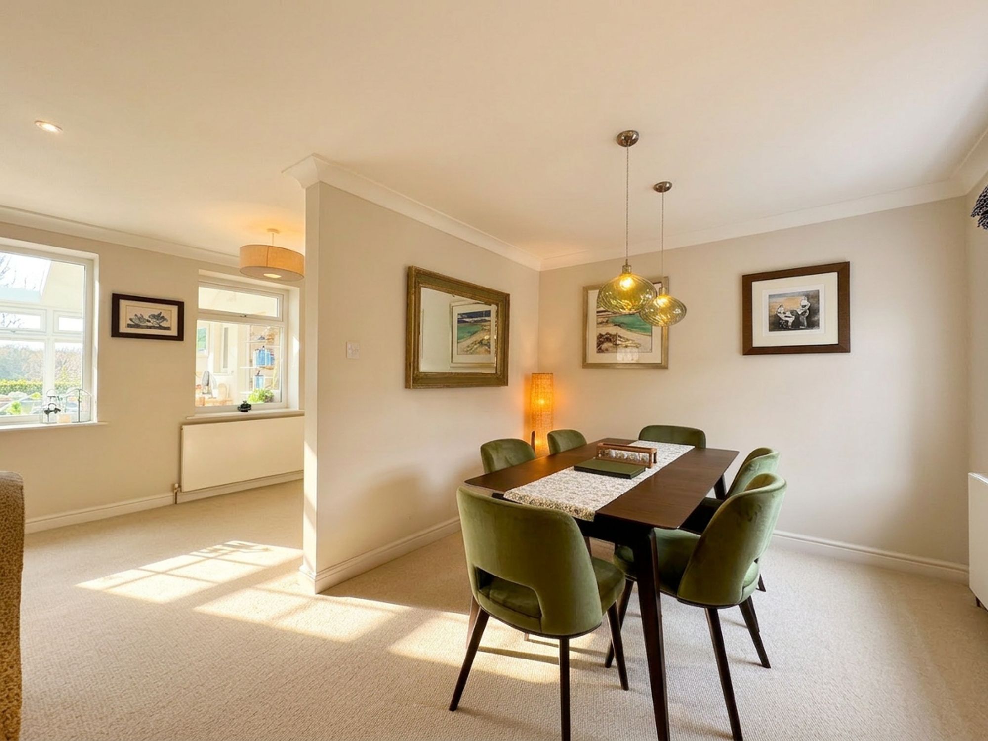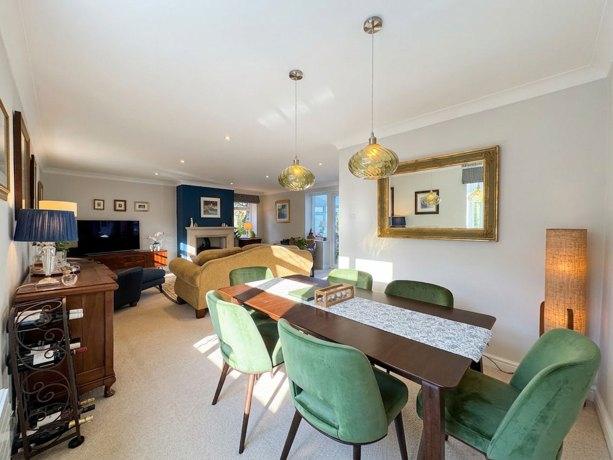 The living/dining room is an impressive, light-filled space offering generous proportions for both formal dining and relaxed living. Thoughtfully arranged, the room provides ample space for a dining area while also creating a comfortable seating area, perfect for unwinding after meals. A striking log-burning stove forms the central focal point, adding an inviting ambience to this elegant yet cosy setting.