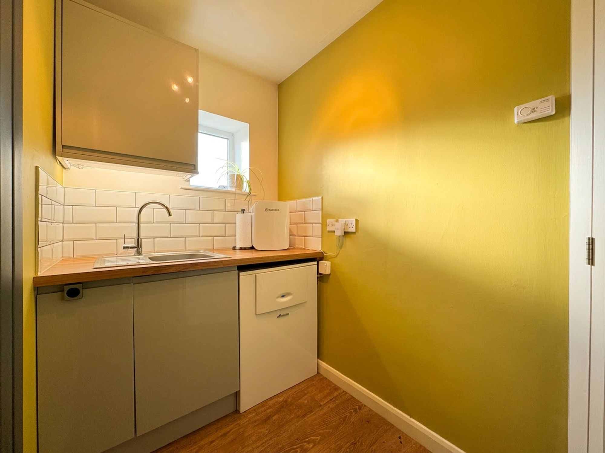 The utility/cloakroom features wood-effect flooring, complemented by oak-effect worktops and gloss-finish cupboards, creating a clean and practical space. The room is fitted with a sink and also houses the boiler and fuse board and all utility meters, offering useful additional storage and functionality.