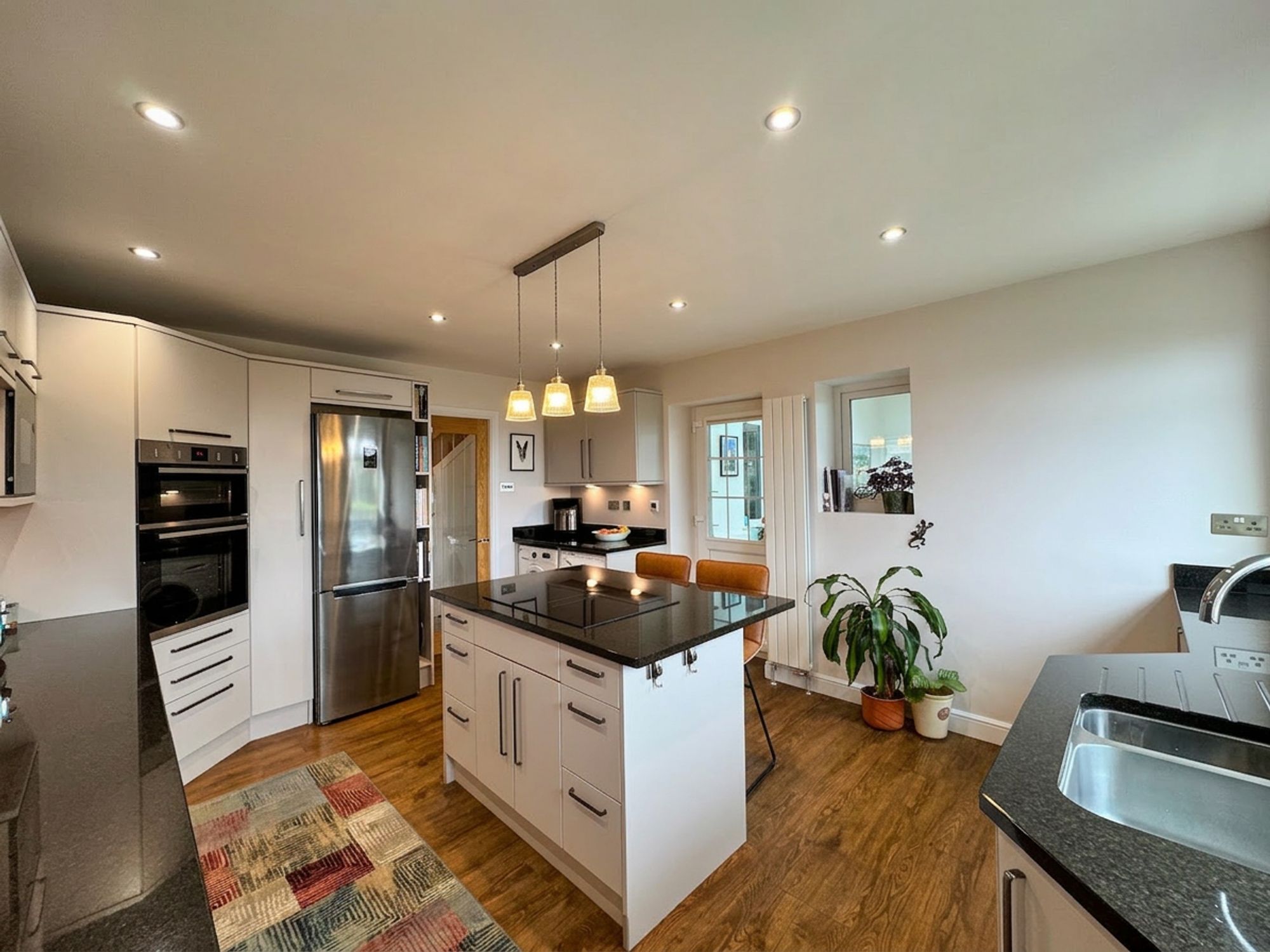 The kitchen is immaculately presented, featuring stylish matt-finish cabinetry that contrasts perfectly with the granite worktops. Flooded with natural light and enjoying far-reaching views, the space feels both bright and inviting. At the centre of the room is a striking island with a built-in Elica venting induction hob, preserving the kitchen’s sleek and contemporary design. The island also provides breakfast bar seating, perfect for relaxed dining or gathering with family and friends. The kitchen is well-equipped with integrated appliances including a dishwasher, double oven and microwave, along with space for a fridge freezer. There is also convenient under-counter space for both a washer and dryer. The room has direct access to the orangery, providing a seamless transition for socialising.