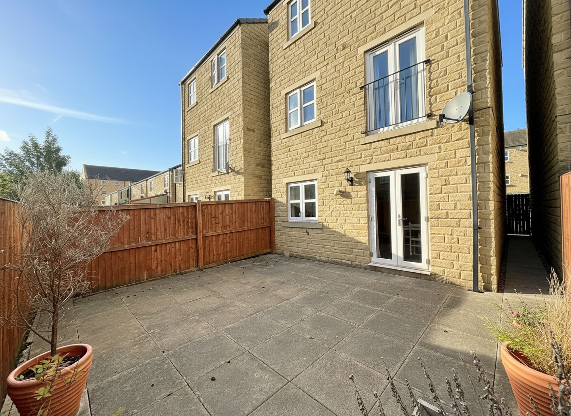 The rear garden can be accessed directly through French doors from the kitchen or via a convenient side gate from the driveway. Designed with low maintenance in mind, it features a stone-flagged patio, perfect for outdoor dining, entertaining, or simply relaxing.