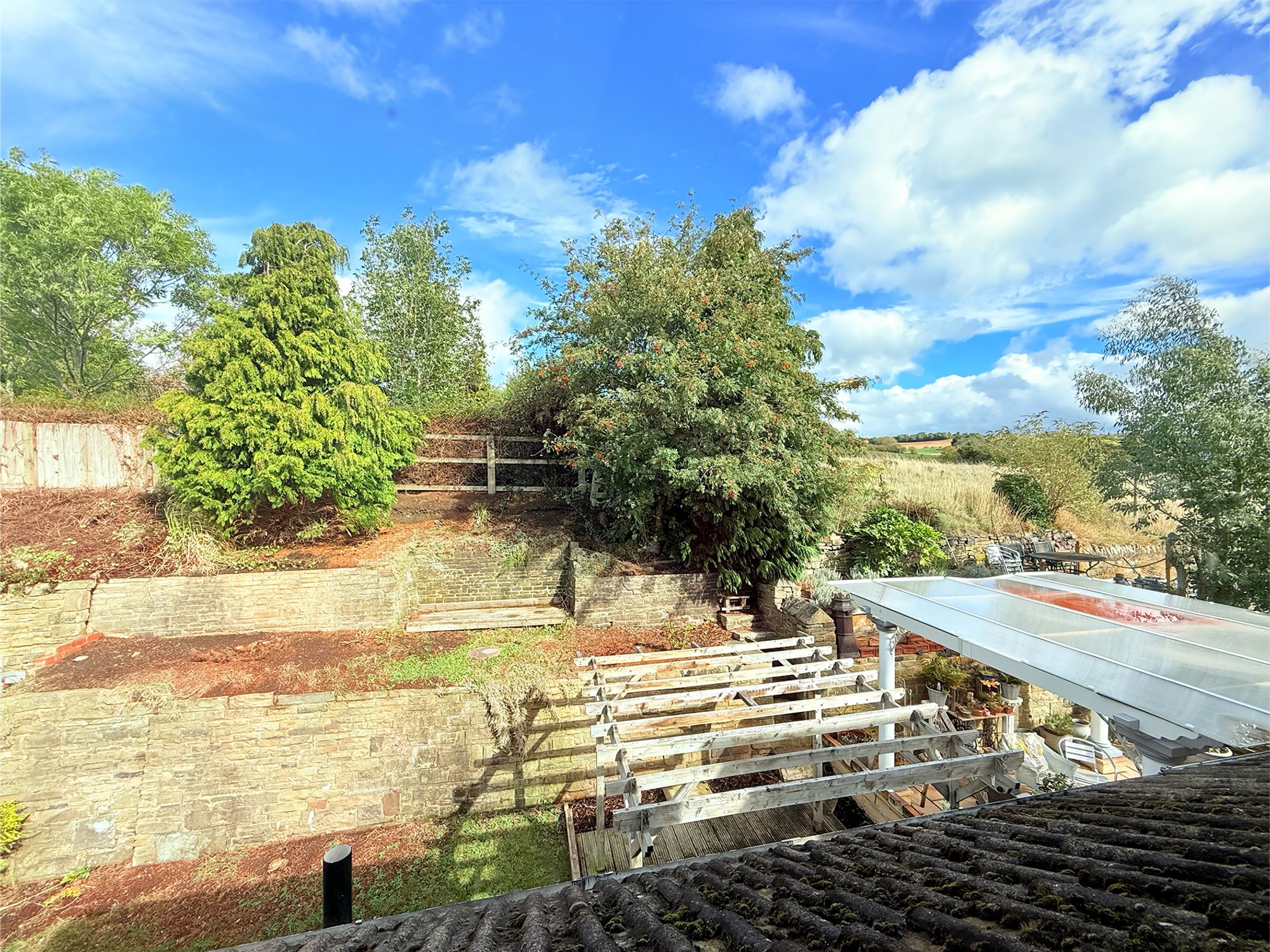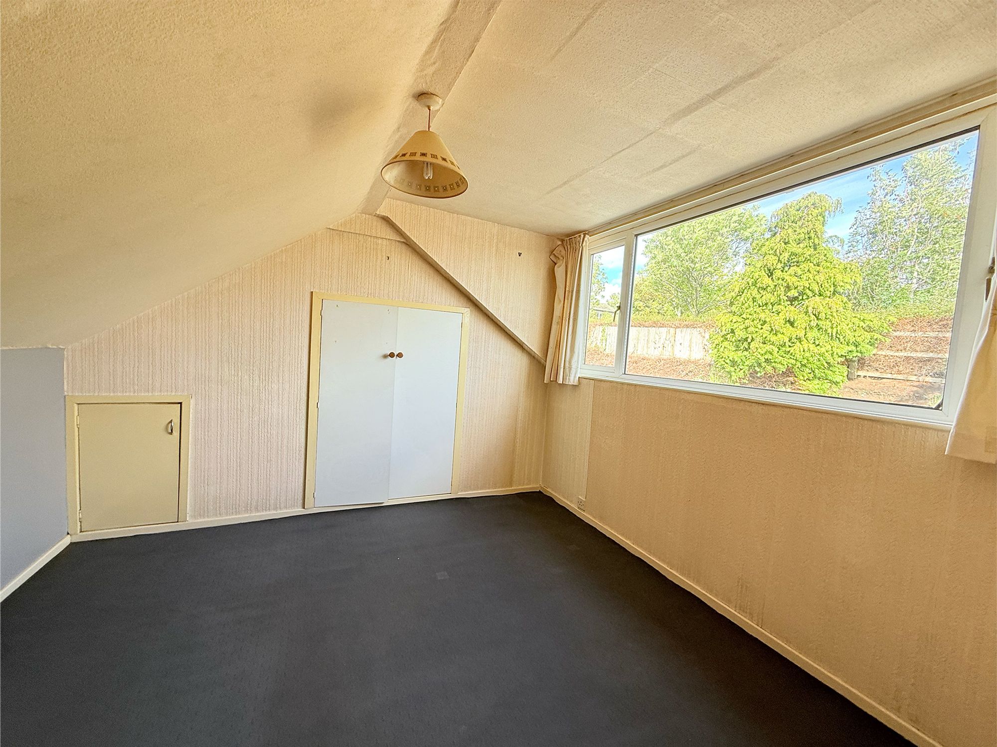 Located on the first floor, this spacious double bedroom is filled with natural light from a large picture frame window offering views over the rear garden and surrounding fields. The room also benefits from built-in storage and provides access into the eaves of the loft, adding both charm and practicality.