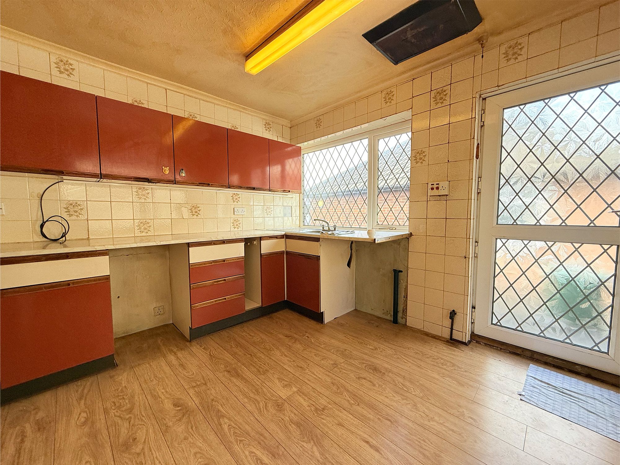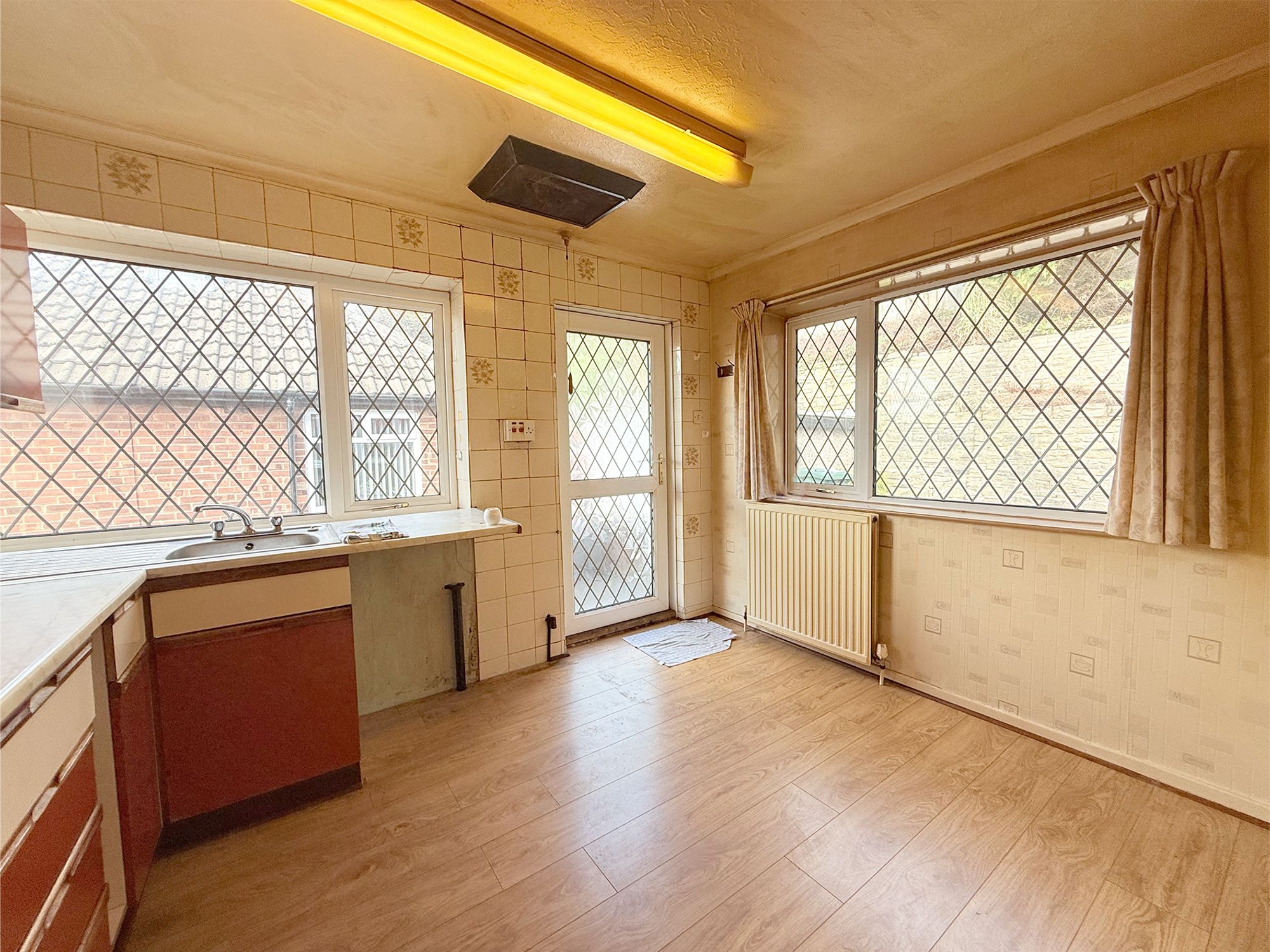 Located at the rear of the property, the kitchen diner enjoys views over the garden and benefits from dual aspect windows, along with an external door providing direct access outside. The space is fitted with a chrome sink with mixer tap, a range of kitchen units with laminate countertops, and wood-effect laminate flooring. Offering ample room for a family dining table, this bright and versatile room is perfect for everyday living and entertaining alike.