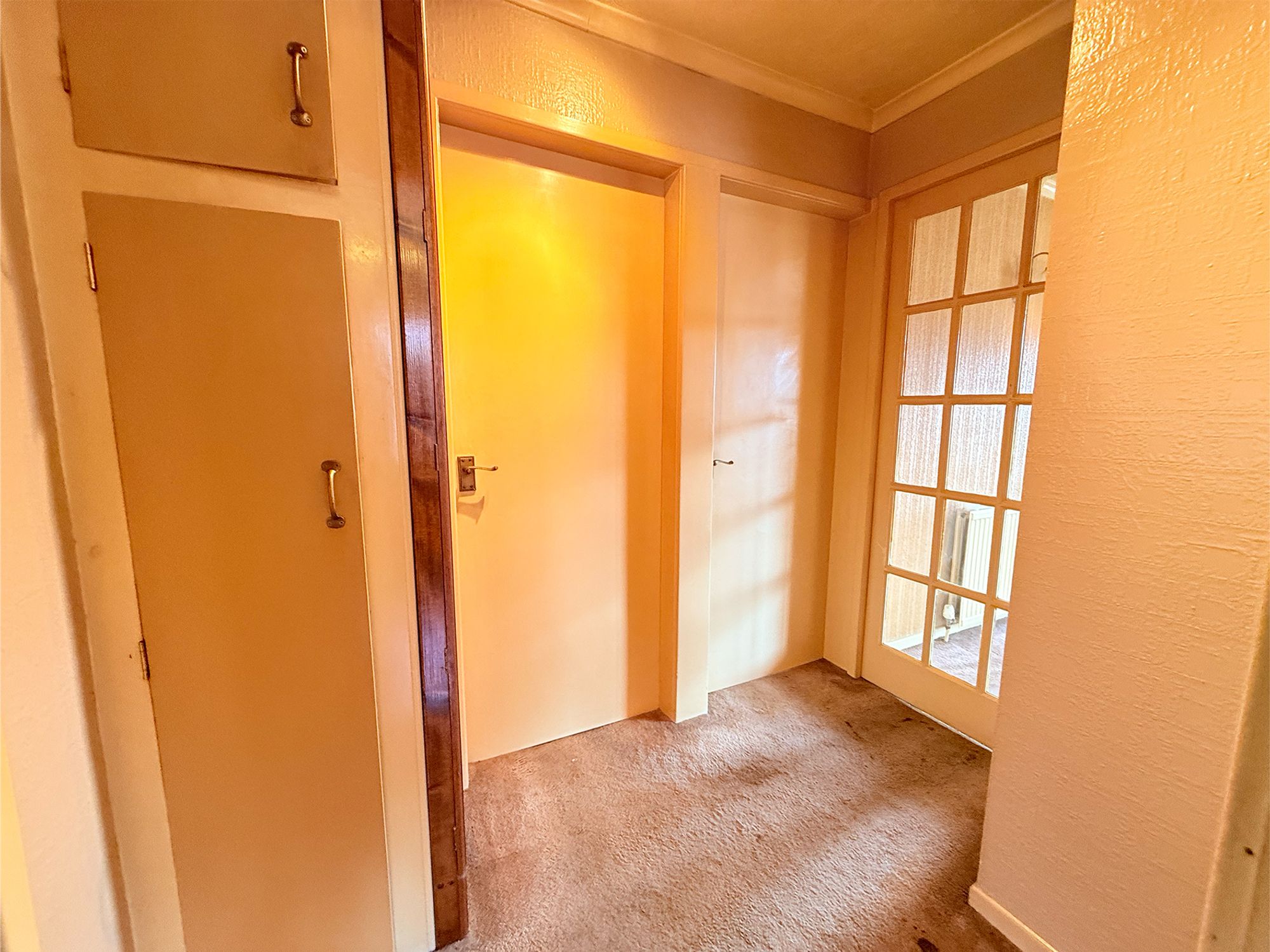 The hallway provides convenient access to the kitchen, bathroom, lounge, dining room, and bedroom one. Neutrally presented, it also benefits from built-in storage, ensuring a practical and organised living space.