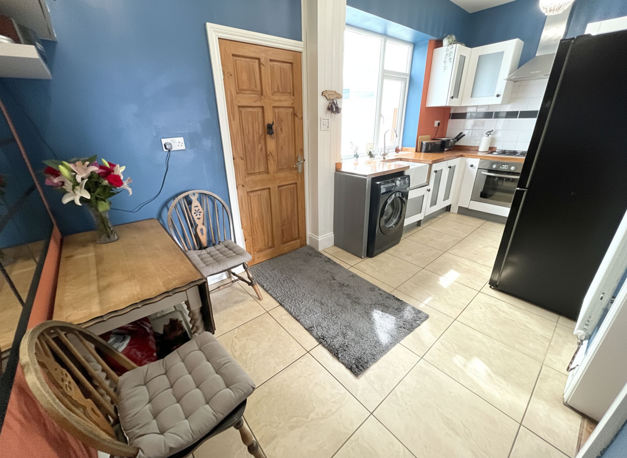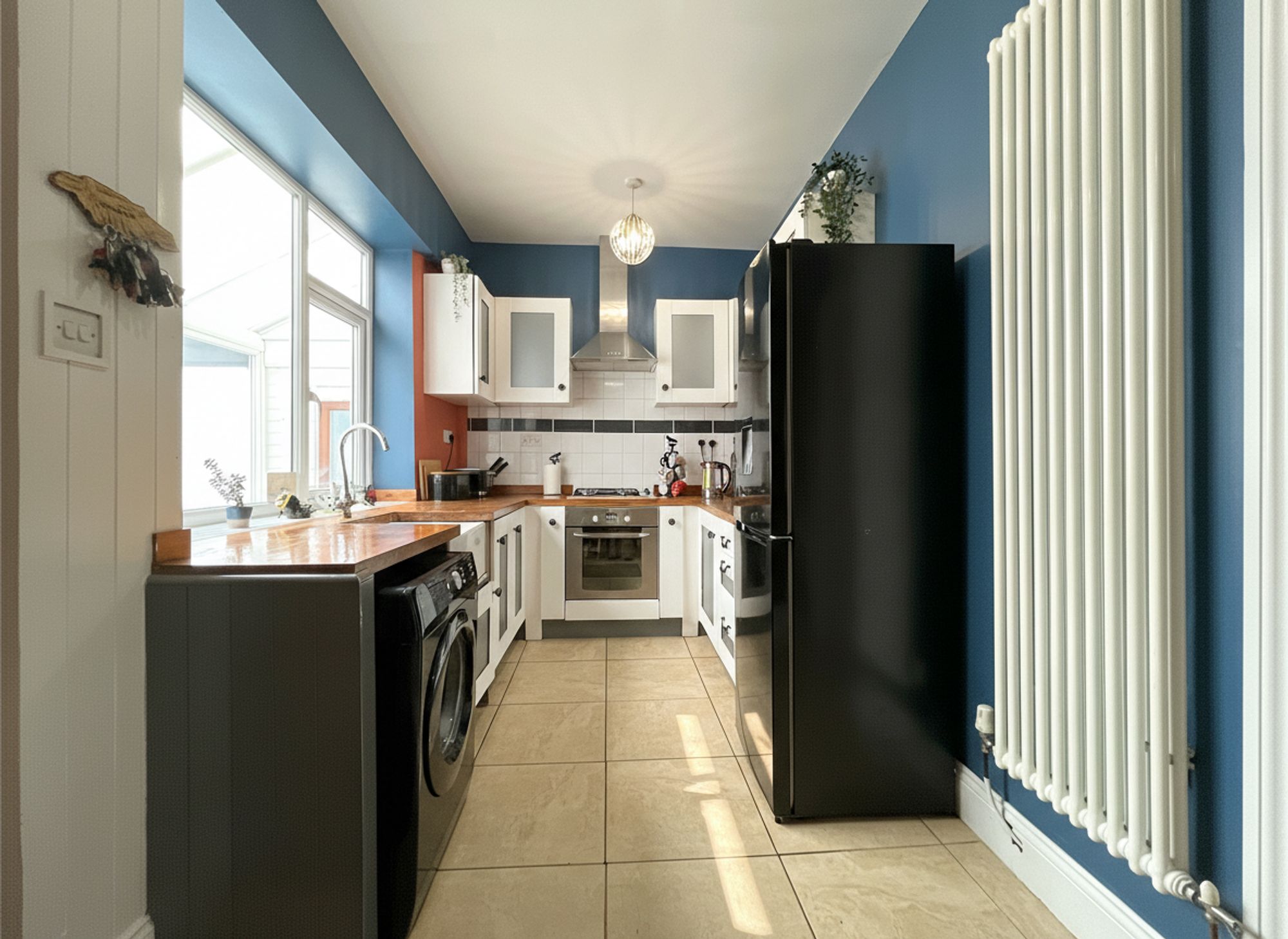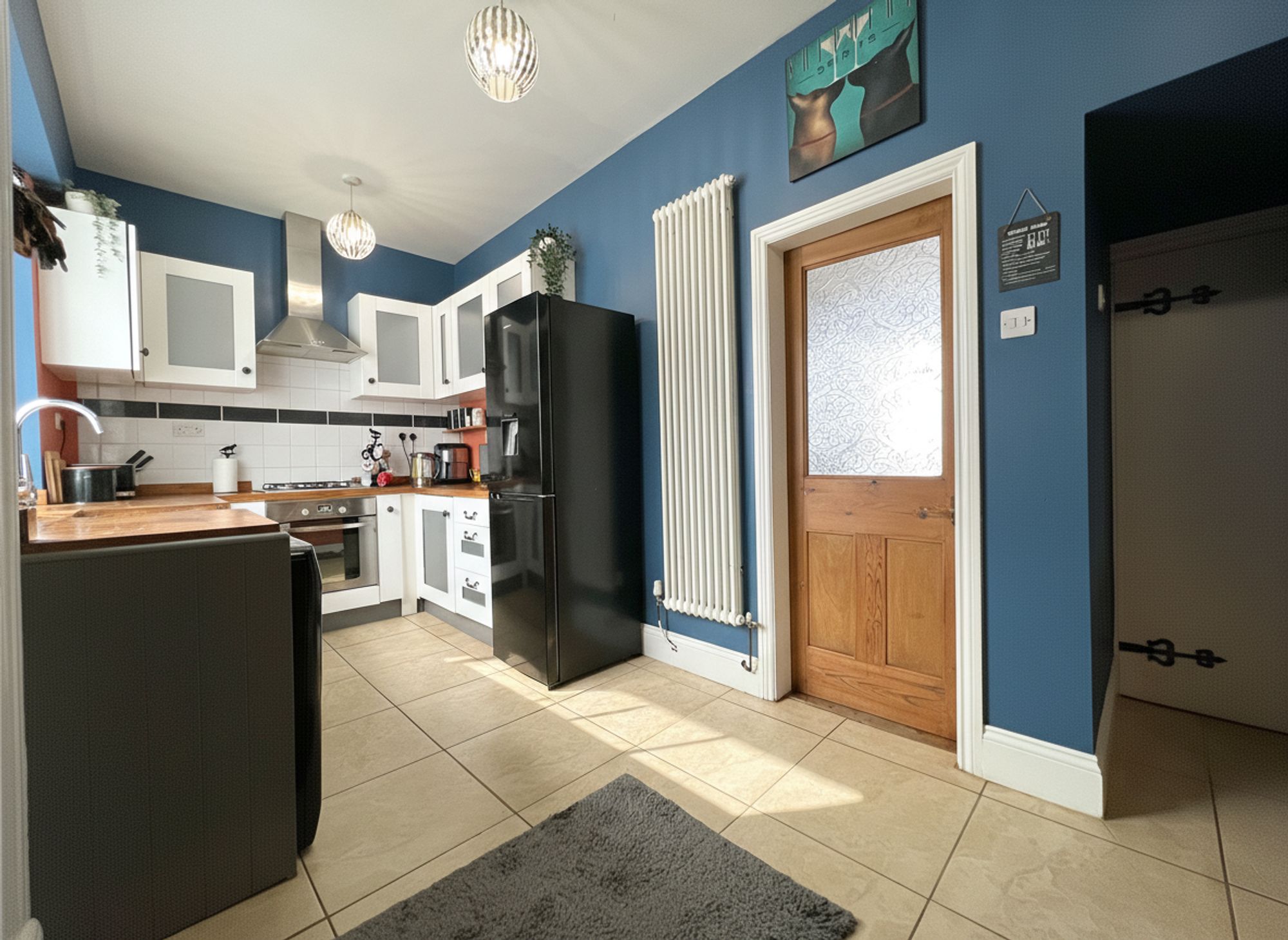 Heated by a large vertical column radiator, the kitchen features a range of units topped with solid wood work surfaces, creating a stylish yet functional heart of the home. Integrated appliances include an electric oven and 4-ring gas hob, complemented by a classic ceramic Belfast sink. There is plumbing for a washing machine along with space for a freestanding fridge freezer. The room also offers ample space to accommodate a dining table and chairs, making it a sociable and practical setting for everyday living.
