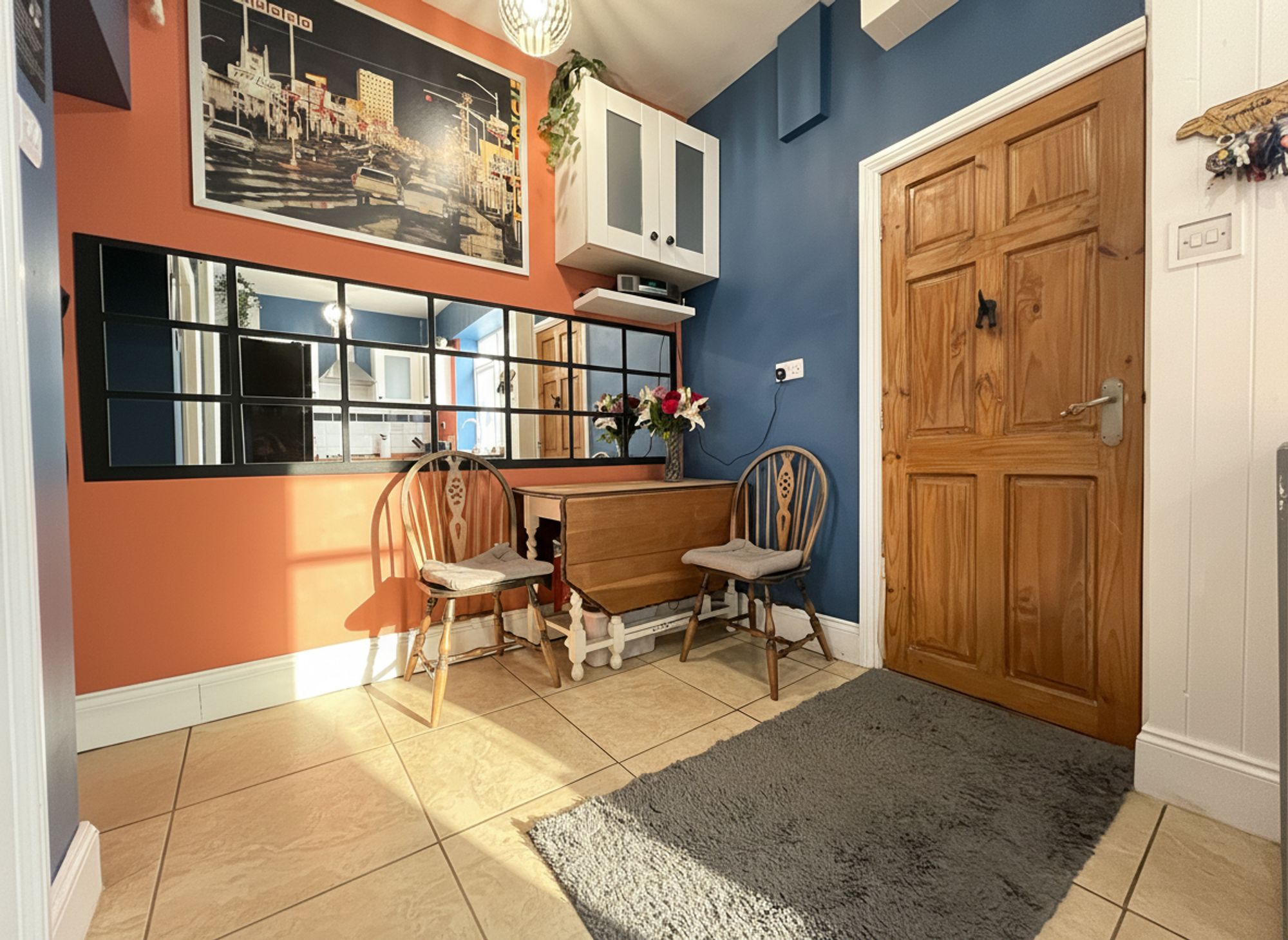 A highly practical and inviting porch, featuring durable tiled flooring and offering ample space for storing outdoor garments and muddy boots before entering the main home. An outside tap is also conveniently positioned, ideal for watering garden plants or washing the car.