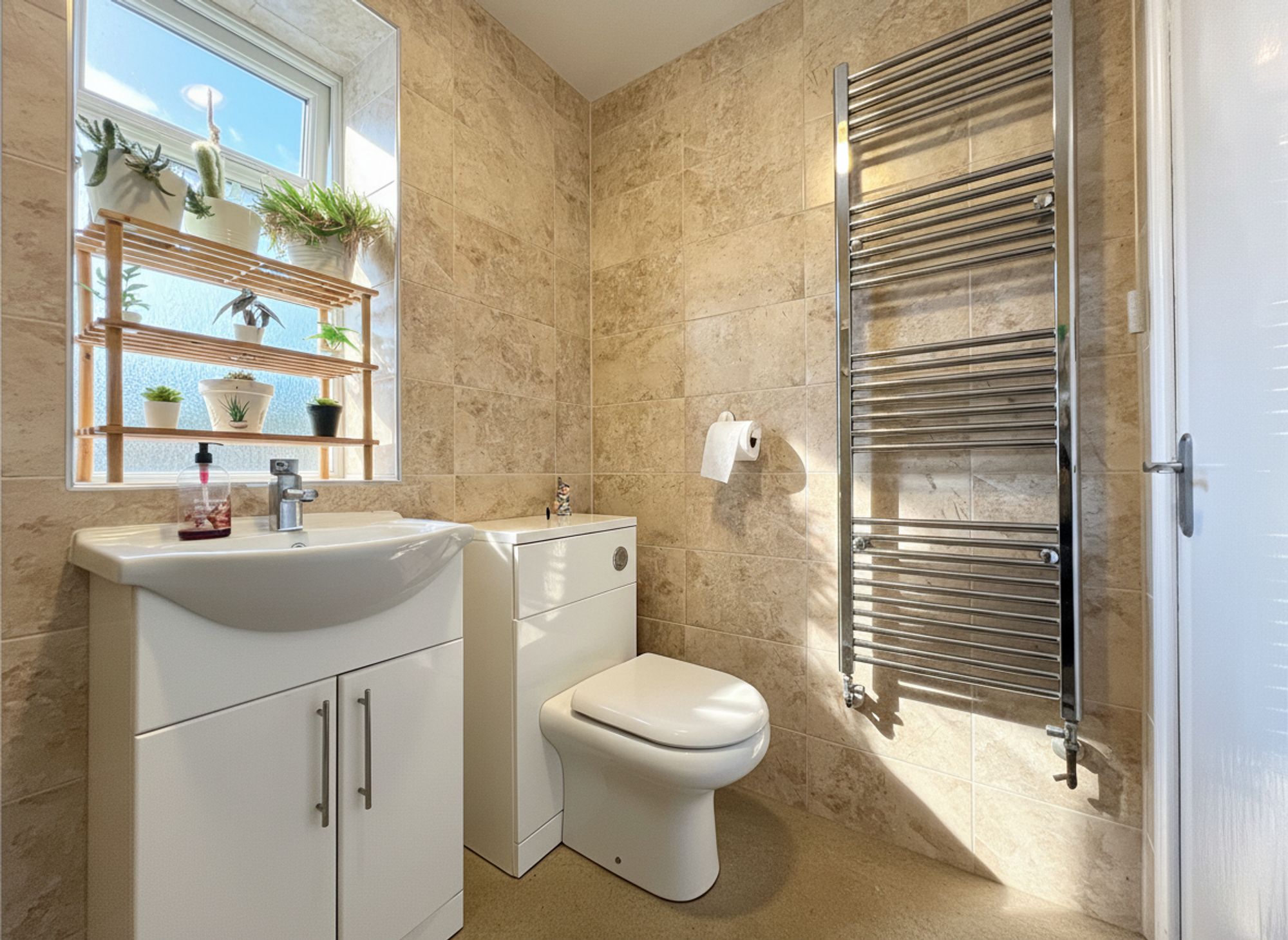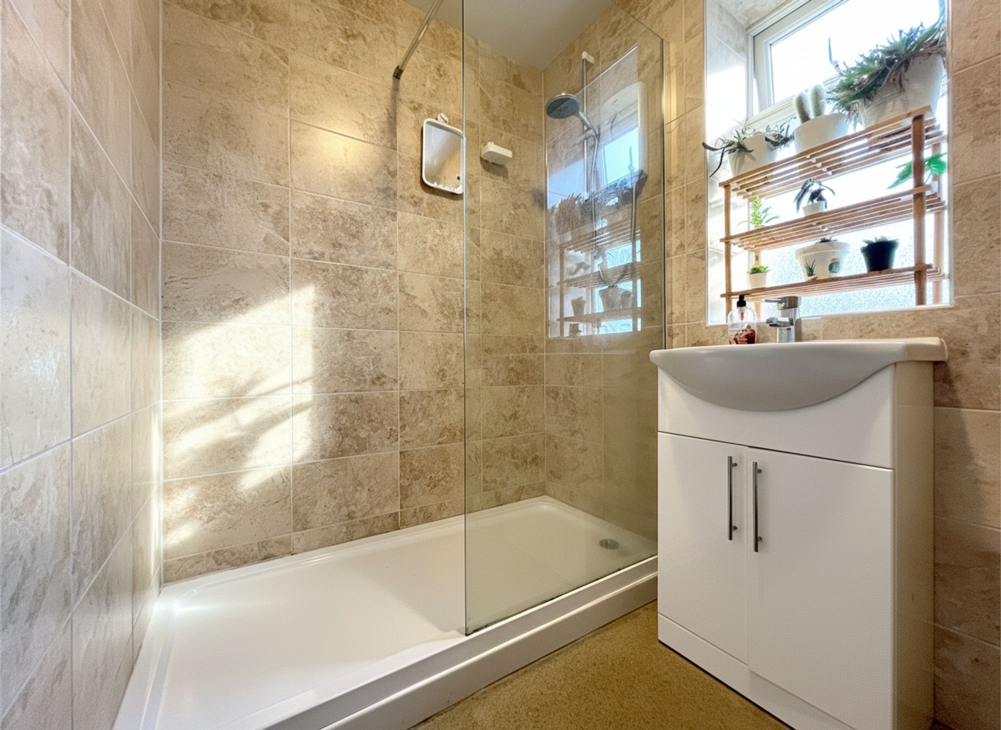 Located on the ground floor for ease of access, the shower room is designed with practicality in mind. It includes a wash basin set within a vanity unit providing useful storage, a walk-in shower cubicle with electric shower and glass screen, WC and a chrome heated towel rail. Fully tiled in neutral tones with lino flooring, it offers a low-maintenance and functional space, ideal for everyday use.