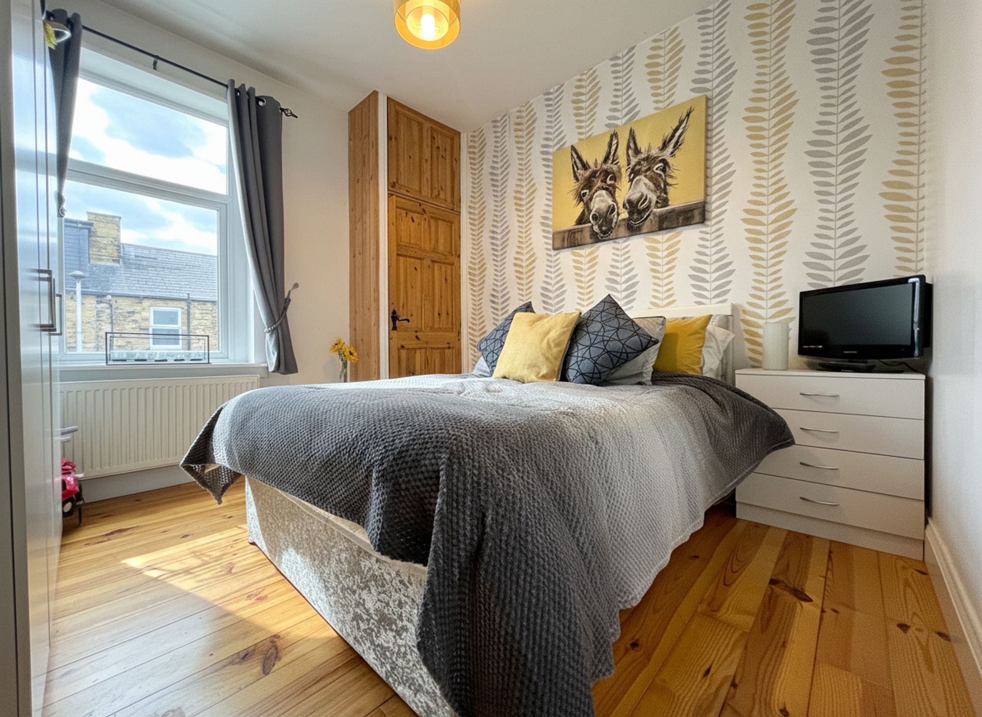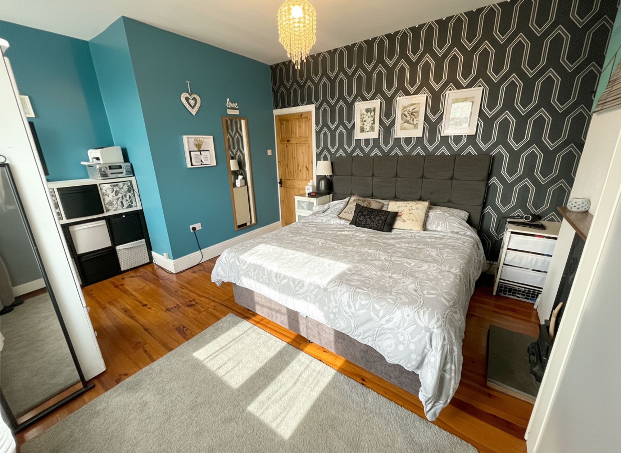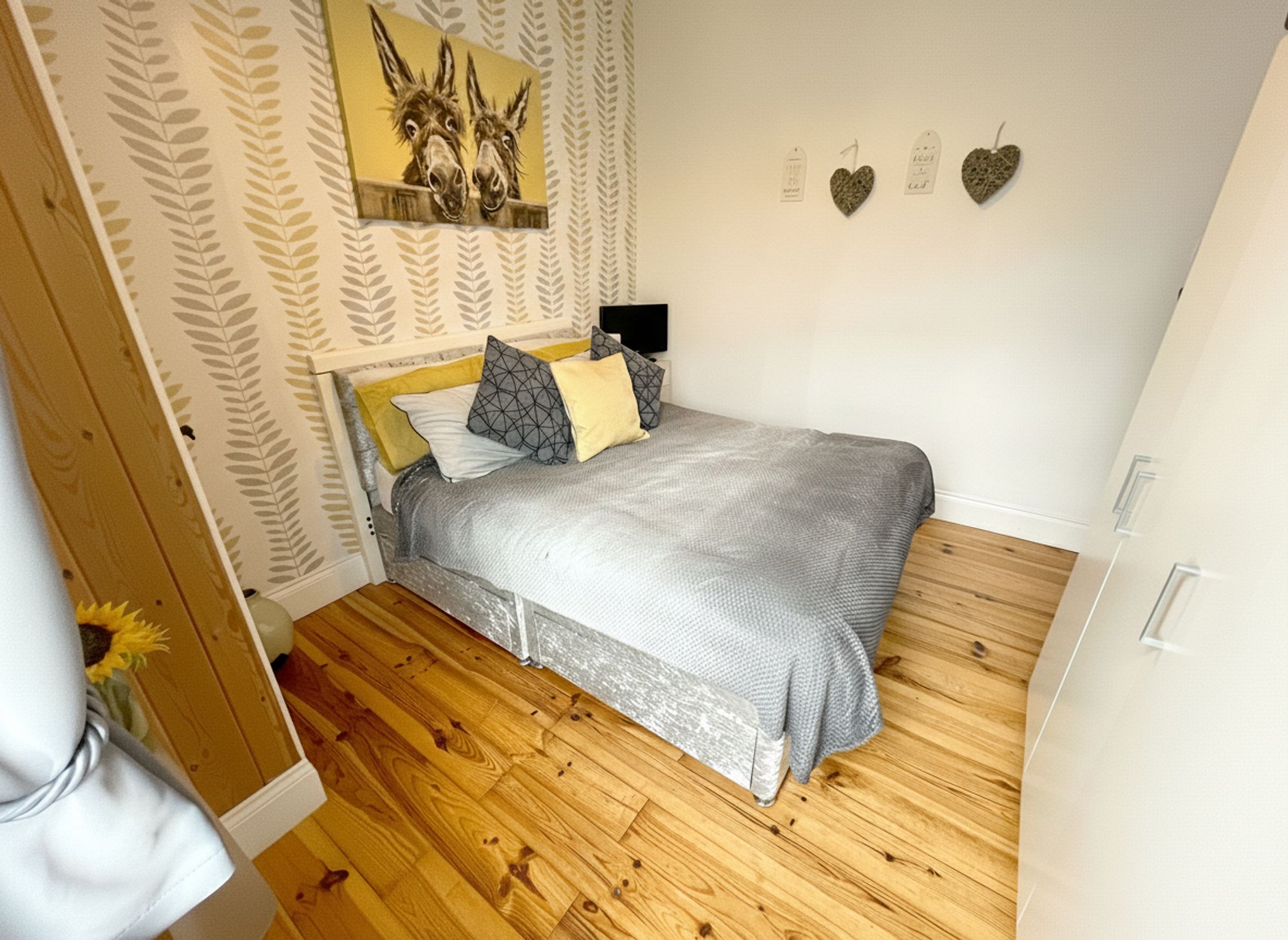 A generously sized double bedroom, beautifully styled to blend comfort and character. Having ample room for a variety of free-standing furniture, the bedroom also features a built-in storage cupboard that offers practicality and discreetly houses the combi boiler.