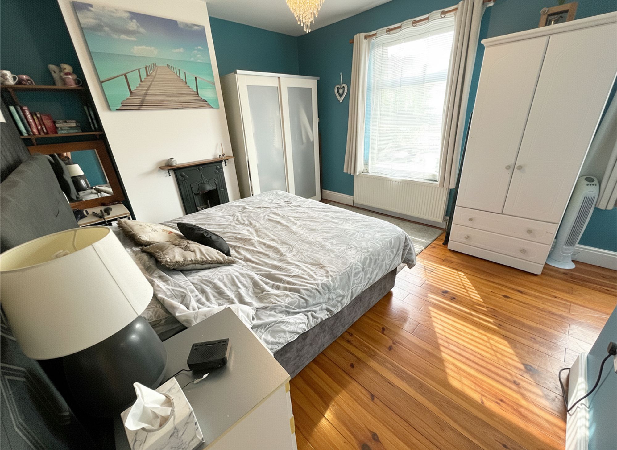 A spacious super king-size bedroom, full of character, featuring an ornate Victorian working fireplace as a striking focal point. Two double-glazed windows offer delightful views over the large garden and beyond, while a central heating radiator ensures year-round comfort. The room provides ample space for freestanding furniture, making it both practical and elegant.