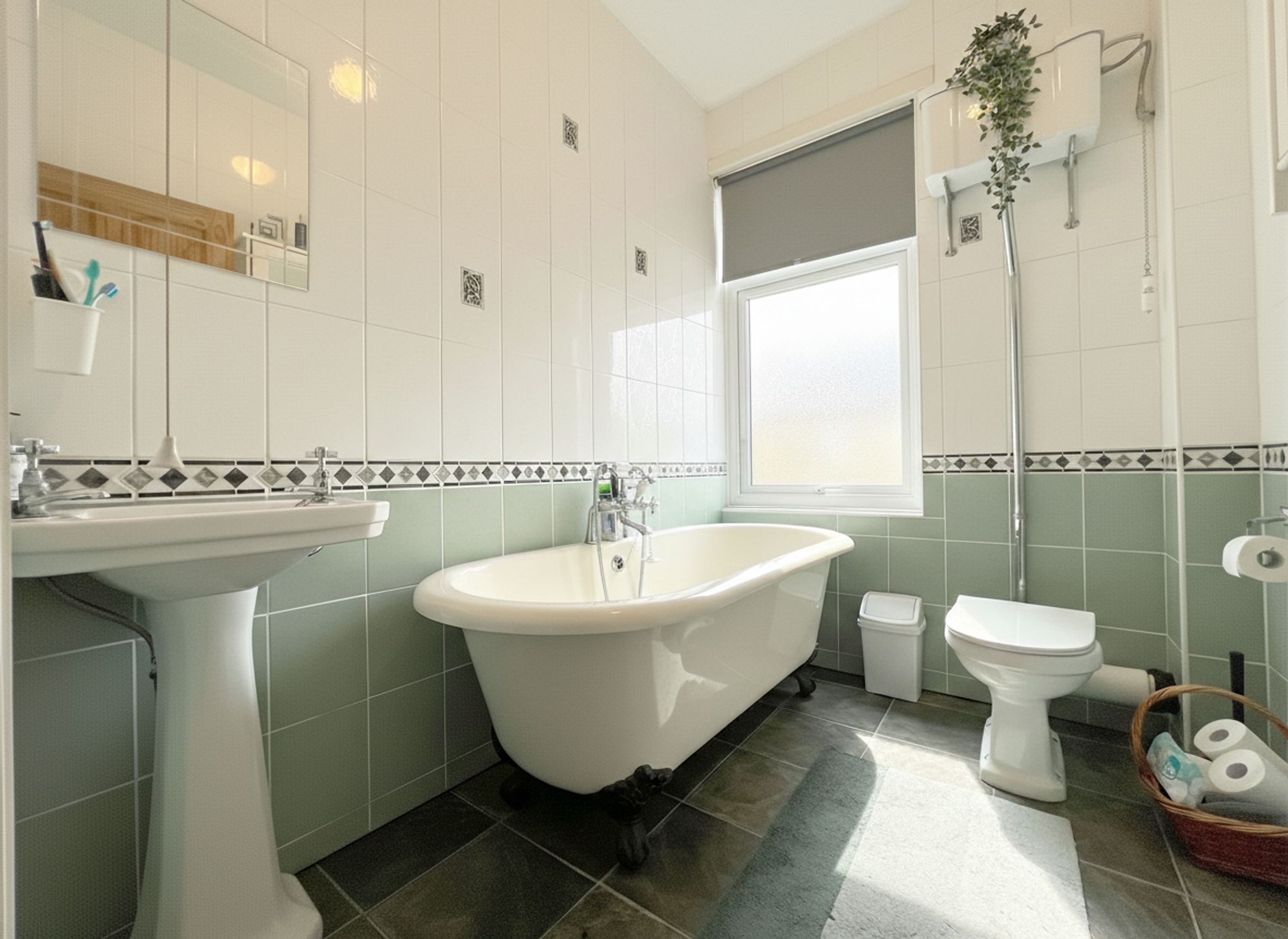 Stairs lead upstairs to a beautifully styled bathroom that combines elegance with period charm. The suite features a freestanding claw-foot roll-top bath complete with a shower attachment, the perfect place to unwind. A matching wash basin is accompanied by a high-level toilet cistern, while a fitted bathroom cabinet provides useful storage. Fully tiled walls with an attractive border add refinement and timeless appeal, and a central heating radiator ensures comfort year-round.