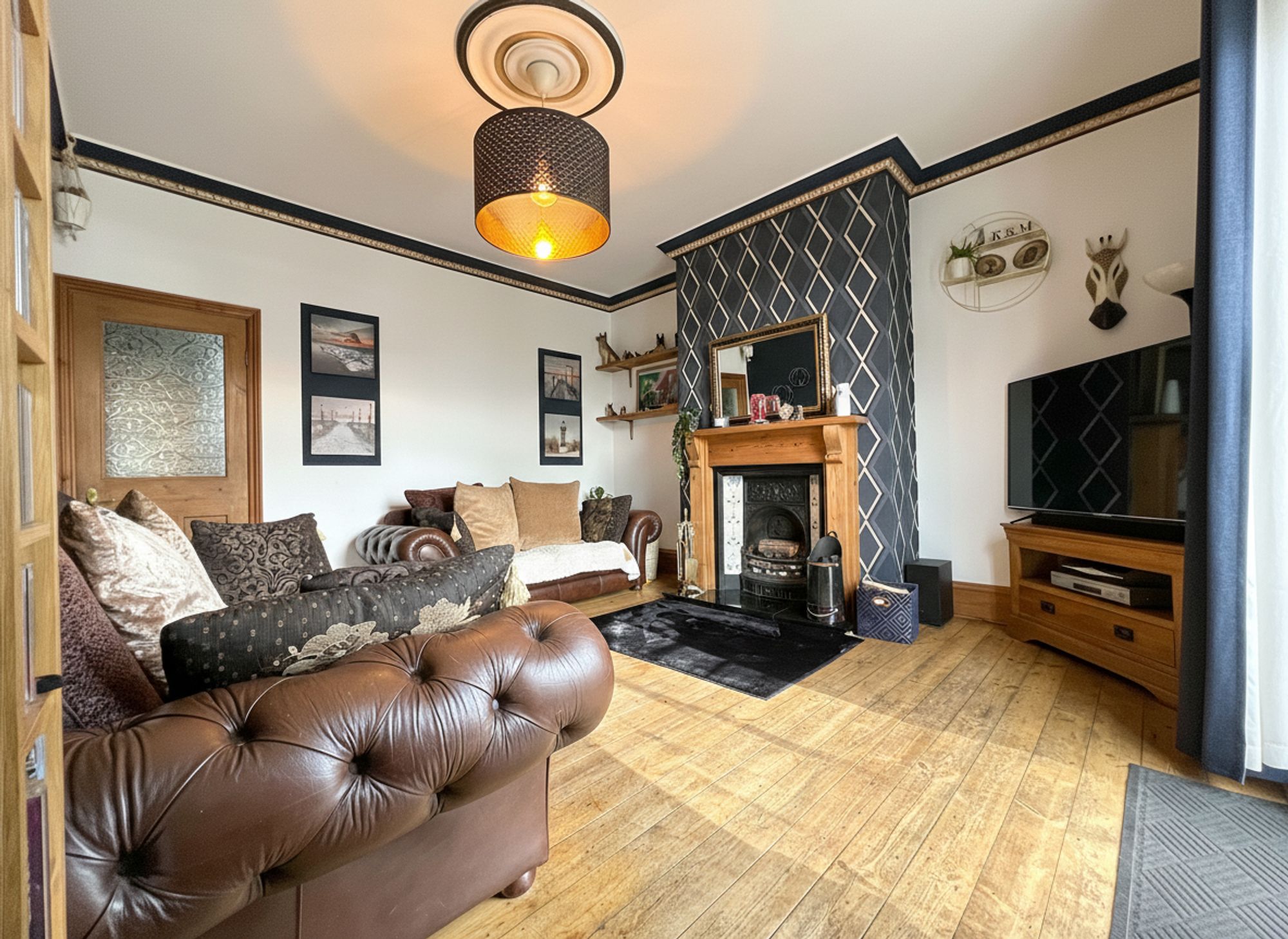 A beautifully presented lounge that exudes character and charm, centred around a stunning coal fire set within an ornate Victorian surround, a true focal point of warmth and elegance. In addition, a large radiator provides further warmth, ensuring the room remains inviting throughout the seasons. Rustic exposed floorboards lend timeless appeal, while plaster coving and a decorative ceiling rose enhance the room’s period detail. Bathed in natural light, French doors gracefully open to the stunning garden, creating a seamless flow between indoor comfort and outdoor beauty.