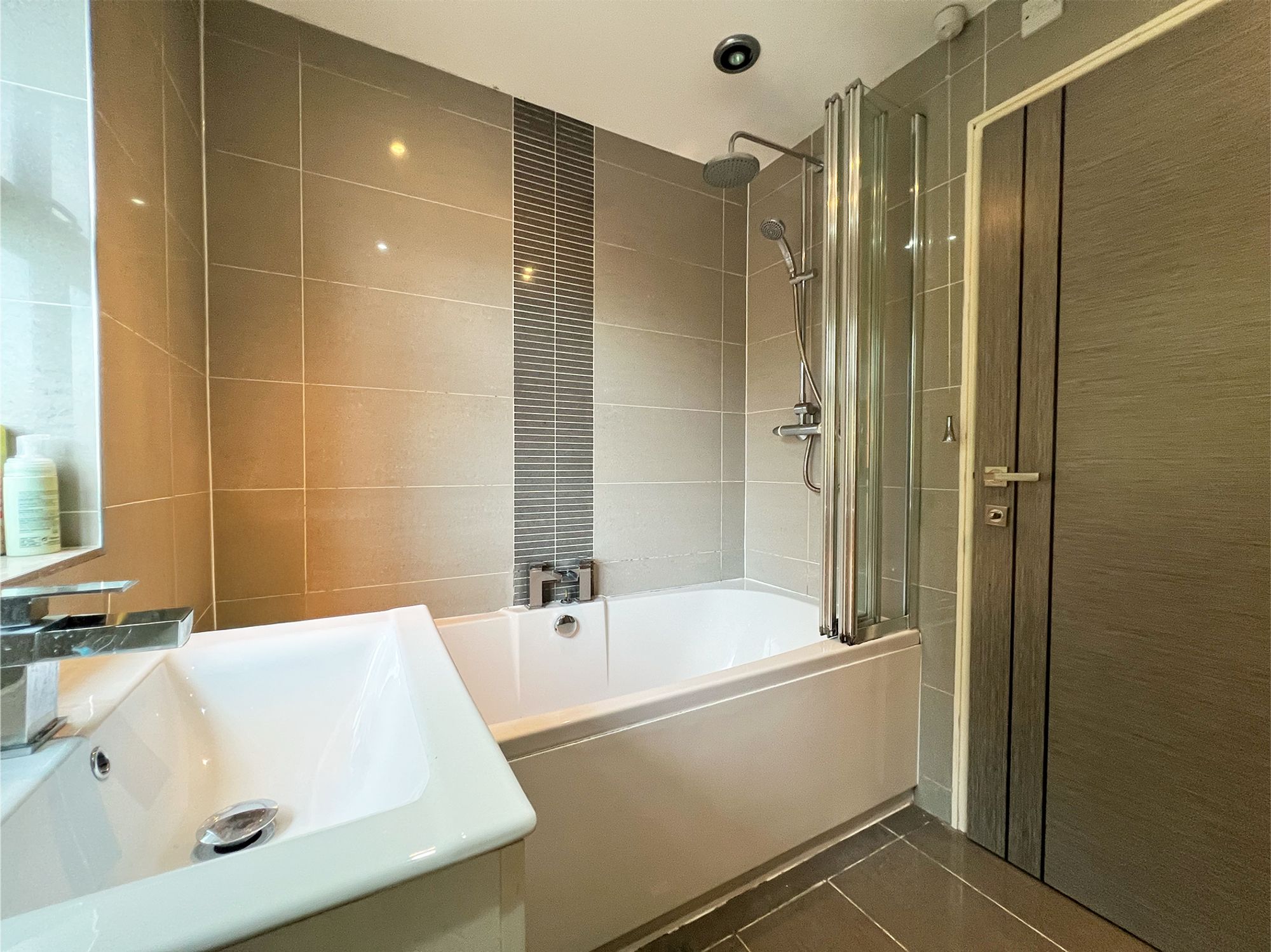 The house bathroom is styled in contemporary tones, offering a calming and elegant space to unwind. It features a full-size bath with shower over, complemented by a separate shower attachment and a sleek folding glass screen. The wash basin is set within a modern vanity unit alongside a WC and chrome heated towel rail. Both the walls and floor are fully tiled, with an attractive border accentuating the shower area, combining practicality with modern sophistication.