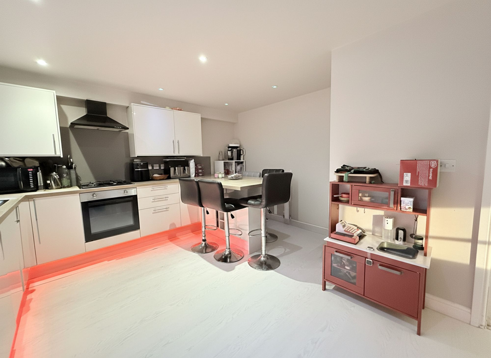 Located to the rear of the property and enjoying views over the rear garden, this spacious and modern kitchen diner benefits from dual-aspect windows, creating a bright and airy feel throughout. The kitchen is fitted with sleek, contemporary units complemented by wood-effect worktops and matching wood-effect linoleum flooring. Appliances include a chrome sink with mixer tap, electric oven and four-ring gas hob. A built-in family breakfast bar provides an ideal space for casual dining, while under-counter LED lighting adds a stylish finishing touch. The boiler is neatly concealed within the units for ease of maintenance. Convenient access to the garden makes this an excellent space for indoor-outdoor living and entertaining.
