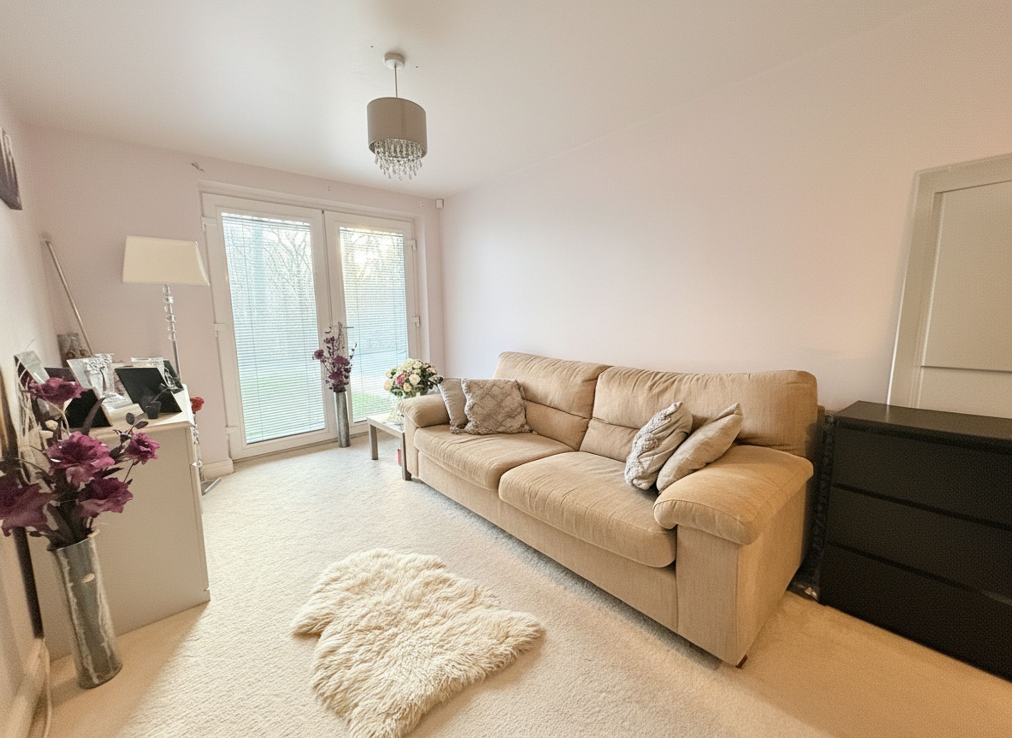 Located on the first floor to the front of the property, this spacious living room benefits from dual-aspect windows, allowing plenty of natural light to flood the room throughout the day. Finished in soft, neutral tones with a stylish wallpapered accent wall, the room is further enhanced by wood-effect linoleum flooring. Generously proportioned, it offers ample space for a variety of seating arrangements, making it an ideal setting for both relaxing and entertaining, while also providing access to the kitchen and the second floor of the property.
