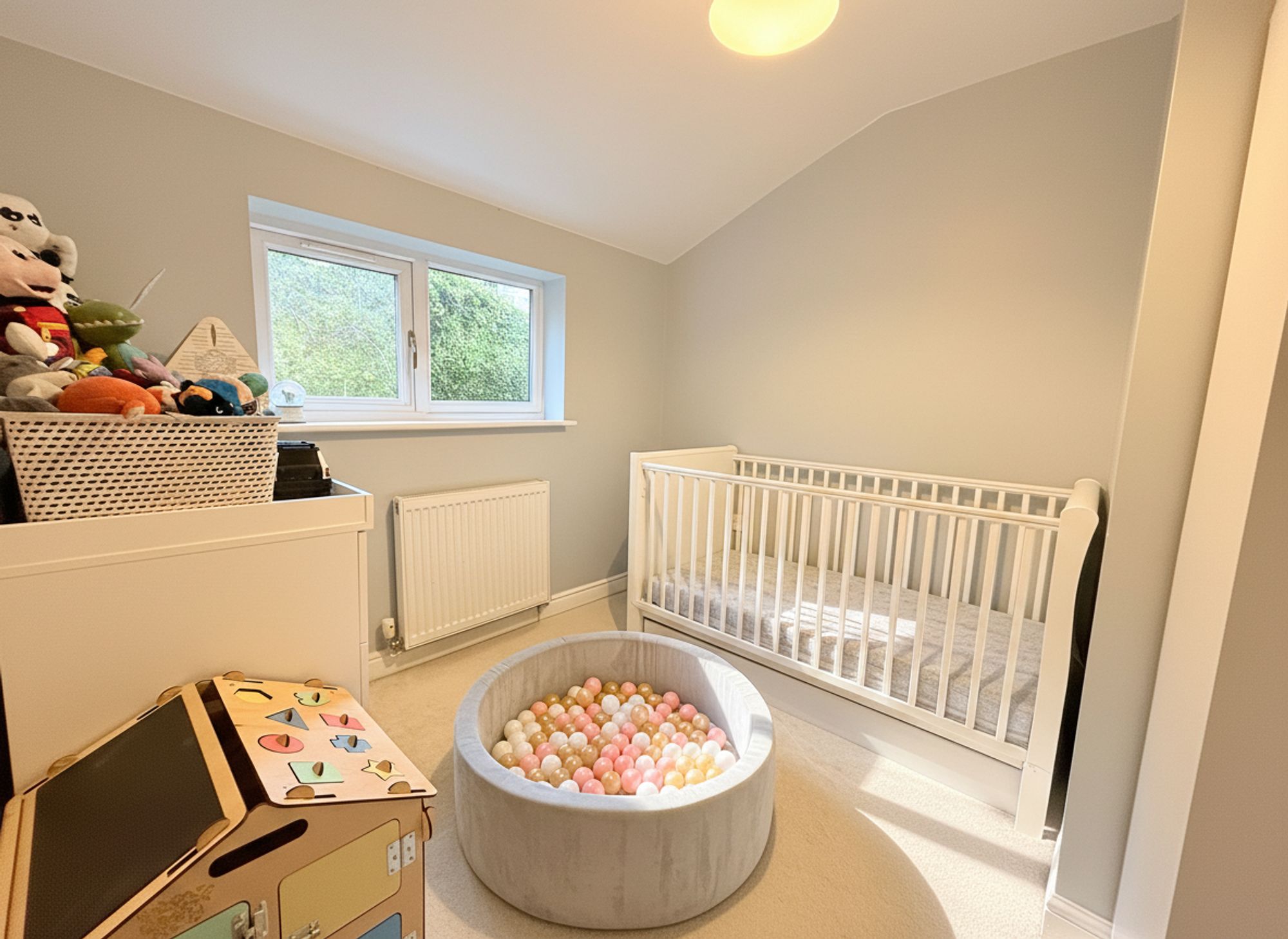 Located on the second floor to the front of the property, this spacious double bedroom benefits from a Juliette-style balcony, offering lovely views over the surrounding woodland. The room is neutrally decorated with a tasteful wallpapered accent wall, creating a calm and inviting atmosphere. Further benefits include private access to a well-appointed en-suite, making this an ideal principal bedroom.