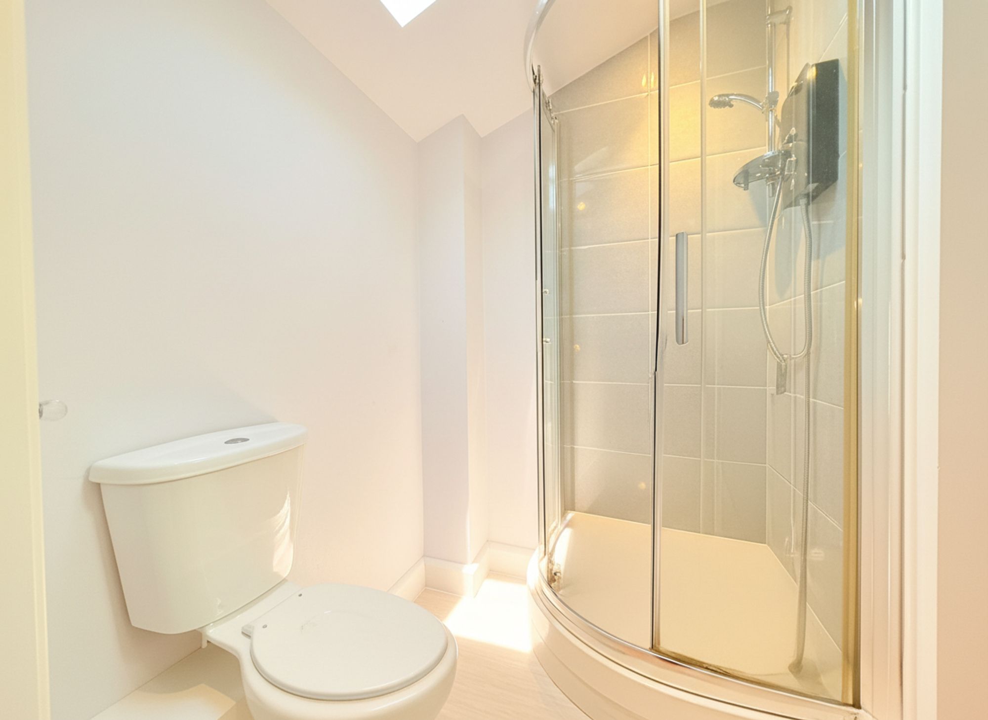 The en-suite is fitted with a WC, vanity wash hand basin with storage below and an electric shower. Finished in neutral tiling and complemented by wood-effect linoleum flooring. A Velux skylight window allows natural light to fill the room, enhancing the bright and airy feel.