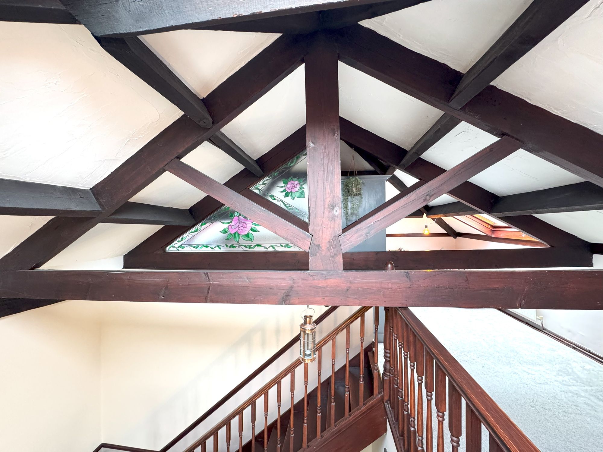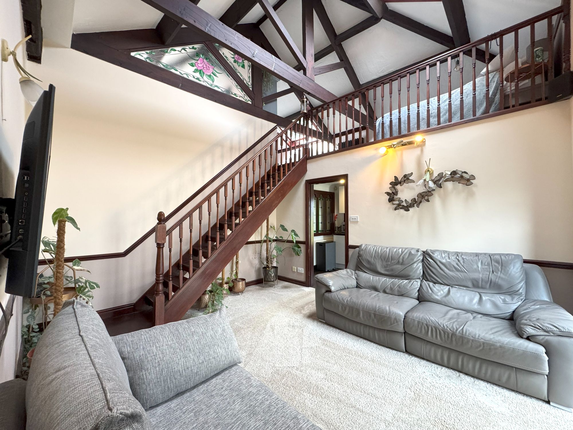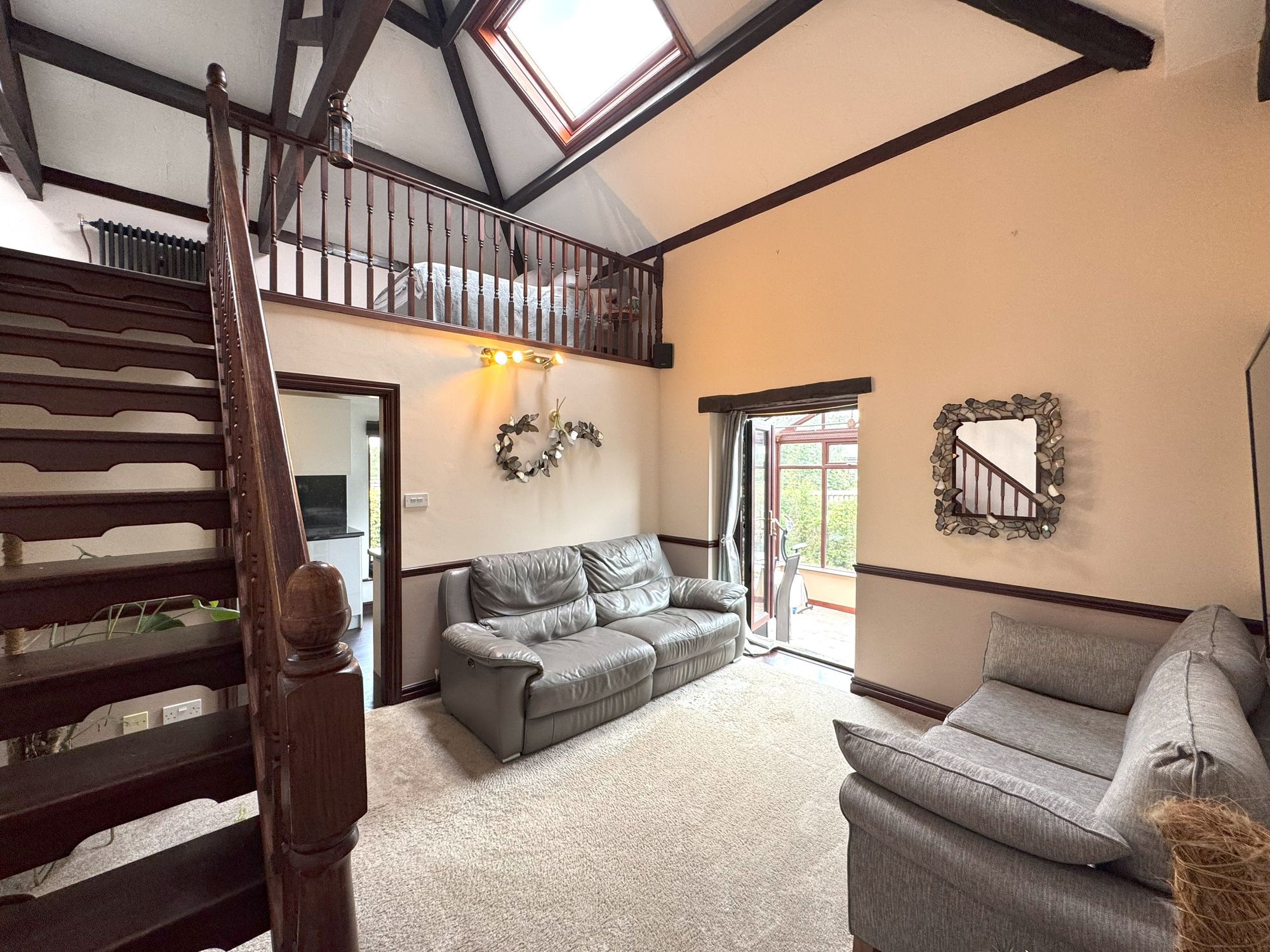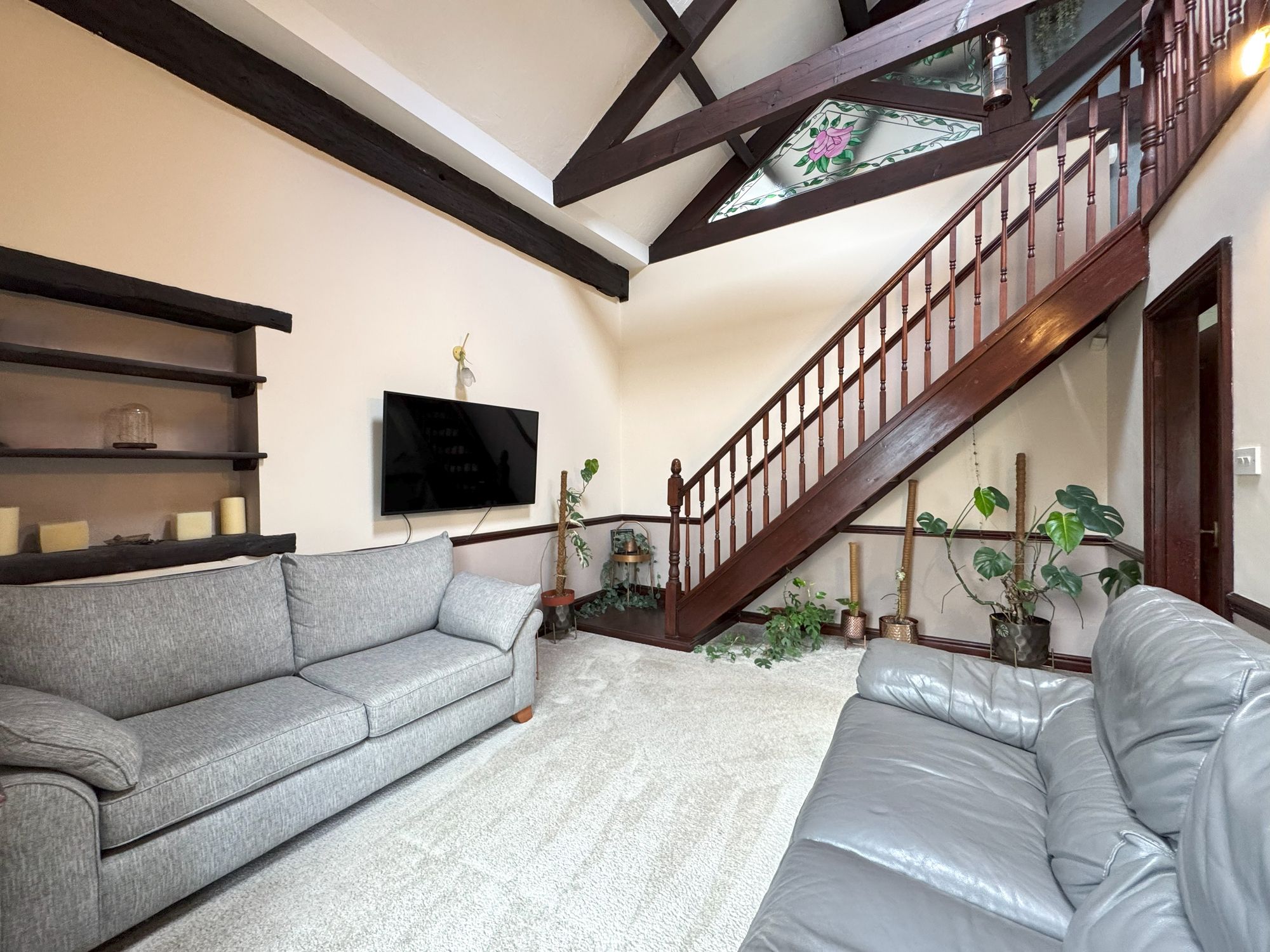This inviting lounge boasts a striking high ceiling with exposed timber beams, enhanced by decorative stained-glass for a touch of charm and individuality. A beautiful open staircase leads to a mezzanine level, creating a sense of space and light while adding architectural interest. The room is well-proportioned and features neutral decor with carpet underfoot. The abundance of natural light makes the space feel bright and welcoming, perfect for both relaxing and entertaining. This lounge combines character and comfort seamlessly, with direct access through to the kitchen area and conservatory for modern living.