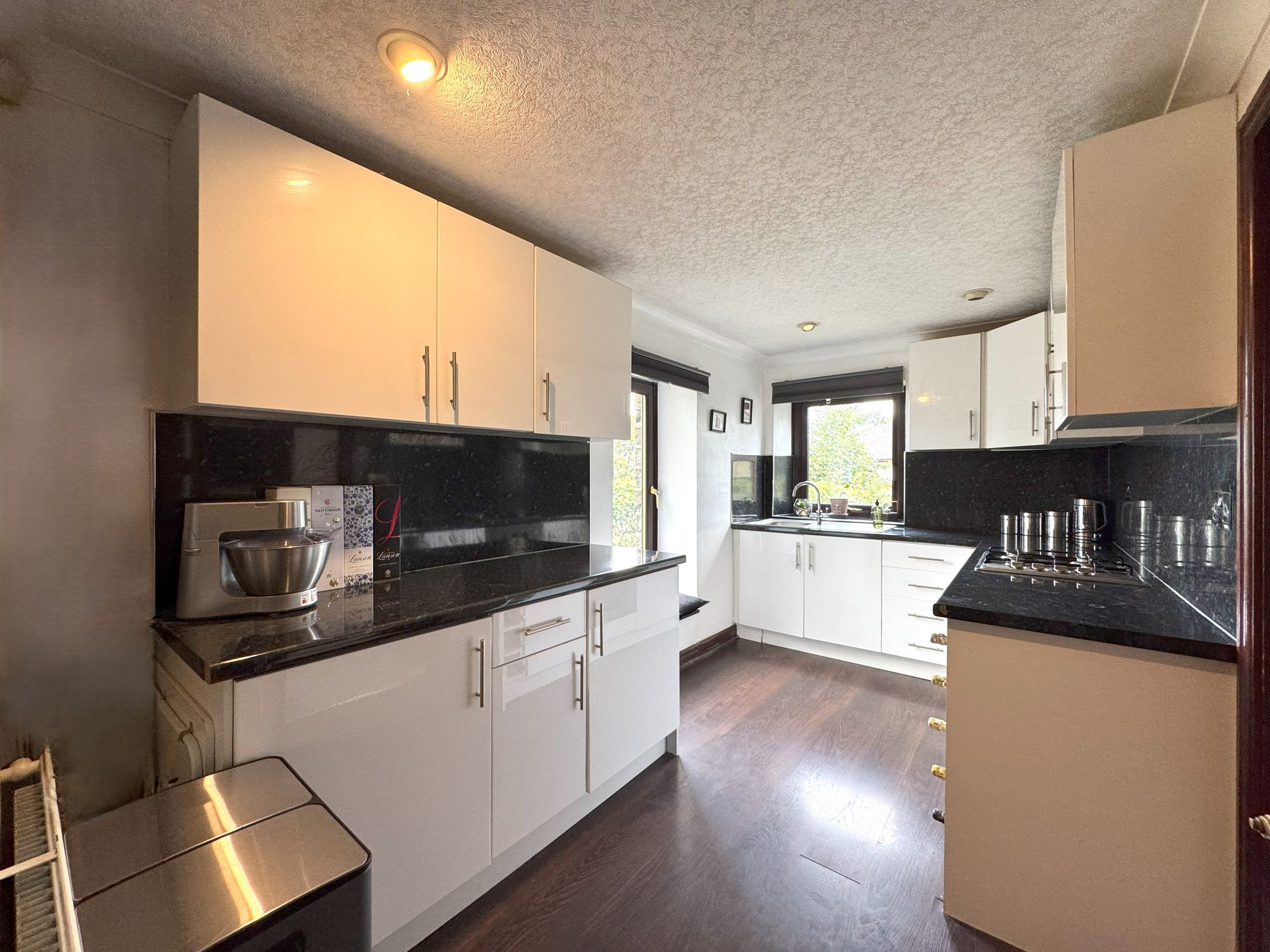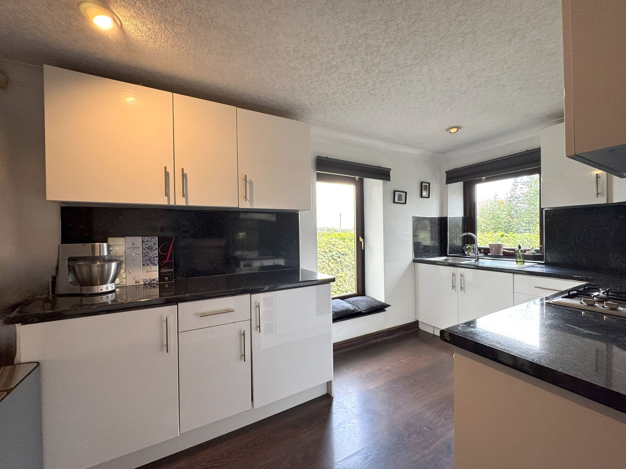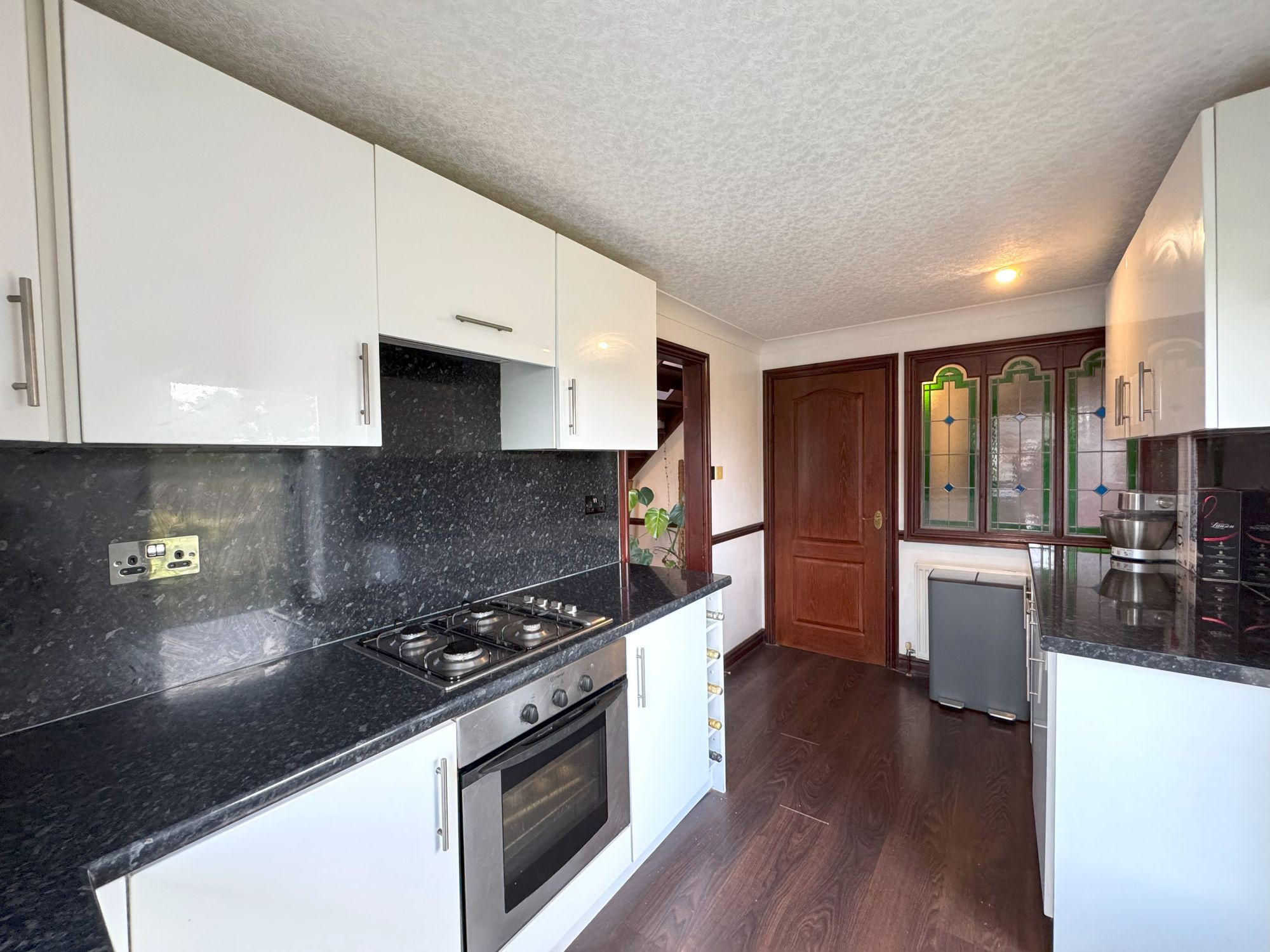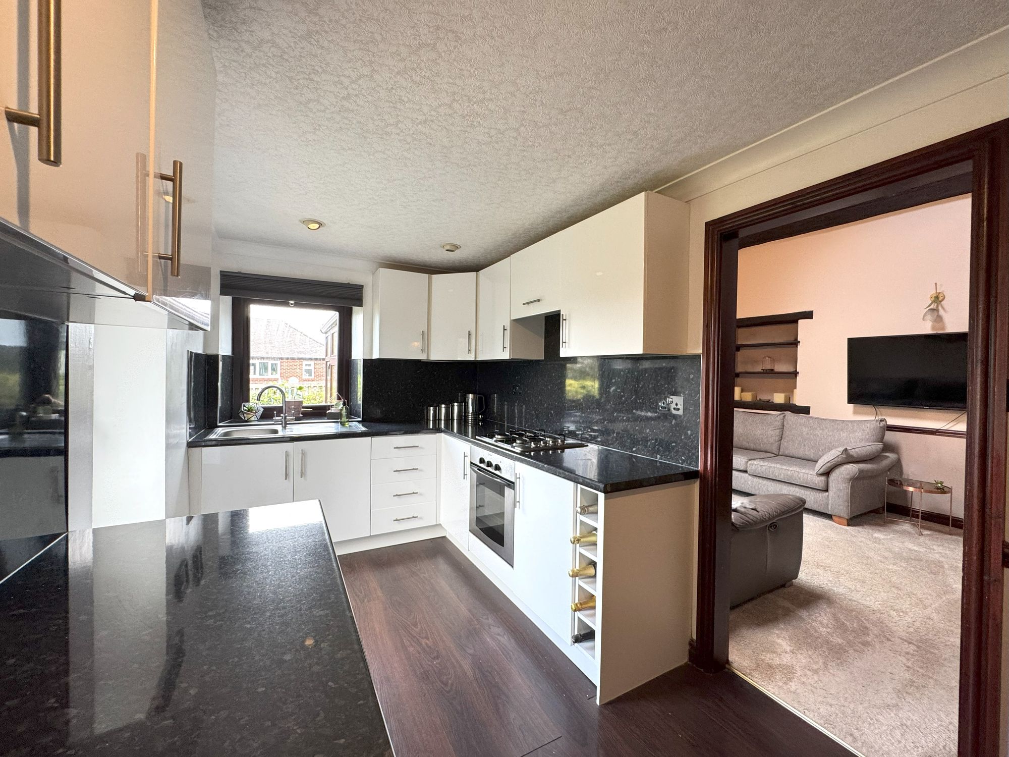 This contemporary kitchen blends style and practicality, featuring sleek white gloss cabinets with polished black granite-effect worktops for a modern finish. Natural light floods the space, with a large window offering garden views and a bright, welcoming feel. There is ample worktop space and generous storage across base and wall-mounted units. A gas hob and built-in electric oven provide efficient cooking, while integrated under-counter fridge and freezer units keep the design seamless. Dark wood-style flooring contrasts beautifully with the cabinetry while a built-in wine rack adds a touch of character. The kitchen connects directly to the main living space, making it ideal for everyday family use and entertaining.